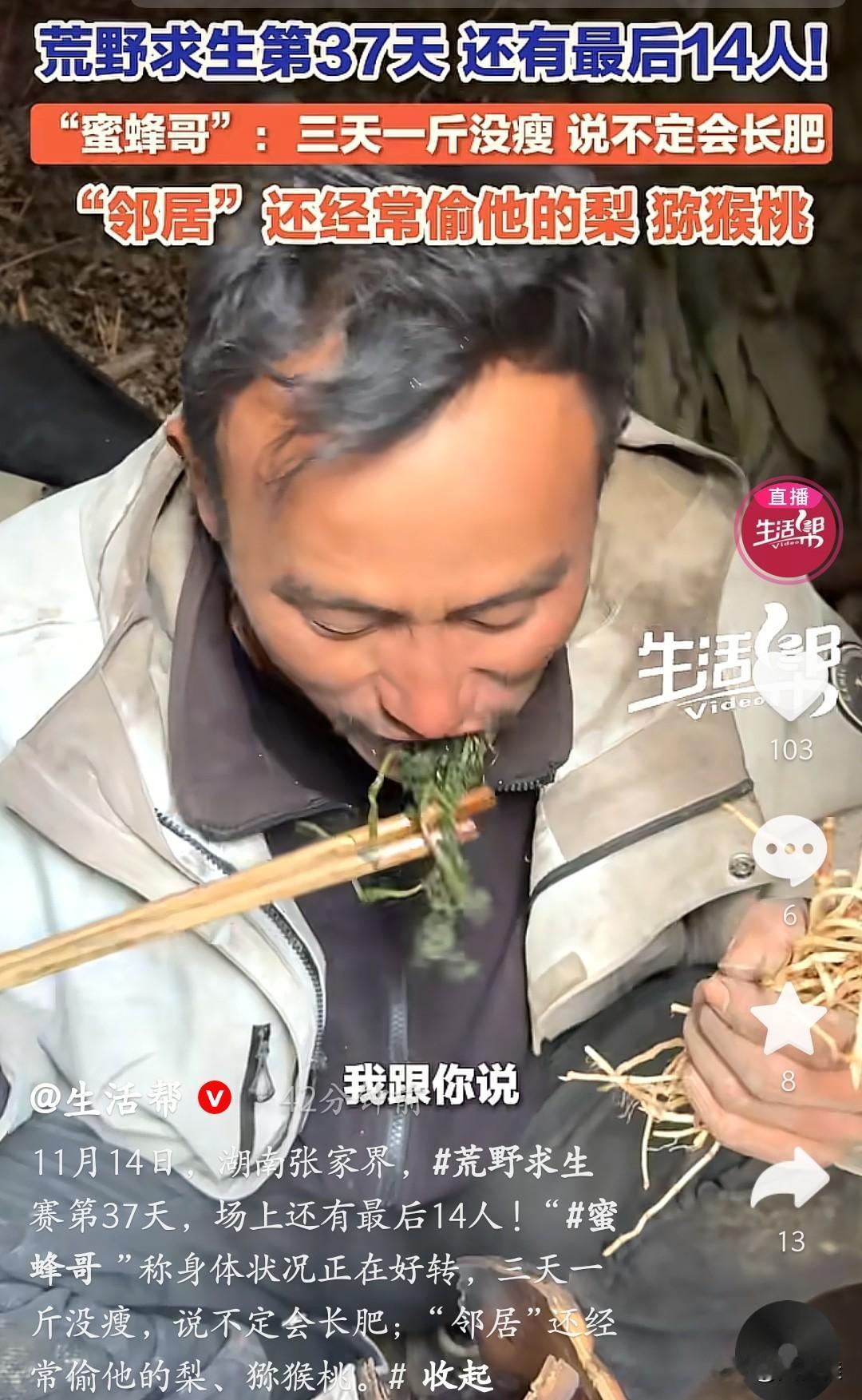 荒野求生,居然还有人三天一点都没瘦!荒野求生第37天还剩14人,“蜜蜂哥”居然越活越滋润。三天一斤没瘦,还放话“说不定会长肥”! 别人饿到啃野菜,他倒好,不仅能搞到肉吃,还囤了梨和猕猴桃,就是“邻居”总偷他的宝贝果子,把他气得直念叨。 热门选手“冷美人”刚退赛,剩下的人里属他状态最横,别人愁吃喝,他愁“存货被偷”,这求生画风简直是荒野版“农家乐”!