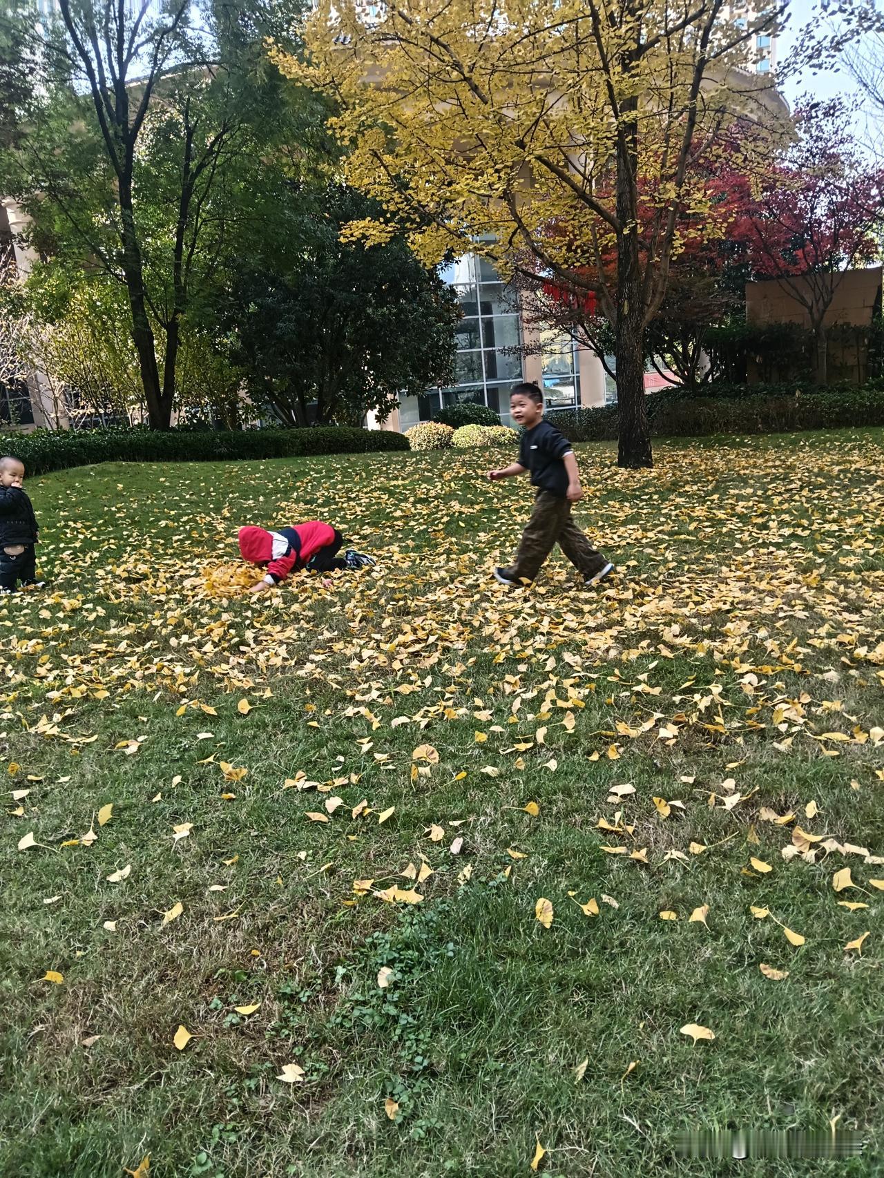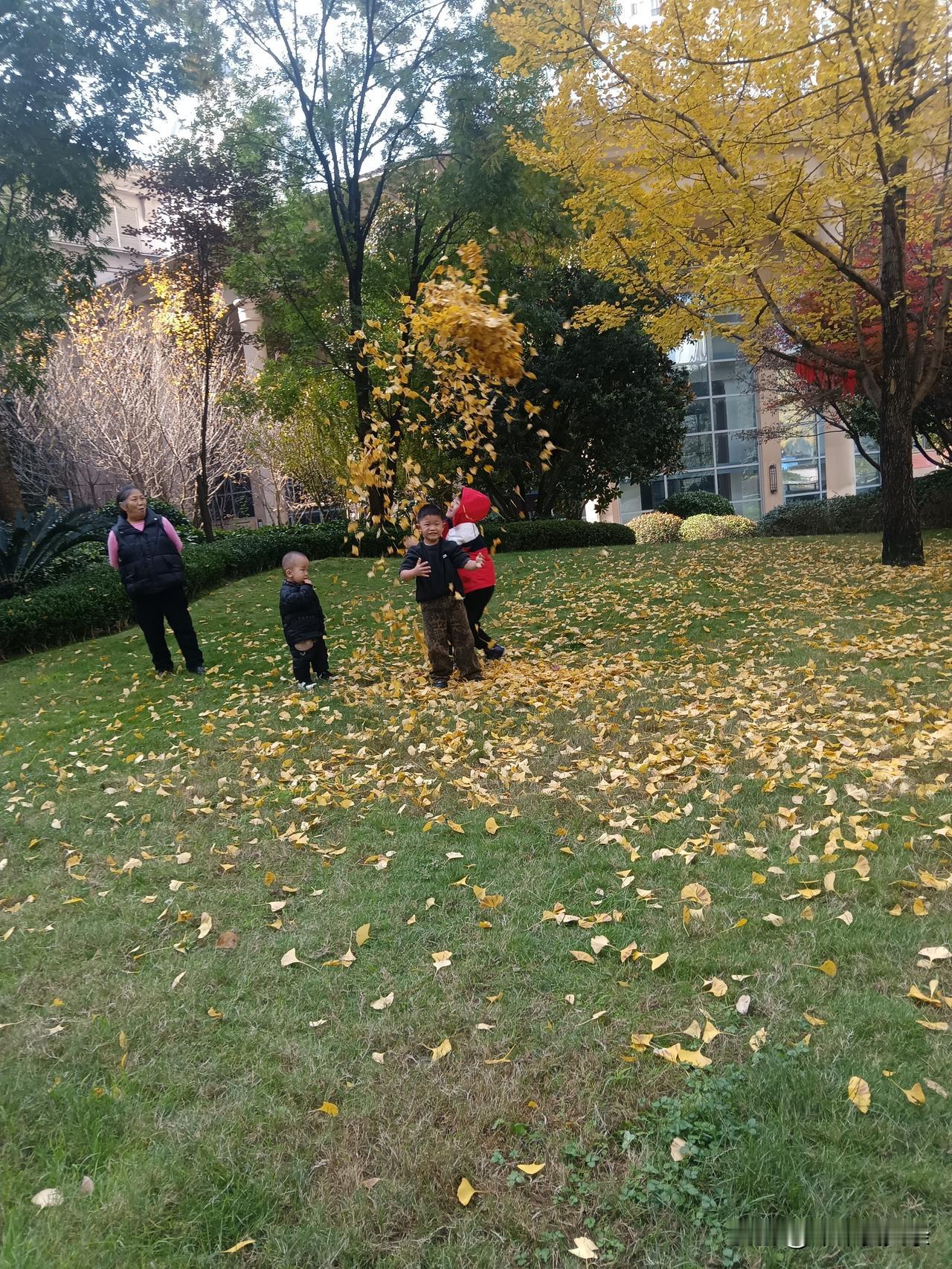 在这冬日暖阳的时光里,在金黄色银杏叶的陪伴下,小孩们玩得不亦乐乎的,又笑又跳,小