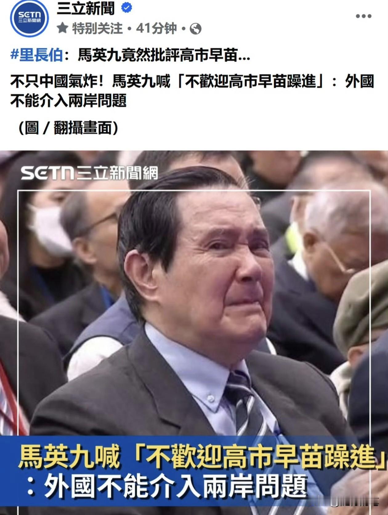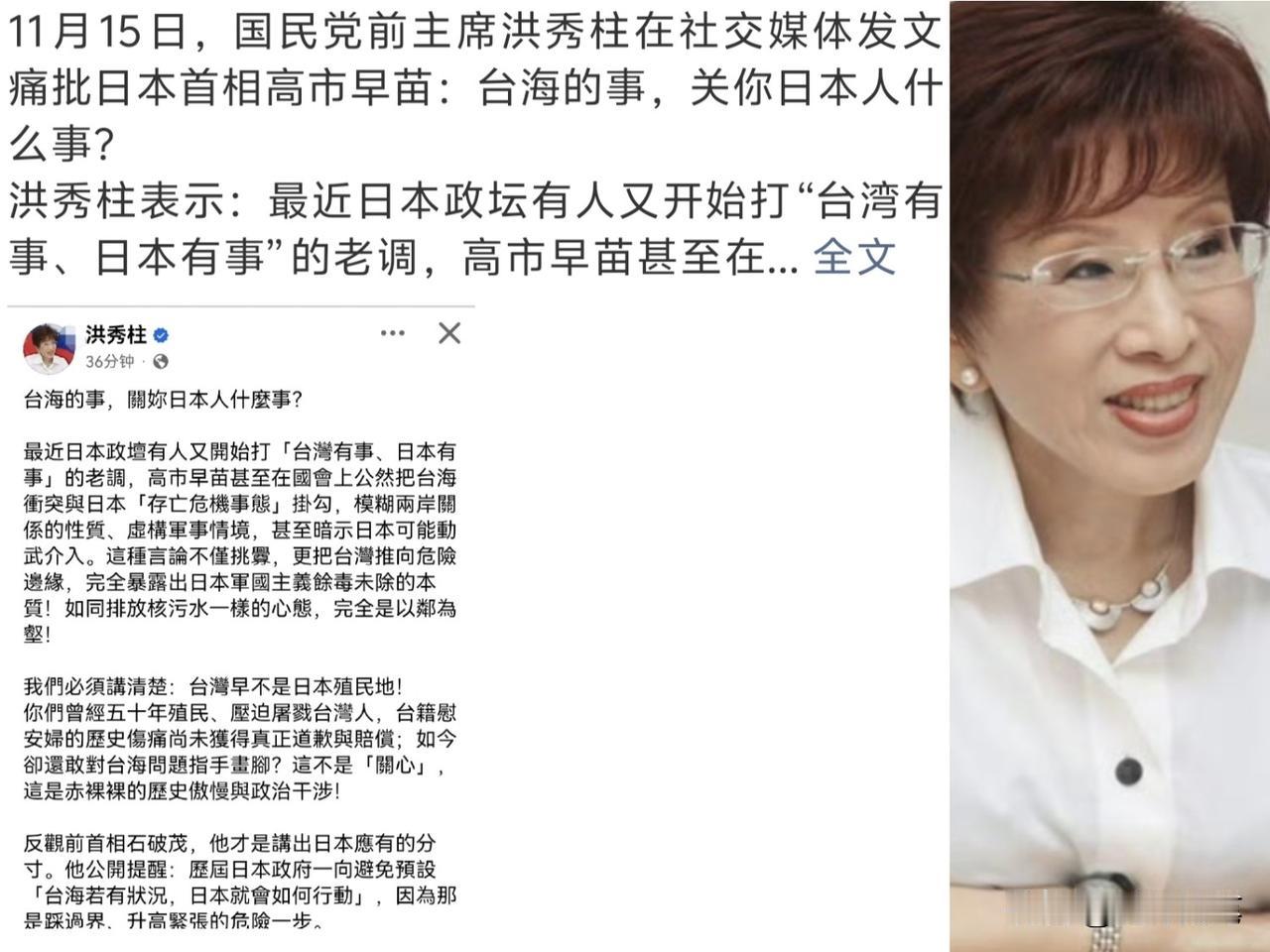 关于高市早苗的言论,岛内马英九与洪秀柱终于发声反对了。 俩人均发表长文抨击高市早苗,这对国民党来说也是一件好事。 两岸的事情就与两岸有关,高市早苗插一脚进来,如果只有大陆反对,而岛内这些人沉默,难免让人对岛内这些政客有纵容高市早苗的猜疑,民进党政客与日本政客同流合污不敢发声,而国民党作为两岸同属一中的政党代表,如果也默不作声那就令人失望了,幸好马英九与洪秀柱还尚有中国人的志气,敢于发声反对高市早苗干涉我国内政的言论,让人还愿意觉得国民党内部还是有民族气节的人在,而不是沦为与民进党政客一样,没有民族大义的政党。