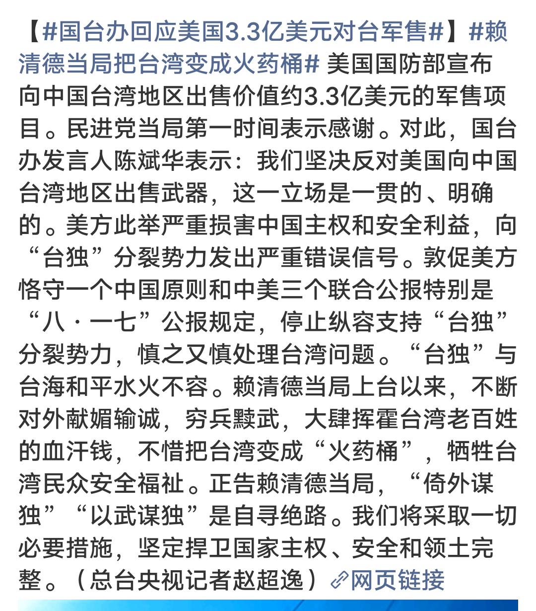 ★:美国打台湾牌就是为了诈骗台湾人民的血汗钱,但是民进党当局确执迷不悟,高价买来的装备依然改变不了台湾省目前的的命运,面对我军的强大能力,倚美谋独死路一条,将来也是炮灰的命!★:台湾的出路在统一,背靠大陆的才有未来!