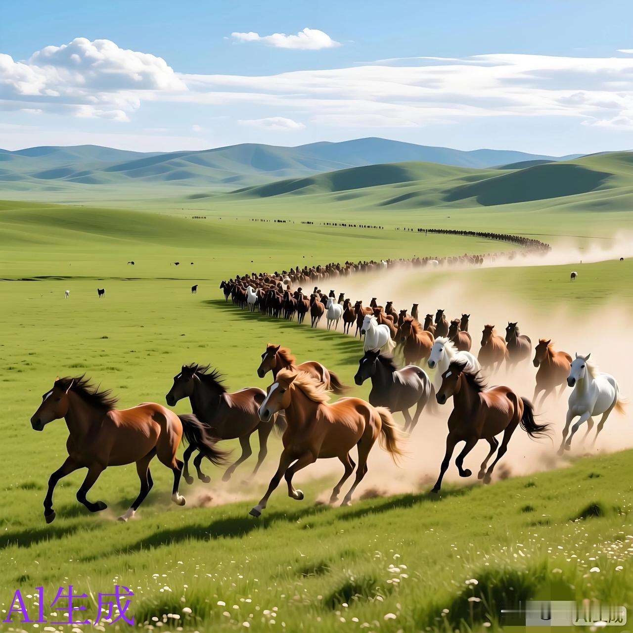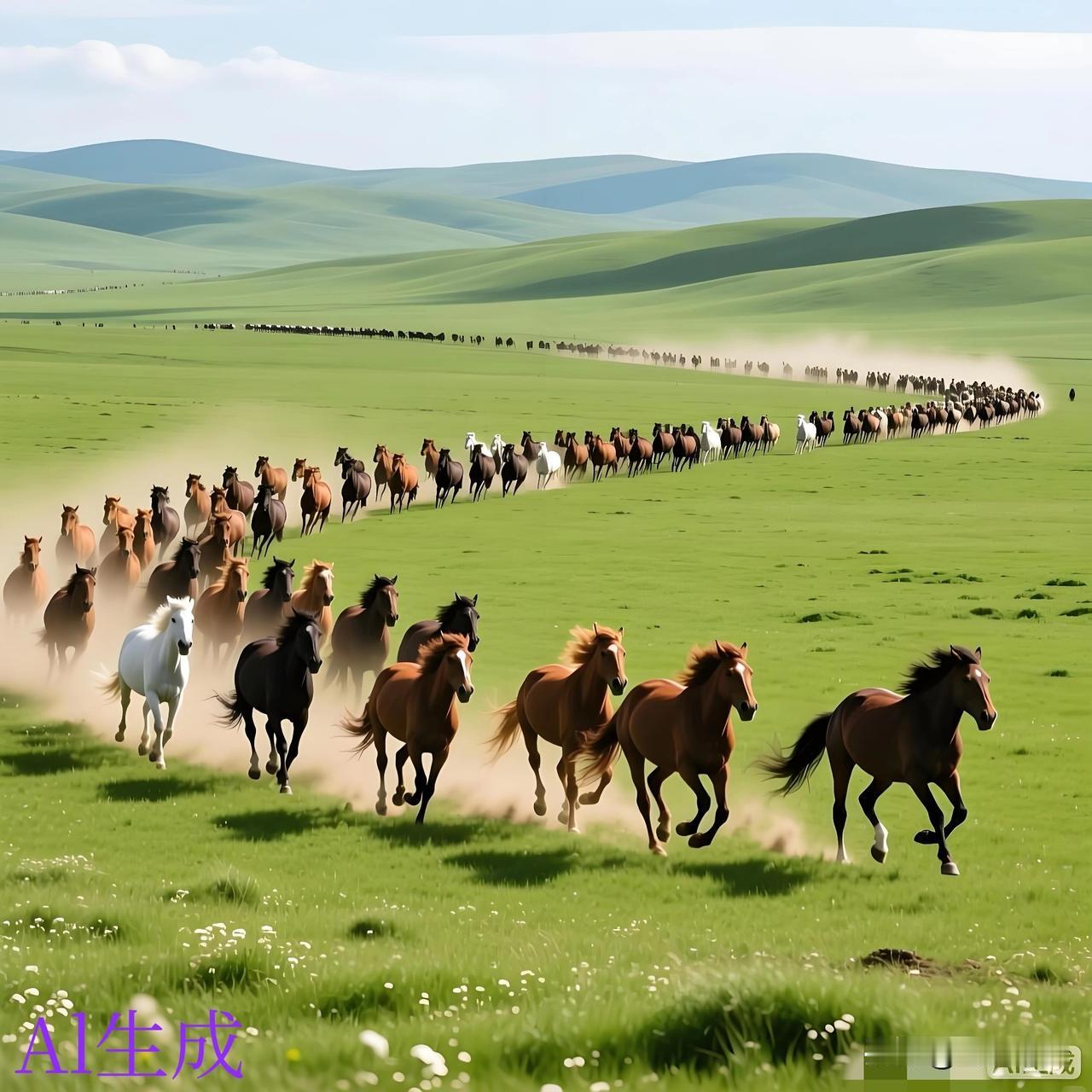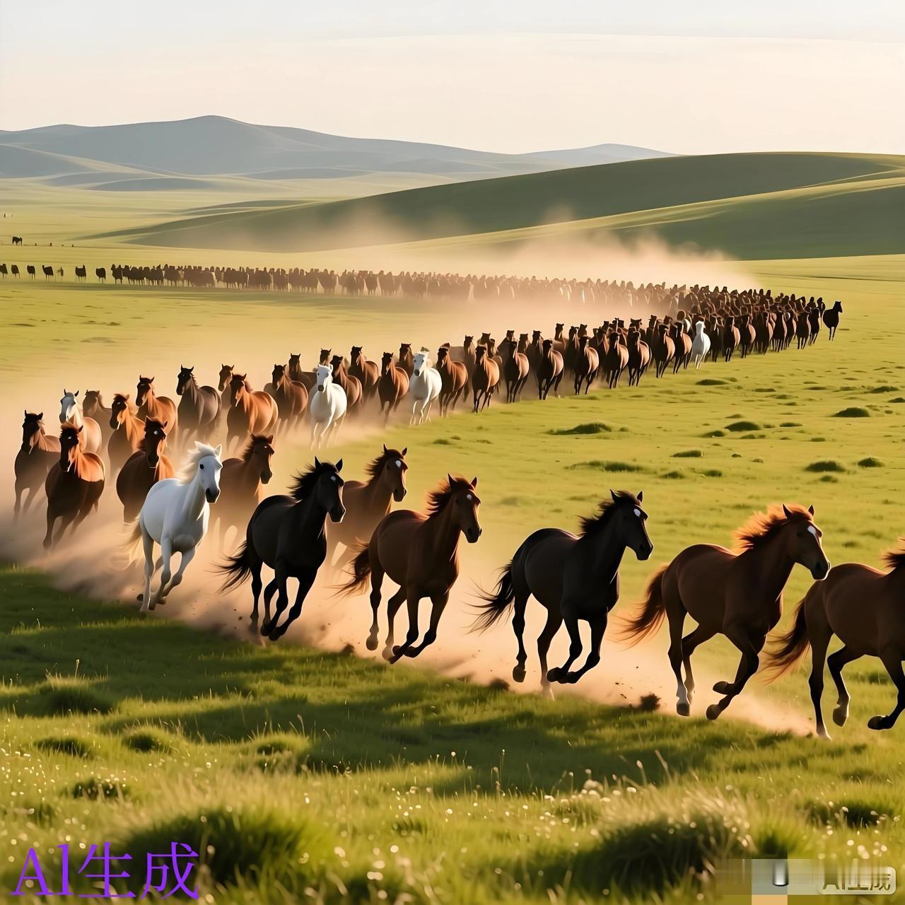 这万马奔腾的场景真是壮观 一条长长的马队井然有序向前奔跑。 如狂风扫过草原,奔腾而来。 鬃毛飞扬、马蹄声隆! 姿态豪迈、自由奔跑、无畏无惧。 如潮涌般壮观,让人心生敬畏又感怀生命。 这不慌不乱的队伍不得不让人夸赞一句:马儿真乖!