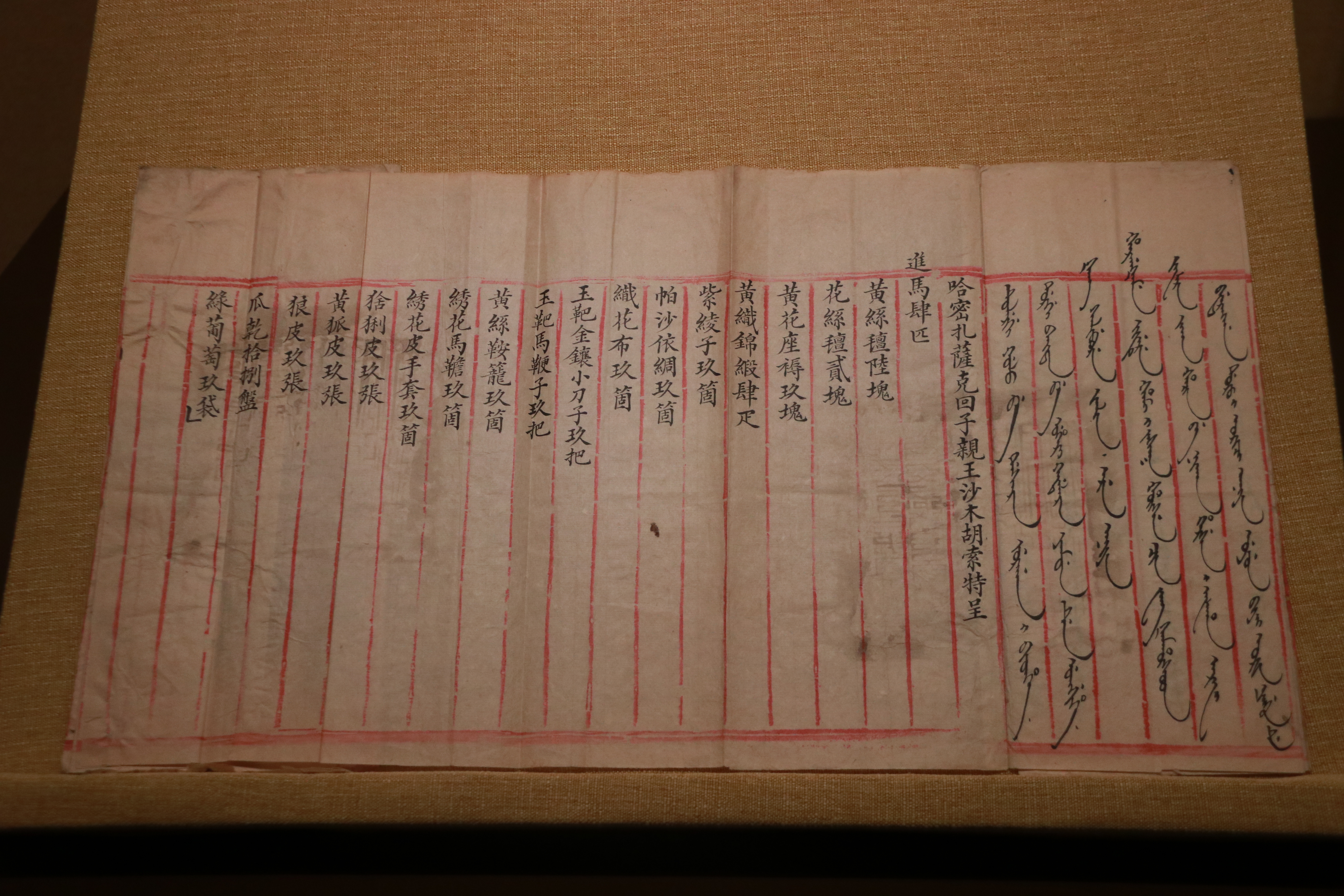 哈密、阿克苏回部王公进单清光绪二十年(1895年) 一史馆藏乾隆朝统一新疆后,确立回部王公年班朝觐制度,规定其朝觐班次、抵京期限、随队人员及行李等,新疆建省后继续执行。此为哈密亲王、阿克苏郡王贡物清单,其中包括丝绸在内的各色新疆特产,其中有瓜干十八盘,绿葡萄九袋。