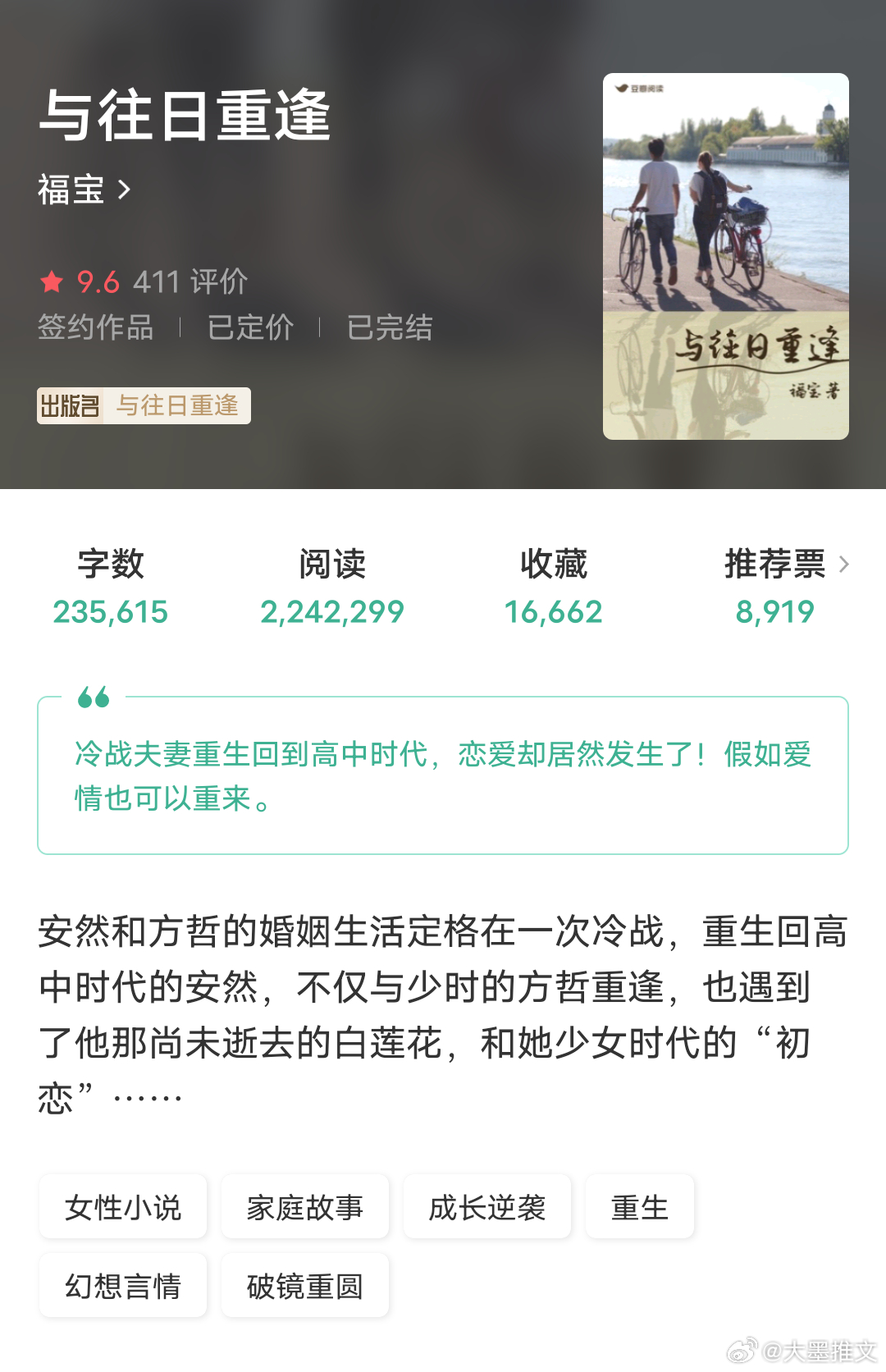 《与往日重逢》作者:福宝豆瓣,双重生,重回高中,破镜重圆女主安然和男主方哲是高中同学,男主长相帅气,是学校里的校草,女主认识男主,但男主不认识女主。毕业许多年后,两人经亲戚介绍加了微信,不咸不淡地聊了几个月,女主主动询问两人关系何去何从,结果男主玩断联,一个月后才出现。虽然婚后男主对女主挺好的,但女主心中始终有根刺,觉得男主不是因为爱和自己在一起,而是权衡利弊后的选择。日子就这样看似安稳地过着,女主回家吃饭,跟姐姐发生争吵,姐姐说出男主是因为前任去世才空窗这么多年,而且这些陈年旧事全家都知道,唯独瞒着女主。女主回家询问男主,男主只是侧着一张脸,沉默着,对往事闭口不谈。两人陷入冷战,然后双双重生到高中。男女主并不知道对方也重生了。女主初中时跟男二有过暧昧,结果上高中男二疏远女主,跟别人谈恋爱,女主为此伤心过一段时间。重生后,女主有了勇气,主动找男二问清楚。原来男二初中毕业给女主送过情书,可是情书被女主姐姐弄脏丢掉了,女主压根没有看到。男主性格内向沉闷,优柔寡断,不善言辞。女二是同所高中的学生,男主前世跟女二谈恋爱,分分合合,最后一次女二说两人分手,给男主一个解脱。然后女二从楼上跳下来,男主背负沉重愧疚感,患上抑郁(焦虑)症。重生后男女主有了交集,男主真的怕了女二,为了阻止上一世悲剧,答应女二爸爸跟女二交往。男主不冷不热的,高考完两人分手。然后男女主知道对方重生了,女主重生后努力学习,高考后答应跟男二交往。男二开朗健谈,但是说话没有边界感,且缺乏上进心,经常逃课打游戏,女主操心男二学业,两人爆发吵架,最后女主提了分手。男主看到女主恢复单身状态,见缝插针地在女主身边转悠,每天都从隔壁学校跑来,不远不近的距离陪着女主。男主这次长嘴了,解开女主心结,明确表示自己是因为爱才和女主在一起的,消失一个月是在挣扎纠结,一边想和女主在一起,一边觉得自己不配。小说he。排雷:前世男非女c,女主谈过几场恋爱,都没有突破到最后,男主惊讶女主是第一次。我不喜欢这种剧情桥段。