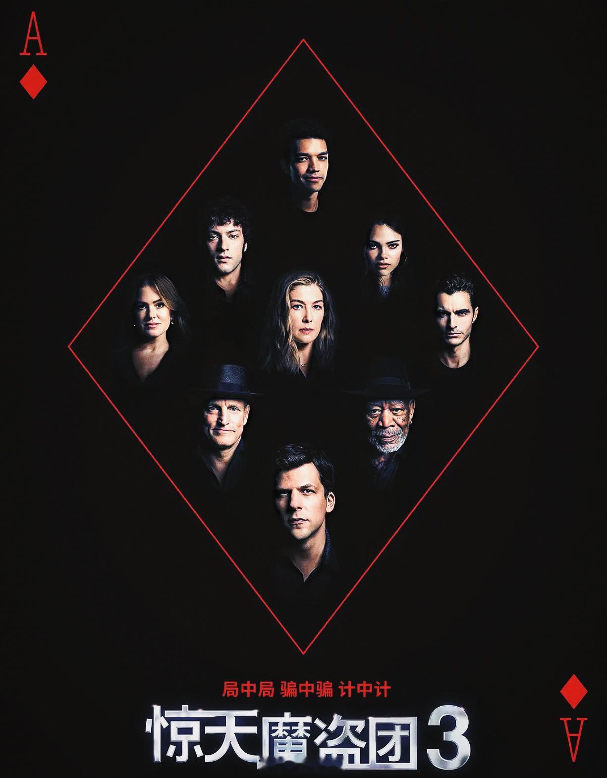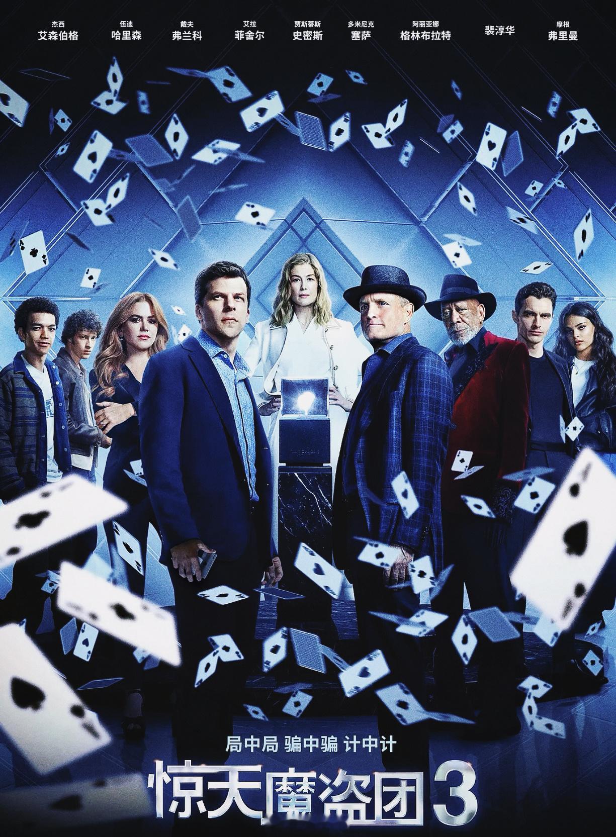 我的评分: 影院座椅冷挺久了,是时候,来点纯娱乐的爽片啦!看完【惊天魔盗团3】,只有一句好过瘾!欢迎再次入坑偷天换日的幻术大秀!魔术,玩的是出神入化、各种奇技;悬念,玩的是打破意料、反转迭迭;竞斗,玩的是你来我往、花式争锋——你以为是原来如此,其实是原来如彼!这种边看边痛快释放脑内啡的高质爆米花爽片,请狠狠多来点! IP拍到第三部,剧情惊喜和猜不透的快乐,比前作有过之而无不及,影片一“开枪”就速速“走火”,层层疑云叠加、环环设局再解谜,一直让人紧张揪心;也保持了系列叙事节奏明快、场面调度流丽、魔术表演扣人心弦的优良传统,整场都觉得自己眼耳口鼻全然被大银幕牵引、不肯错过一秒钟,无尿点、不走神、不想玩手机,生怕疏漏了任何小细节的精妙。第三部同样延续了前作的世界观,呈现了一出局中有局、融合舞台魔术表演、玩转心理战、高智商PK的酷炫对决——前两部的老骑士们悉数回归,重返魔盗聚光灯下,继续“魔”高一丈的传奇,时隔9年,这张情怀牌很好地慰藉了想念;但此次要揭开的是钻石财阀背后隐藏更深的罪恶,裴淳华饰演的薇罗妮卡是更精明狡黠、善于粉饰、诈欺有方、狠辣强大的Boss,所以骑士们也迎来年轻新世代的魔术师锦上添花,老将新人搭配,且施展娴熟梦幻的魔术巧技、且精密策划打出漂亮的默契团战,每个人都有自己的高光,神偷、猜谜、扑克、读心、伪装、逃生……总有一款奇技惊艳你。影片把计中计局中局玩得很妙,谁是召集两代魔术骑士的幕后高手?谁是致电大反派索取钻石的未知黑手?谁布下这个引来双方人马都入瓮的大局?悬念一直吊足观众胃口,压到最后完成令人恍然大悟的反转,猜人、把角色都怀疑一遍的快乐又回来了!值得狠狠夸一下的,是电影的动作戏,非常加分——从巧夺钻石、破谜古堡、挣脱关押、水箱逃生……惊险刺激之外,打戏设计非常凌厉又妙趣,充分利用身边道具和空间,颇具成龙功夫片的犀利和可爱;而大到壮阔沙漠,小到镜子屋、斜坡屋、颠倒屋、玻璃箱,各种实景拍摄都把魔术氛围拉满、参与魔术师们的行动,规避了前两部魔术太偏奇幻的悬浮感,在揭秘时更合情合理、有理有据,不耍观众,比之前进步很多。杰西·艾森伯格饰演的丹尼尔依旧冷静理智,但有了更强的leader风范,酷帅老大哥带着一群自我感觉良好的小年轻,有种daddy的慈爱;伍迪·哈里森、戴夫·弗兰科都和后辈魔术师有互动火花;艾拉·费雪饰演的亨莉、丽兹·卡潘饰演的鲁拉,和在【芭比】中表现不俗的阿丽亚娜饰演的琼,也都更具女性自主意识,自信自强有头脑,好期待看到纯女版的魔盗骑士!当然,摩根·弗里曼的客串还是那么惊喜。由裴淳华担当Boss,这个高智商恶女反派自然不容小觑,片中的她虽然看似受制于魔盗团,却算计、狠厉兼备,有筹划有计策,给魔盗团带去几乎团灭的巨大危机——反派给力,较量才好看!而且裴淳华的造型也太好看了吧!无论是优雅的晚礼服,还是飒然的休闲装,都又高贵又帅气,妈咪好优雅!演个电影还能走个时装秀!💖卷西的丹尼尔有句台词,“魔术师是表演者,而不是超级英雄”,但魔盗团们却实实在在以魔术揭露、反抗社会的不公,以魔术的“以假乱真”,为世道去伪存真,【惊天魔盗团3】就更有这种热血侠气,而骑士们惺惺相惜的友情也非常动人。