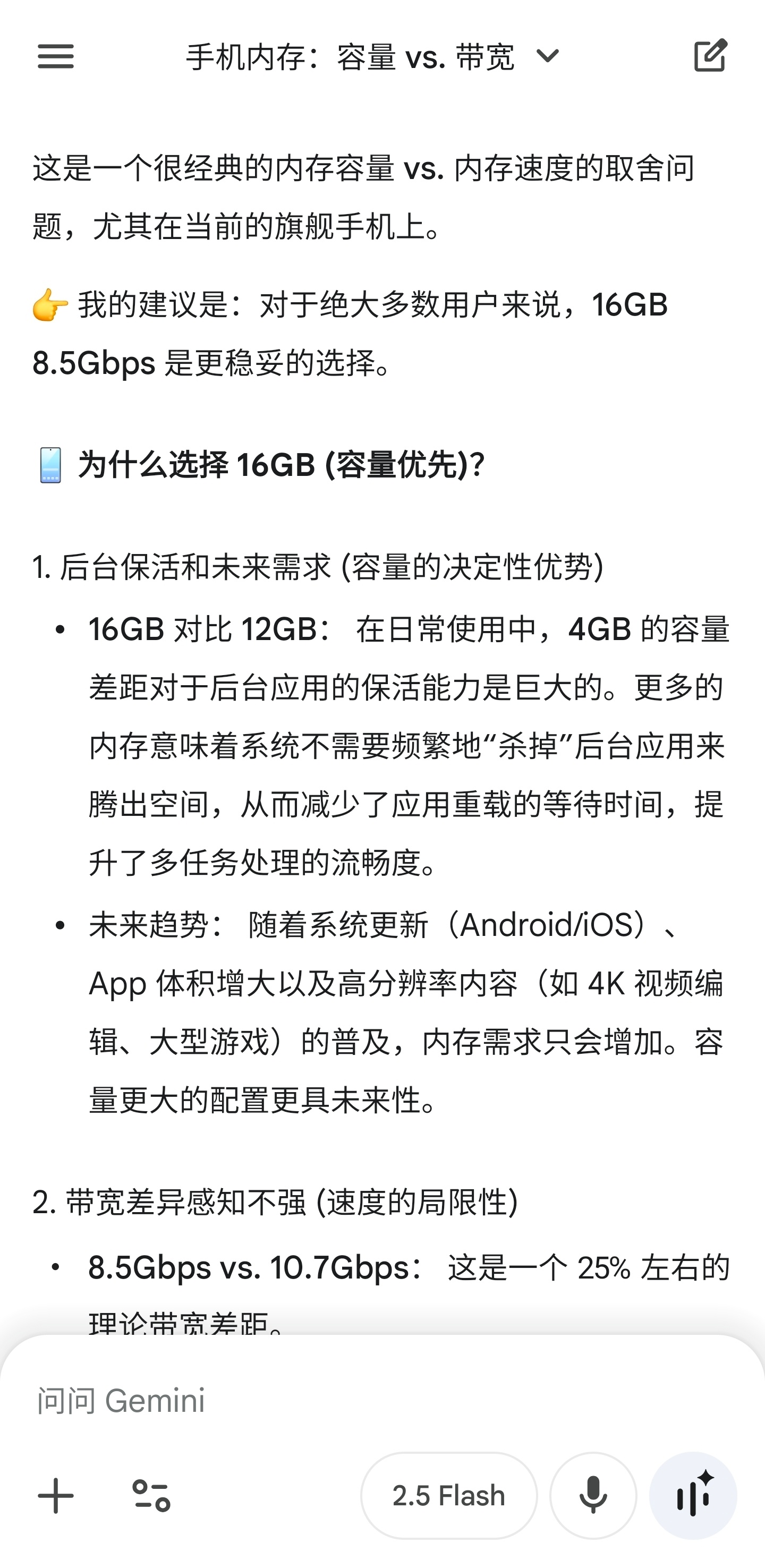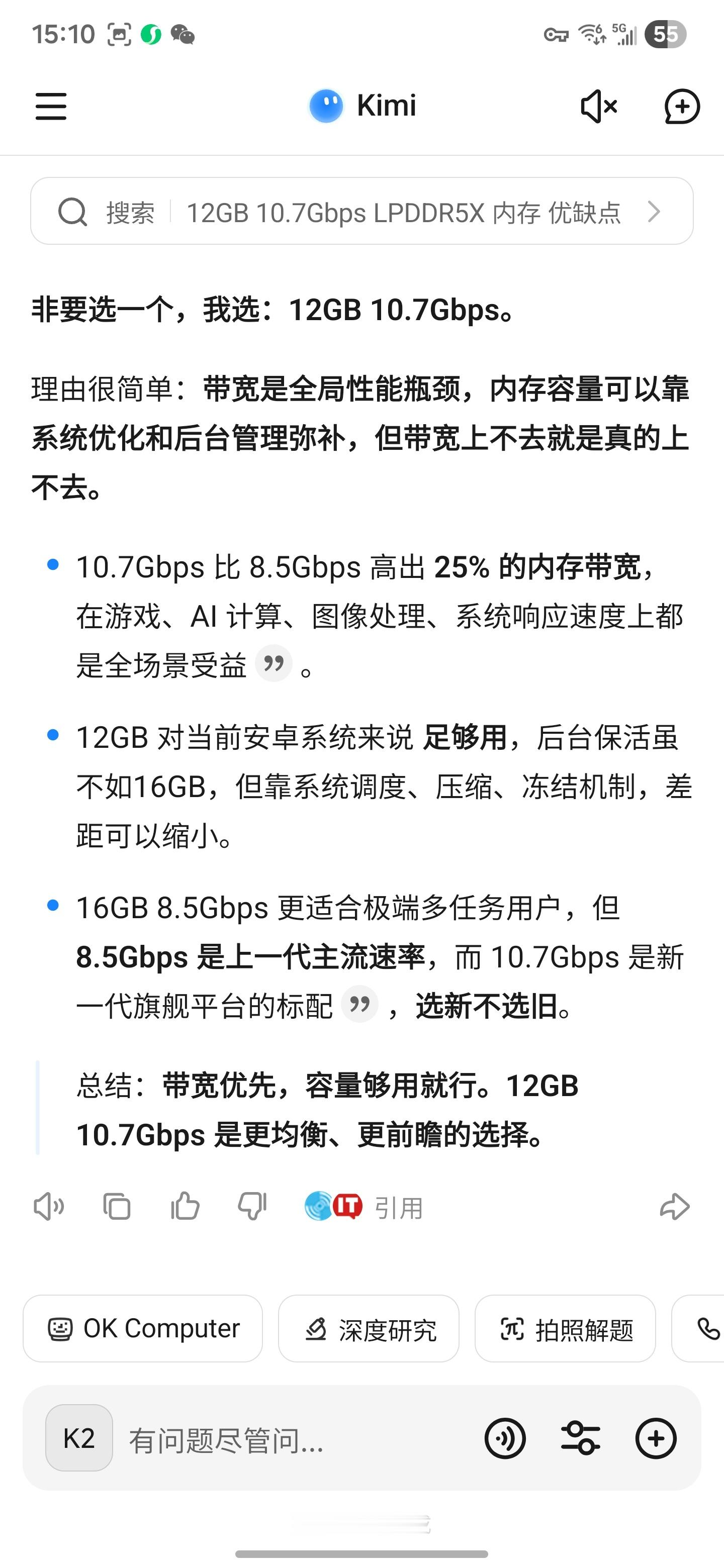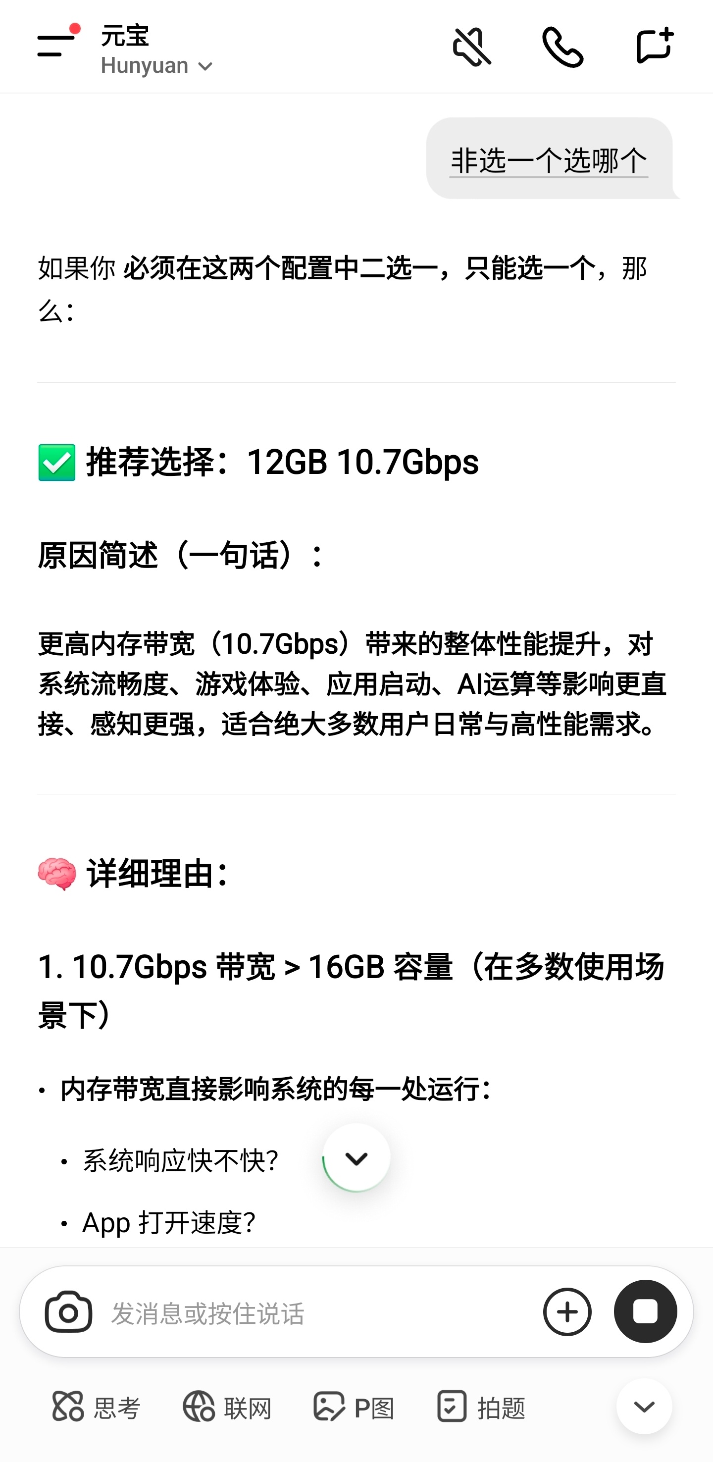 把这个问题抛给不同AI,他们怎么回答?“手机这俩LPDDR5X内存规格你怎么选?12GB 10.7Gbps 和 16GB 8.5Gbps”————————————————结果:豆包,deepseek,Gemini ,Grok 选16+8.5ChatGPT,元宝,perplexity,kimi选12+10.7