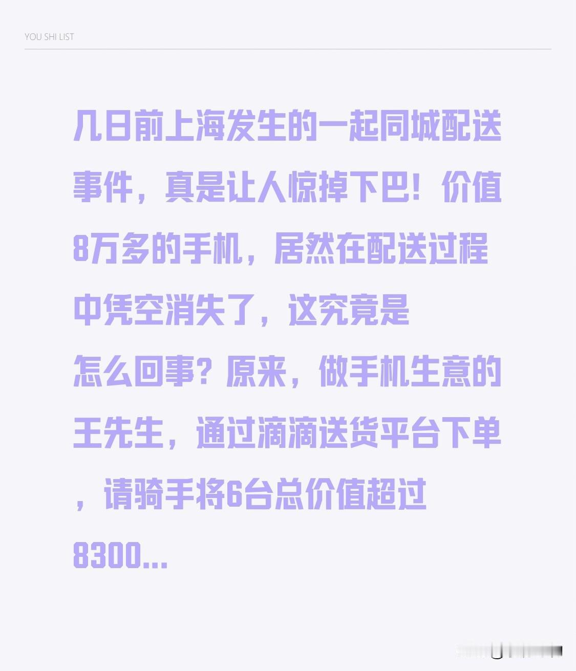 几日前上海发生的一起同城配送事件,真是让人惊掉下巴!价值8万多的手机,居然在配送过程中凭空消失了,这究竟是怎么回事? 原来,做手机生意的王先生,通过滴滴送货平台下单,请骑手将6台总价值超过83000元的苹果17 Pro Max手机送至客户手中。本以为这是一次再普通不过的同城配送,没想到却暗藏玄机。骑手取走手机后,便如同人间蒸发一般,连人带货一起消失得无影无踪。王先生焦急万分,立刻报警并联系平台,但至今仍未找回手机。这起事件不仅让王先生损失惨重,更引发了公众的广泛关注和担忧。大家纷纷质疑,我们还能信任这些配送平台吗?毕竟,谁也不想自己的贵重物品在配送过程中遭遇不测。对此,平台方也表示将加强监管,确保类似事件不再发生。但话说回来,加强监管真的就能杜绝此类问题吗?这恐怕还需要时间和实践来检验。 这起事件无疑给我们敲响了警钟,提醒我们在选择配送服务时,一定要多留个心眼。大家对此有何看法呢?快来评论区留言讨论吧! 外卖员谣言事件 上海快递事件 上海配送骑手 外卖送餐丢失 上海京东外卖 上海代收快递 韵达事件