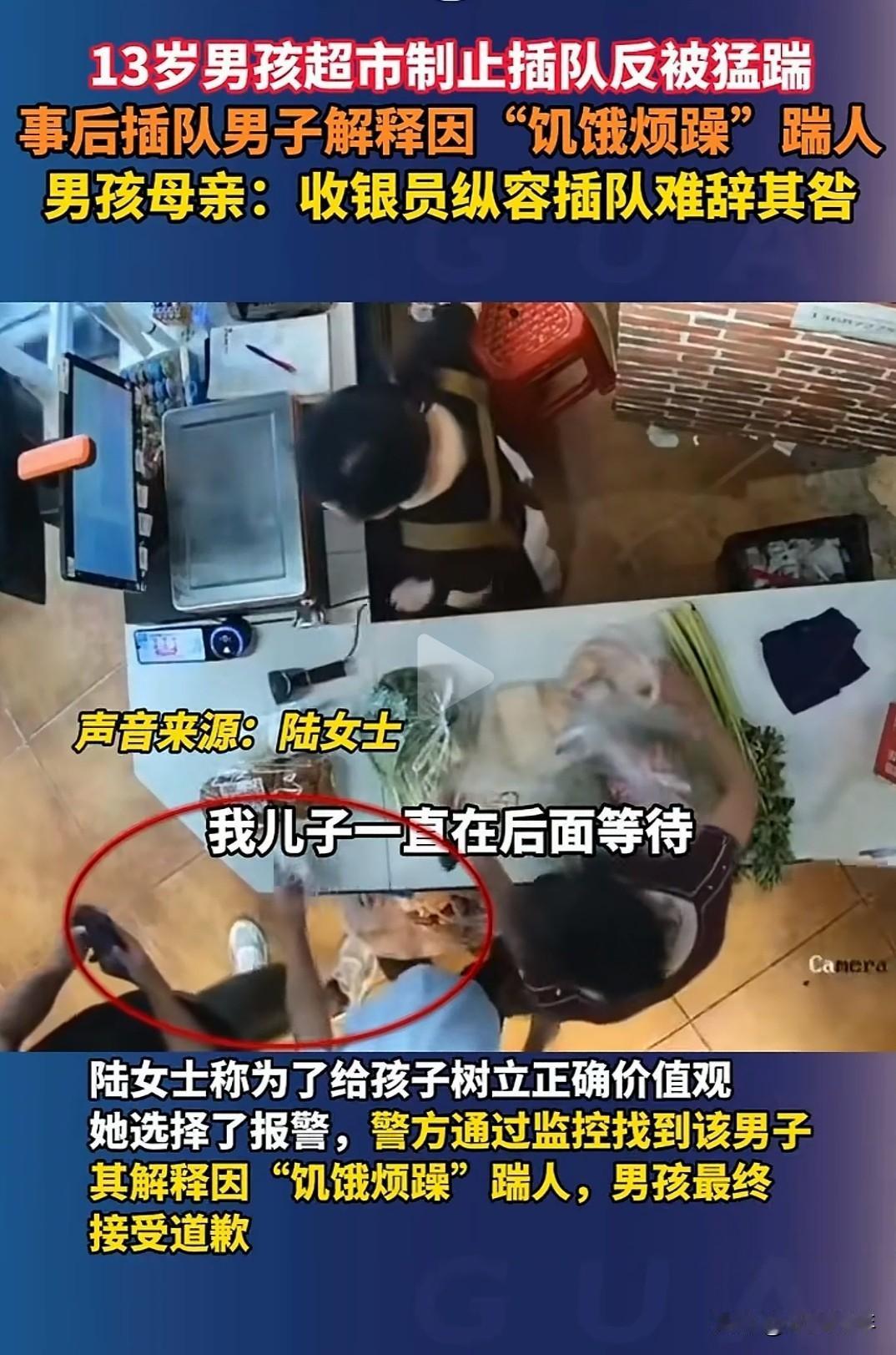 超市发生插队男子猛踹少年事件,收银员冷漠旁观惹众怒! 8月27日,湖北宜昌一家超市。13岁男孩排队结账,连着俩人插队。他先跟收银员说,我先来的别扫他。收银员不理,还继续操作。男孩伸手一挡,后面那个插队的居然一脚踹上来!骂了几句就走了。 这叫什么事啊?插队还踹人?那男的后来说是因为太饿了烦躁。饿就能踹小孩?这理由也太扯了吧! 孩子妈妈觉得收银员也有问题。你明明看到小孩被欺负,你还无视?这不就是纵容插队吗?超市到现在也没回应,管理也太差了。 很多网友气的是,为什么总让守规矩的人受委屈?小孩做得没错啊,反而被踹。收银员不制止,是不是以后谁都敢插队? 最后报警处理了,男的道歉了。但道个歉就完了?如果没监控呢?是不是就白踹了? 要我说,这种事儿真不能惯着。孩子妈妈做得对,必须较这个真。不然下次谁还敢站出来?