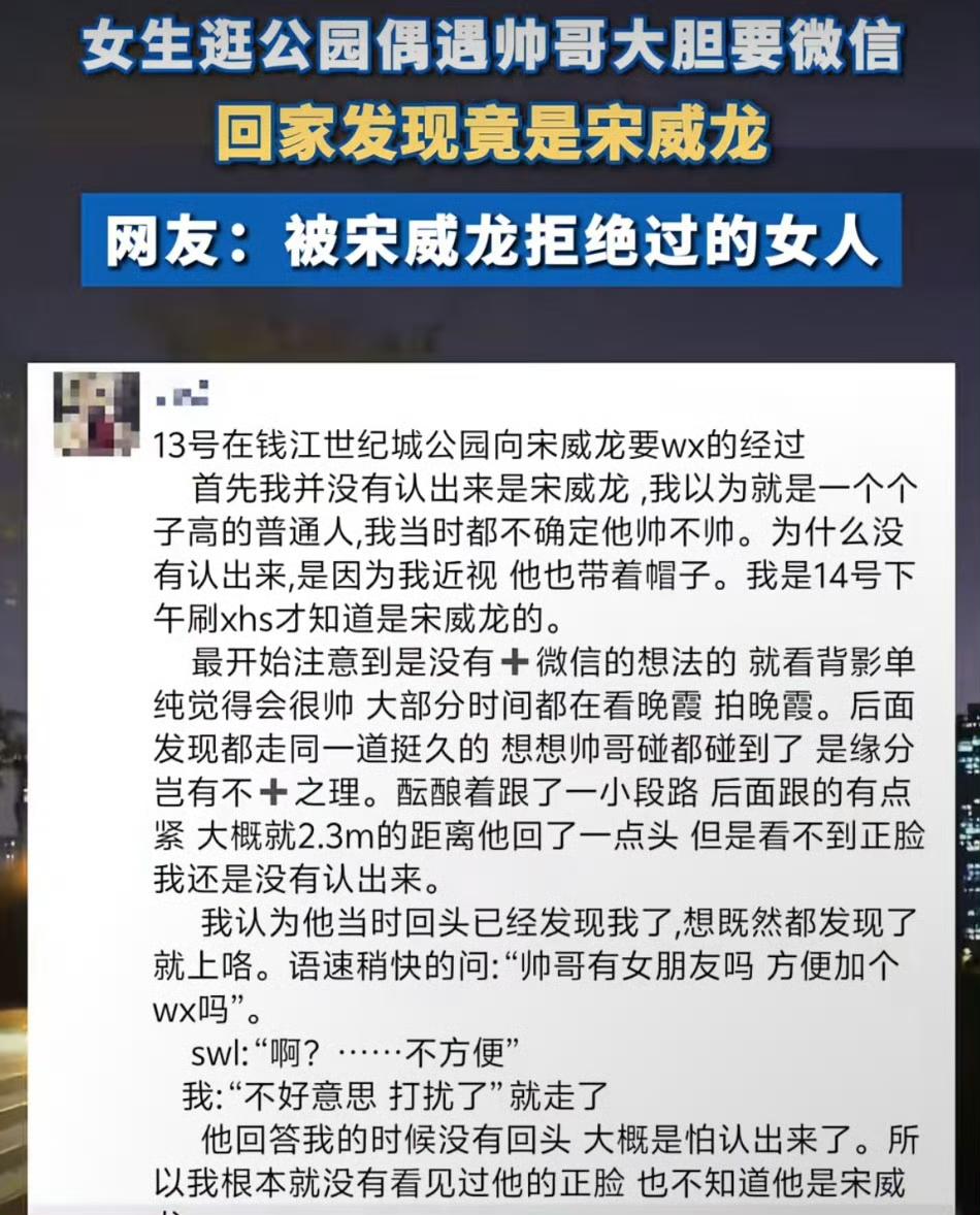 5秒尴尬!杭州姑娘公园搭讪帅哥被拒,回家刷手机直接愣住:那不是宋威龙吗?谁懂啊! 姑娘那天在湖边散步,看见个穿黑外套的男生低头走路,帽檐压得有点低,侧脸线条干净利落。她一咬牙冲上去问“有对象吗?方便加个微信不?”对方愣了一下,声音淡淡的:“啊?不方便。”空气瞬间凝固,她脸一红,转身就走,心差点从嗓子眼跳出来。 第二天热搜炸了——宋威龙杭州公园路透。视频里那人走路姿势、声音、连帽衫款式,全对上了。她翻出手机相册里偷拍的背影照,手指都在抖。原来当时他耳机还挂着,手里拎着杯豆浆,像普通男孩一样赶着去遛弯。没保镖没助理,也没摆架子,被搭讪也没发火,就老实说了句“不方便”。 这年头,谁还能在不知情时,为一个背影鼓起勇气说出口?社死是真,可那份莽撞的真诚更真。多少人嘴上说“追星敢上前”,事到临头却缩了头。 要是你,碰上个戴帽子的背影,还敢走上前问一句吗?