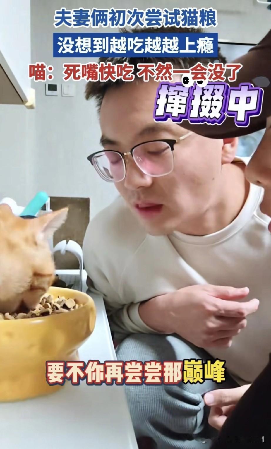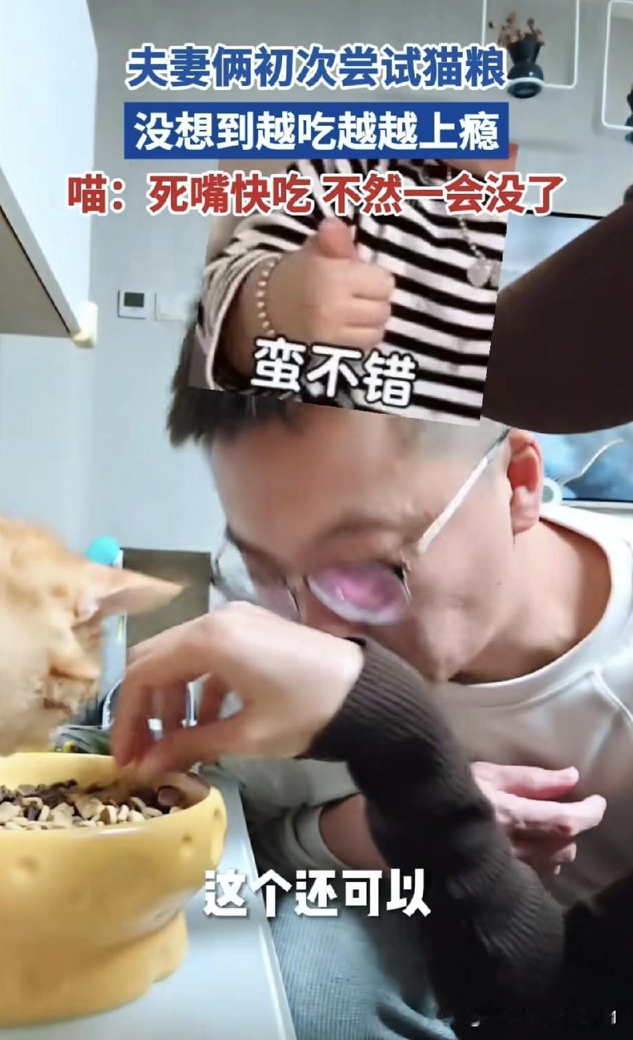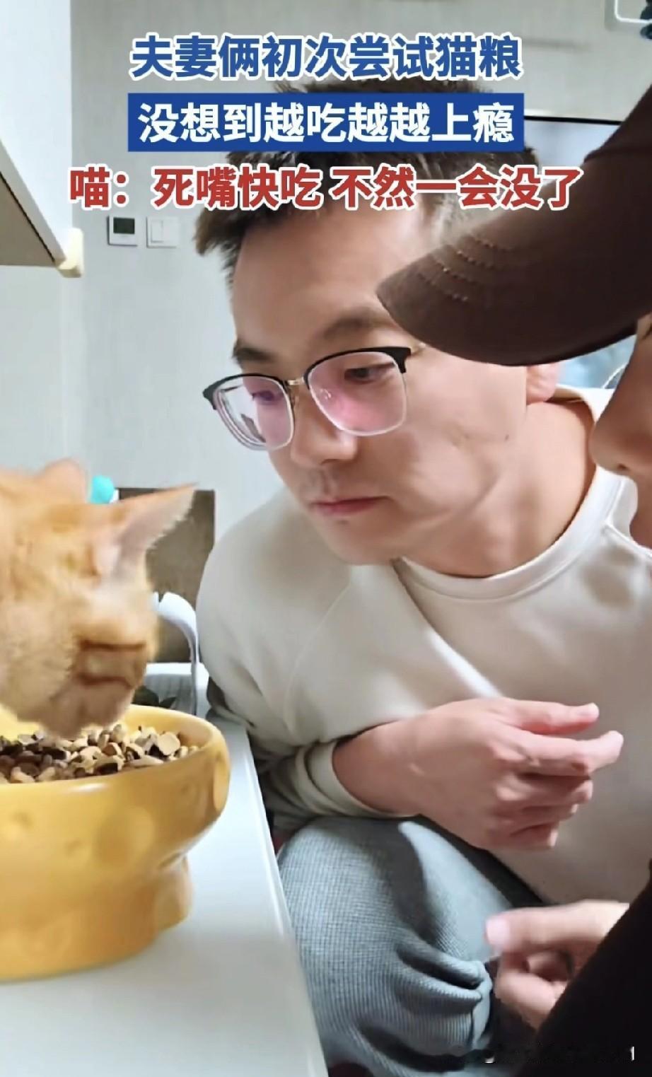 夫妻俩看着自家养的宠物猫正狼吞虎咽地吃着猫粮,男子突然冒出个想法,便对妻子说道:“猫粮到底是什么味道啊?”这话也勾起了妻子的好奇心,她怂恿男子去尝一尝。男子拿起一块猫粮放进嘴里,咀嚼了几下后,跟妻子说:“太香了!”没想到他越吃越上瘾,接连又尝了好几块。 妻子问道:“到底啥味儿啊?”男子回答:“像没加盐的牛肉干。”妻子见男子吃得那么香,便问:“有这么香吗?”男子答道:“味道还挺好的。”妻子忍不住也拿起一块放进嘴里尝了尝,觉得味道确实还不错。 这两口子也太搞笑了吧!还好养的是宠物猫,要是养宠物狗,跟它抢食,它护食起来可是会咬人滴。 你们夫妻两个做个好人吧!连自家猫的粮食都要抢。你吃袋袋里的我还能勉强接受,你吃被猫碰过的,真是受不了。
