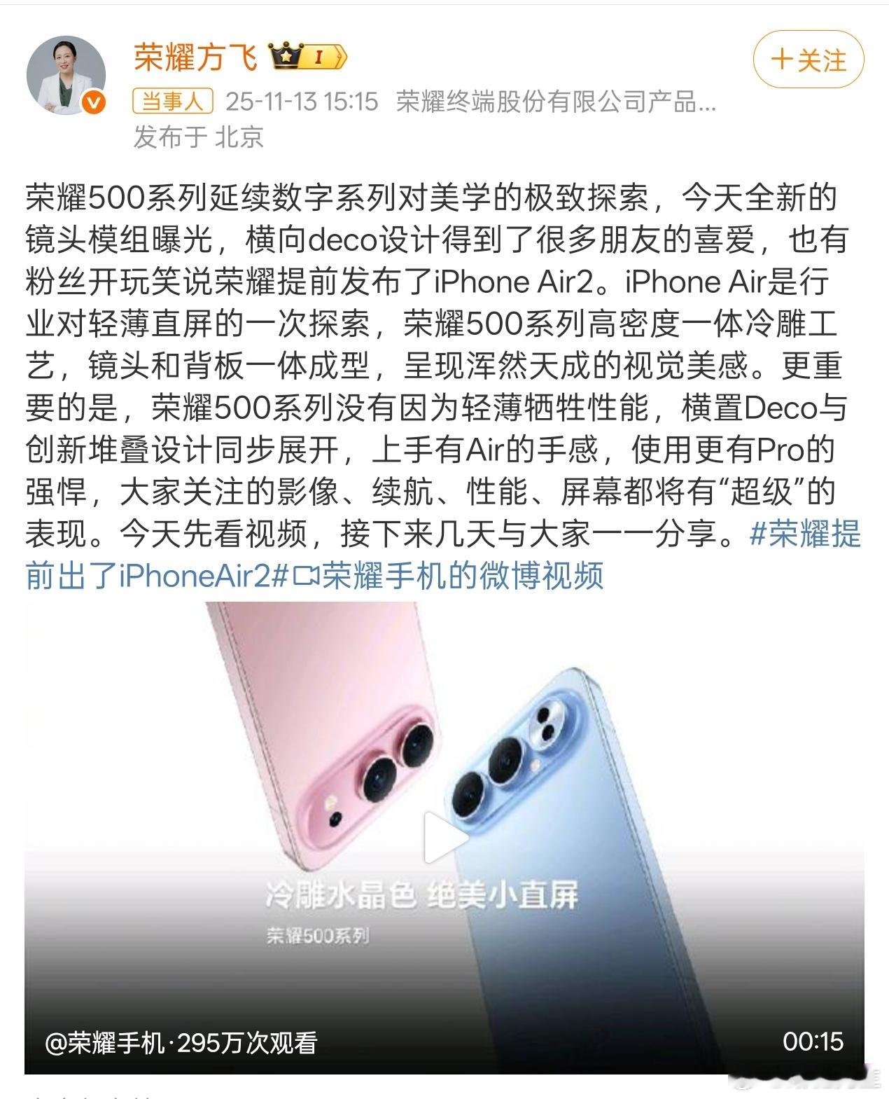 荣耀产品线总裁:粉丝说荣耀提前发布了iPhone Air2。