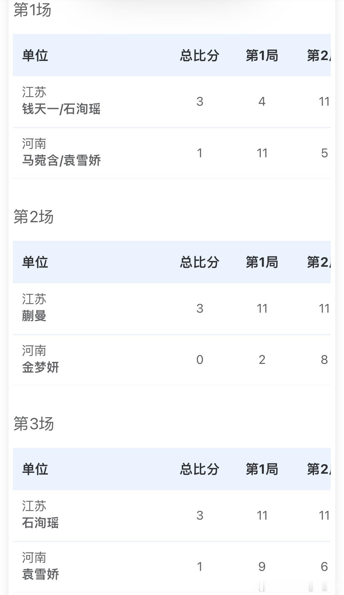 女子团体小组赛 - A组江苏队3-0河南队钱天一/石洵瑶3比1马菀含/袁雪娇蒯曼