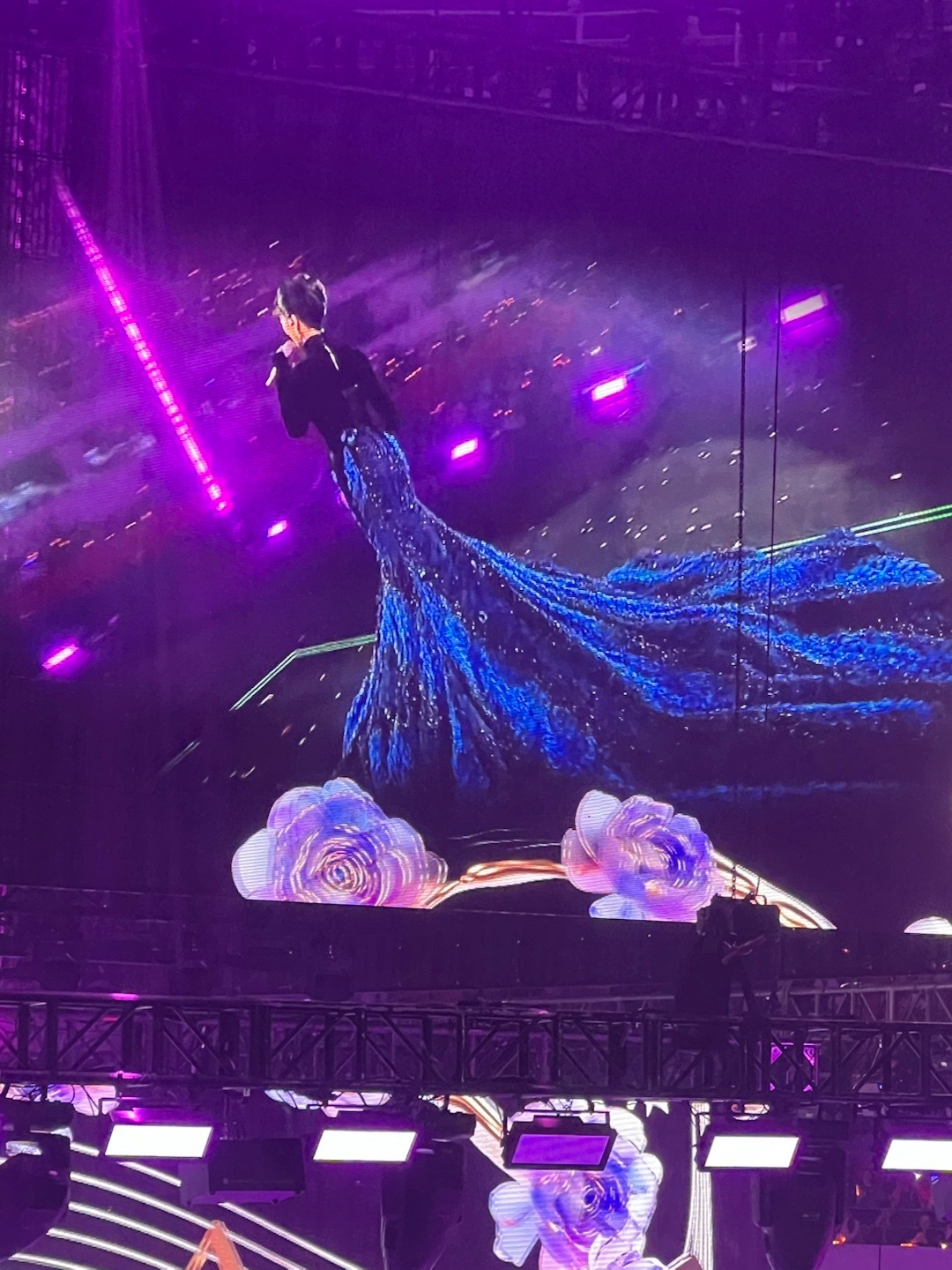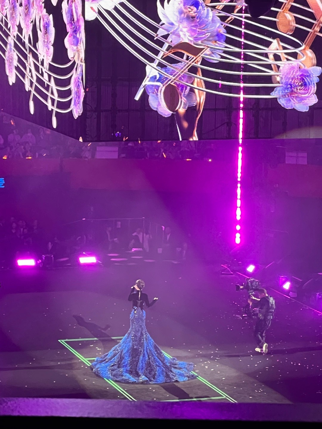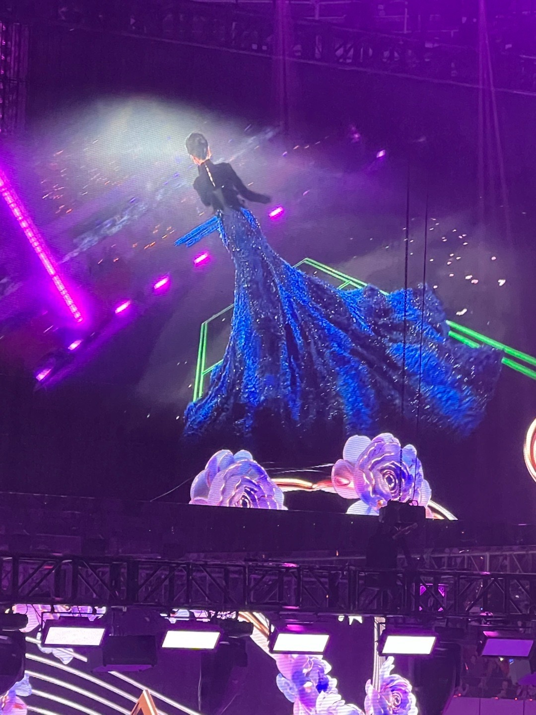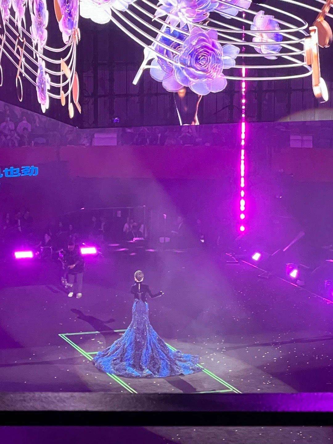 赵雅芝从艺50年时光派对上,这身蓝色拖地长尾礼服裙也太美了吧,灯光下闪闪发光, 好像把银河穿在了身上!