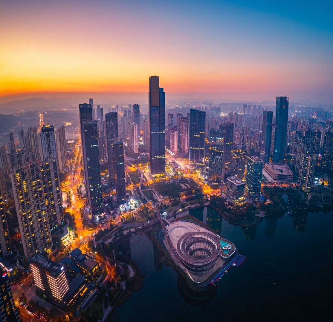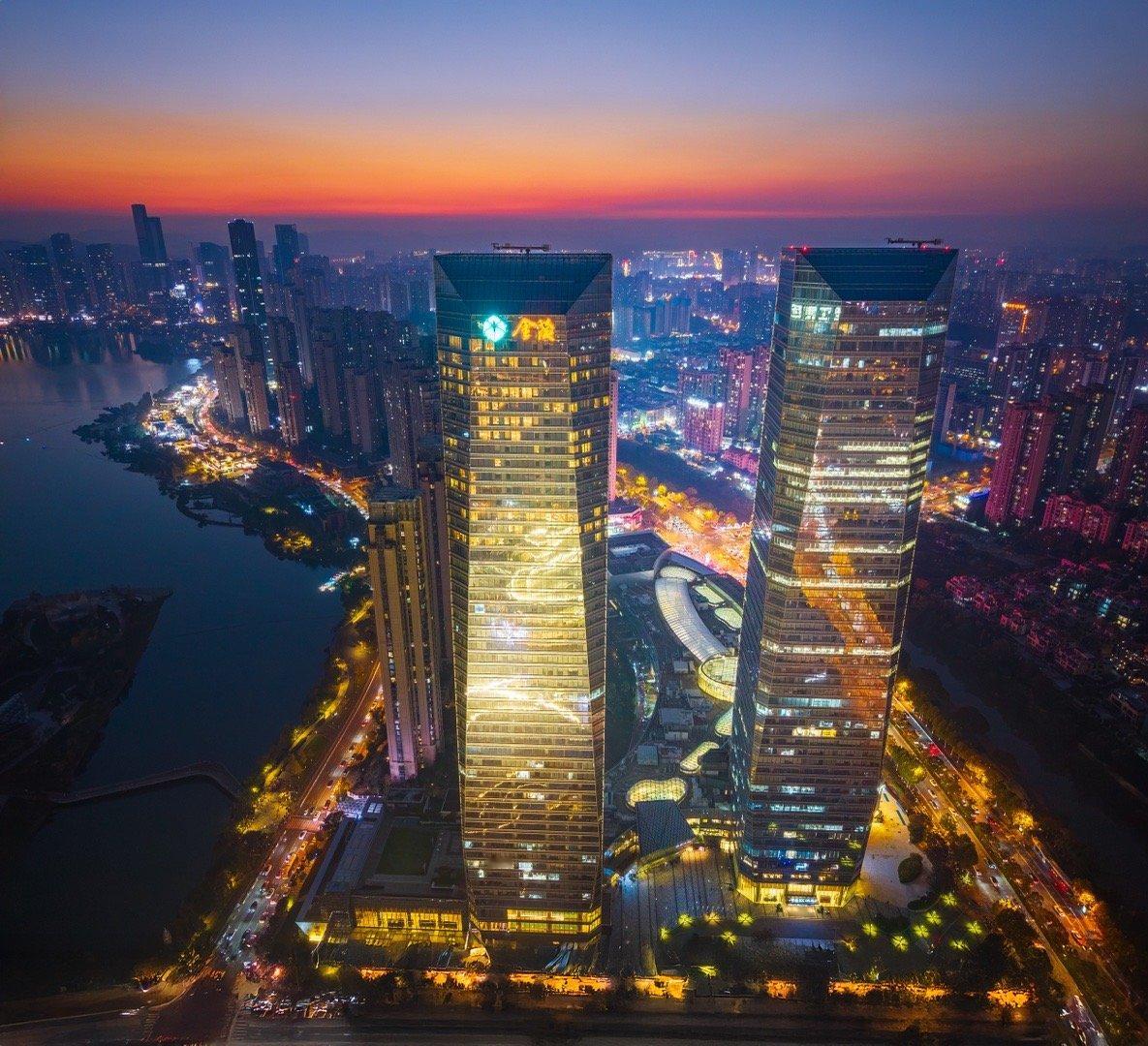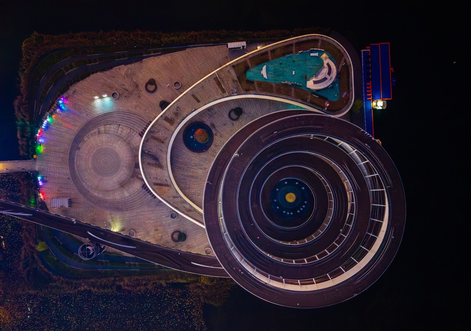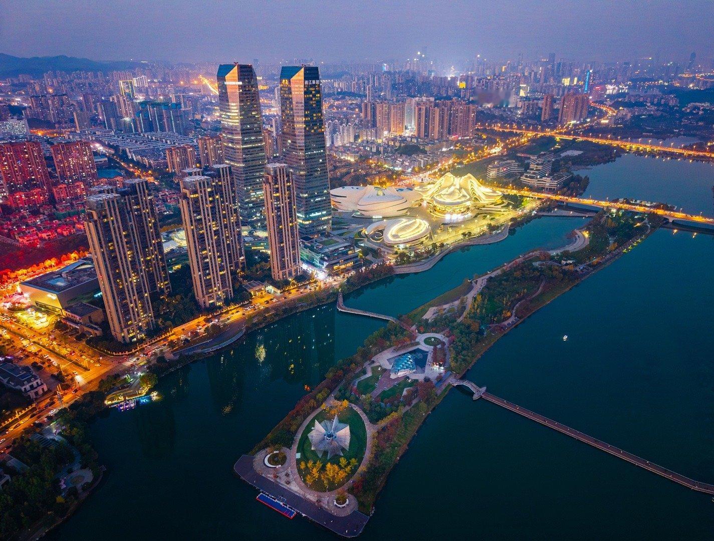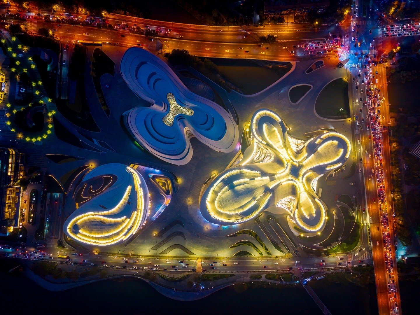 长沙梅溪湖的傍晚蓝调时刻,是摄影绝佳时机。用无人机航拍大剧院的流线型轮廓、金茂大