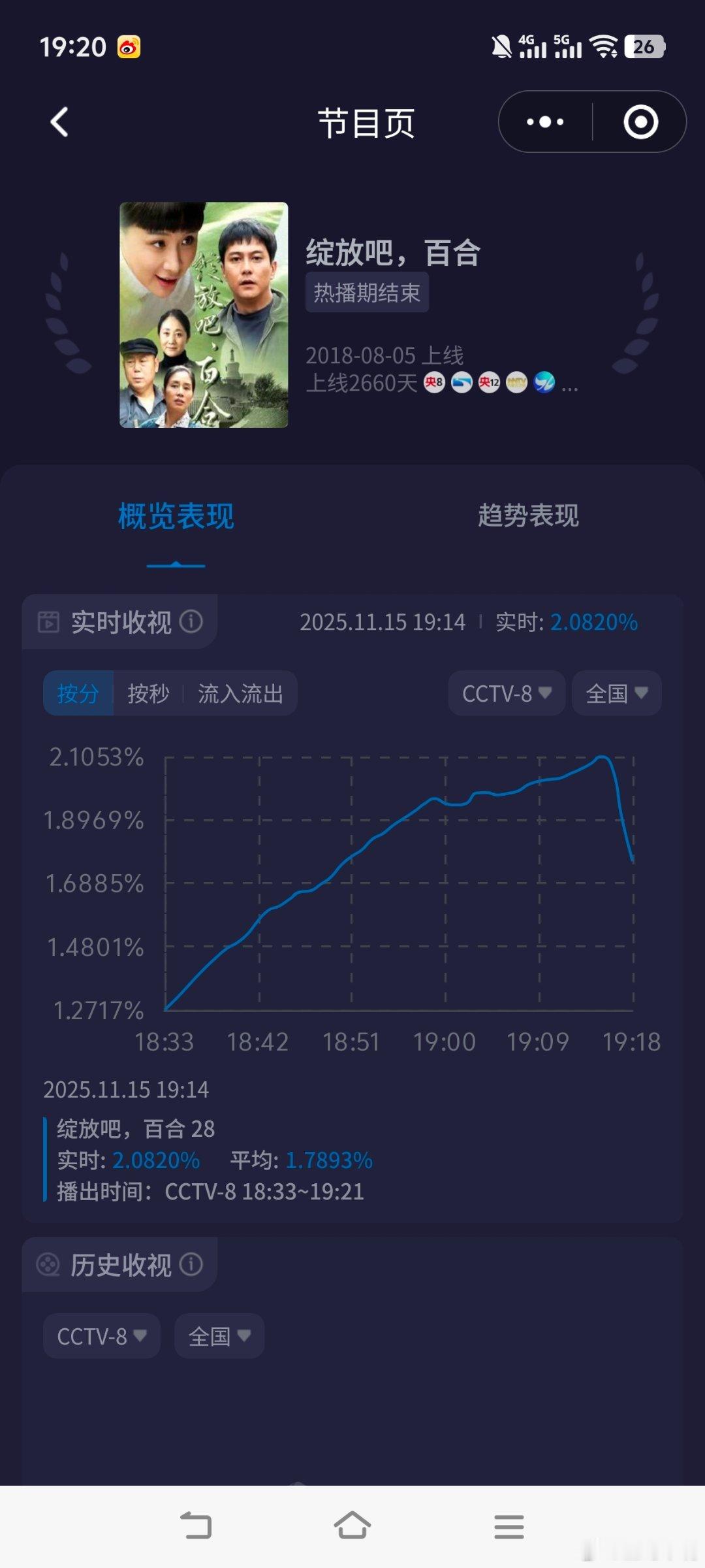 央八傍晚档酷云实时收视破2了。奶妈好强啊!这是今年入冬以来傍晚档首次破2!峰值