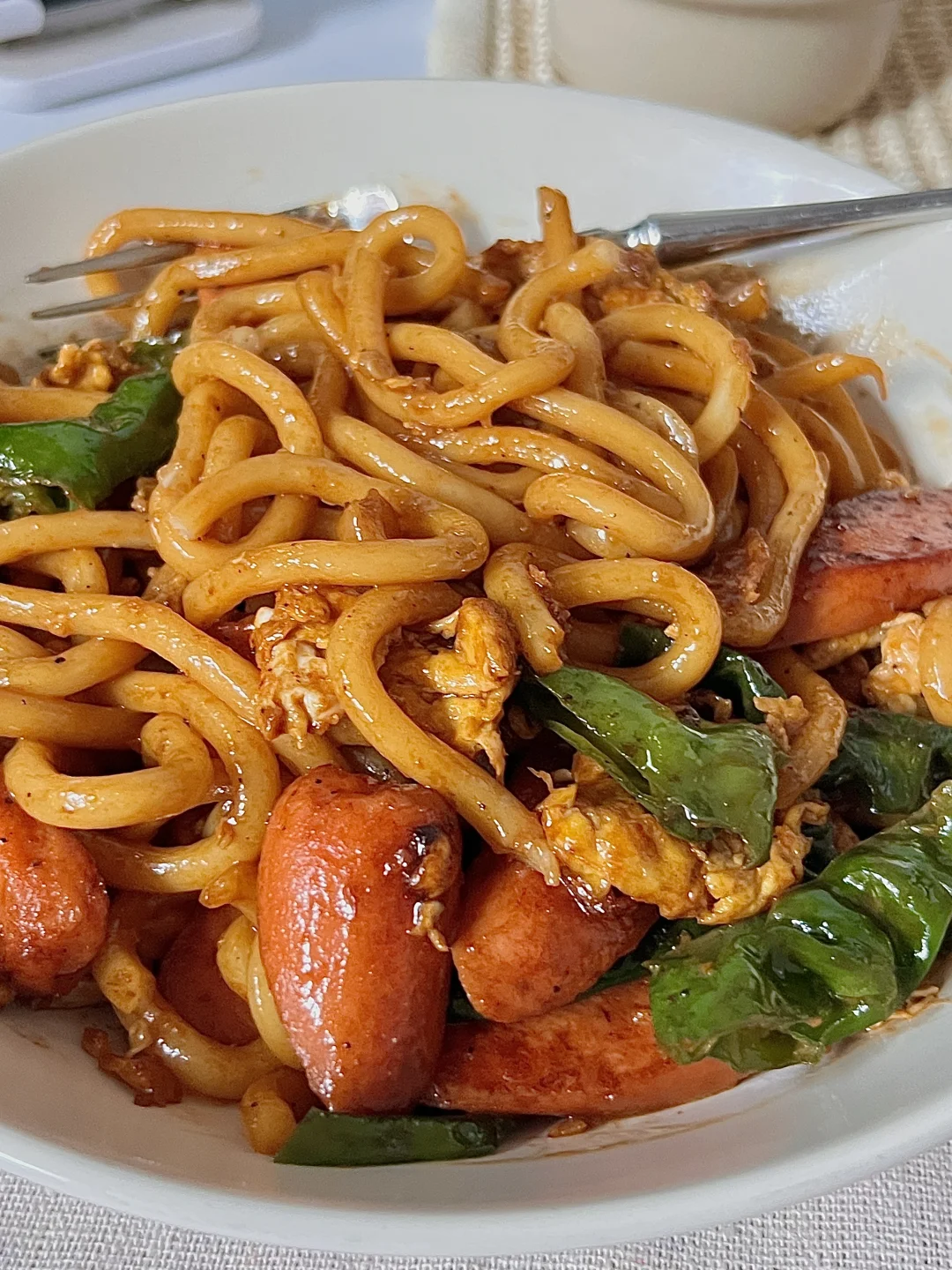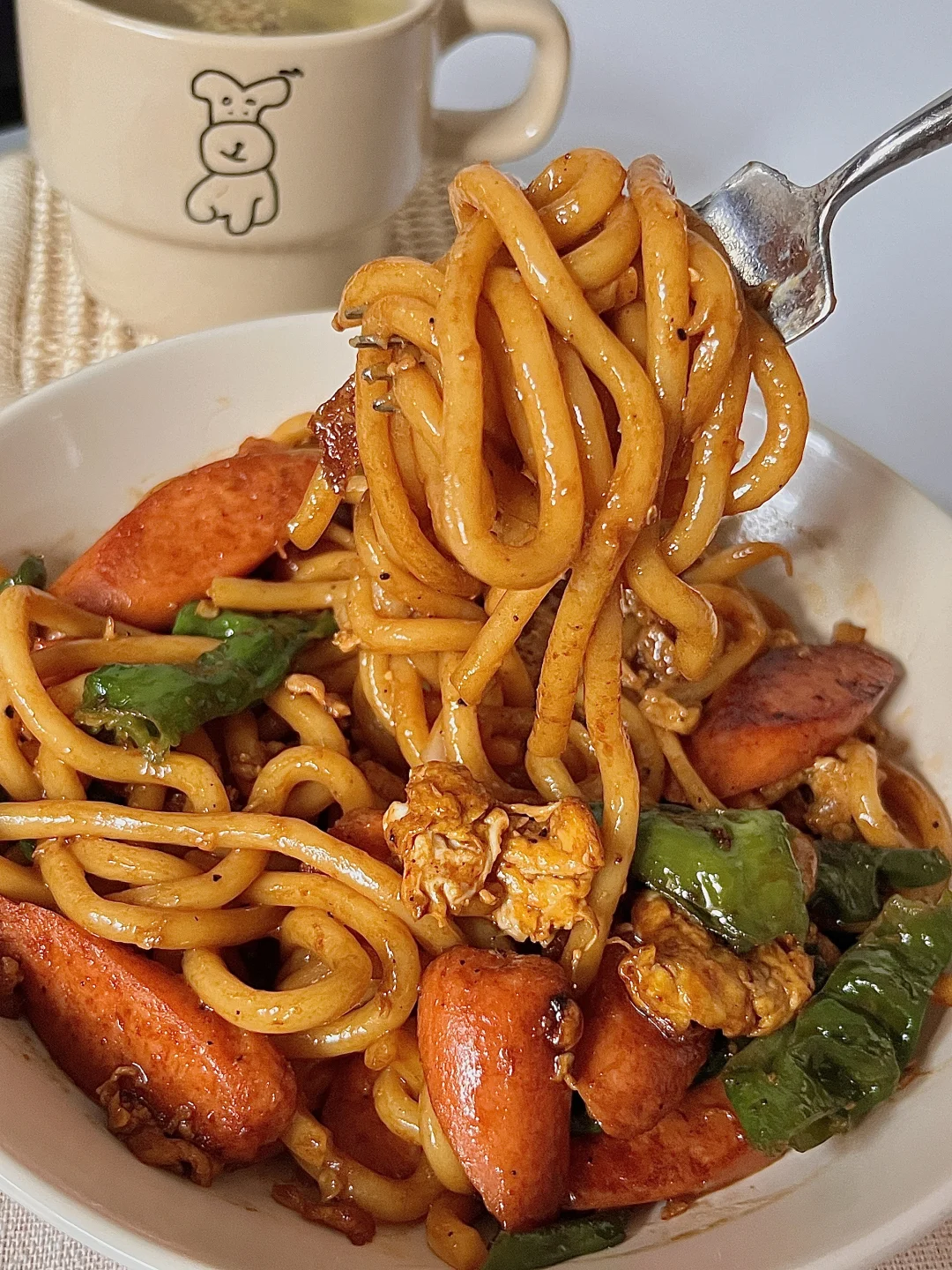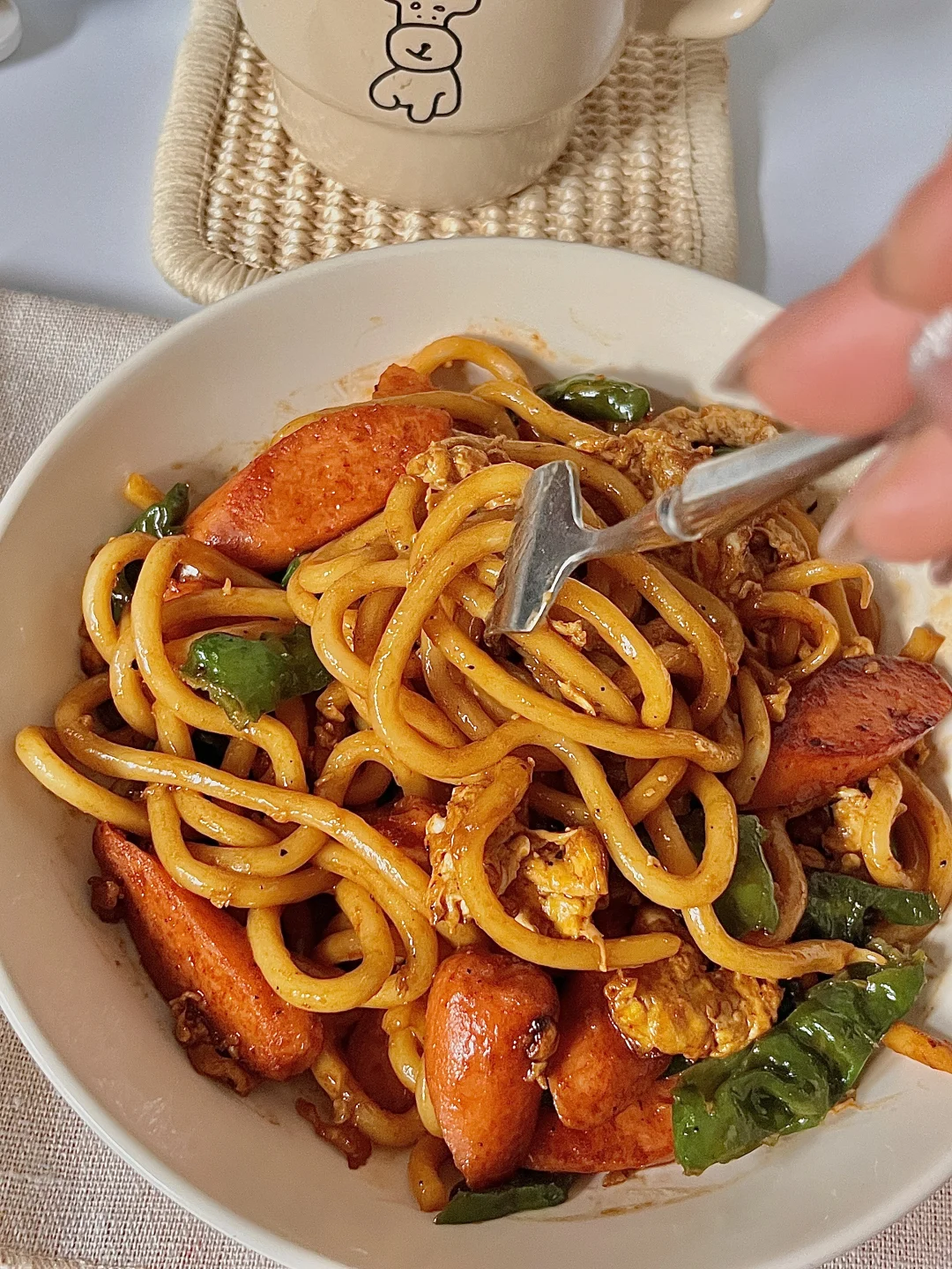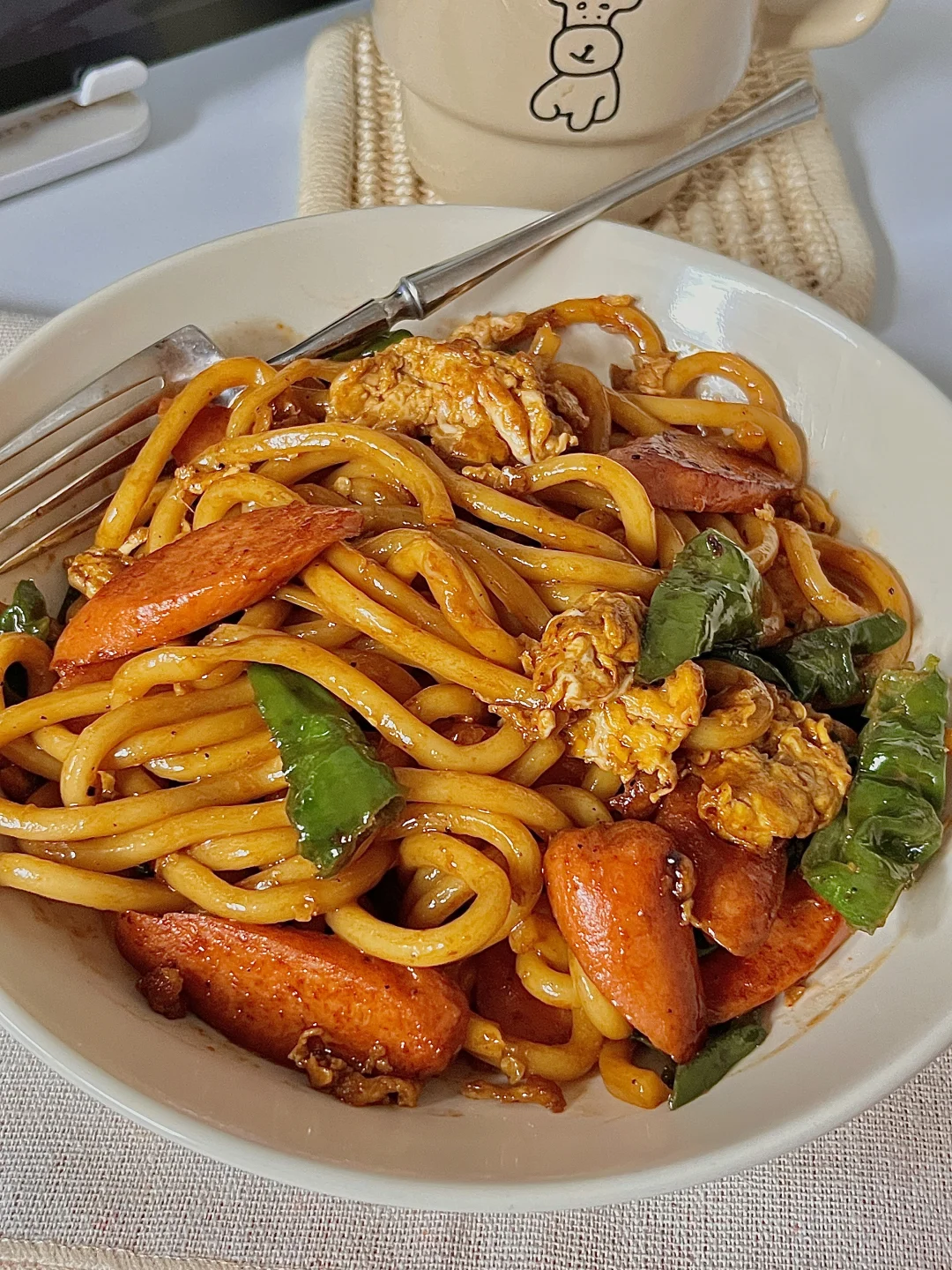 夏日消暑风味集 🍴今日份一人食: 鸡蛋火腿炒乌冬面 玉米须茶🍵 . 酱炒乌冬面,吸满了浓郁的酱汁 配着火腿 鸡蛋 青椒真的好好吃呀!可以秒杀路边摊啦~ 爱吃乌冬面的宝一定要试试呀✌🏻