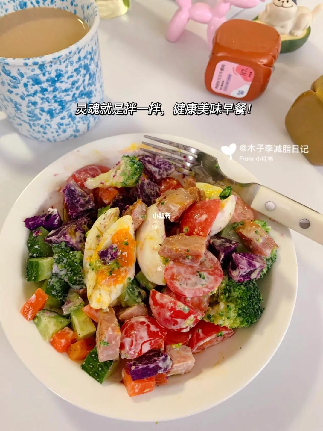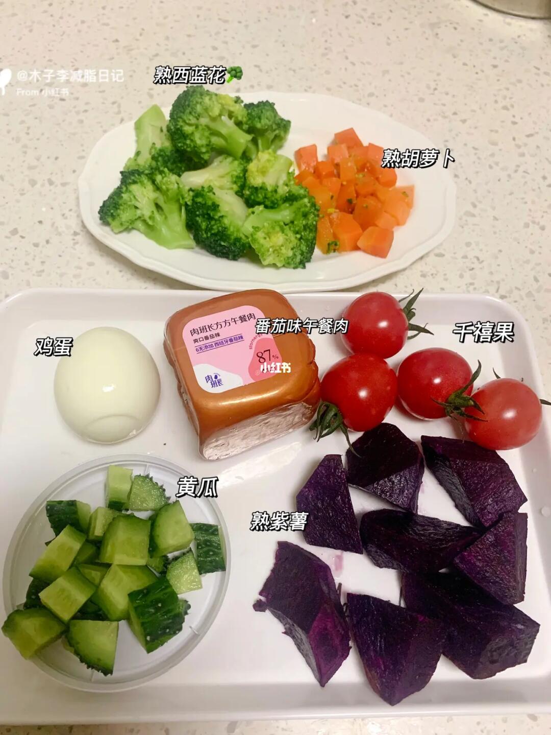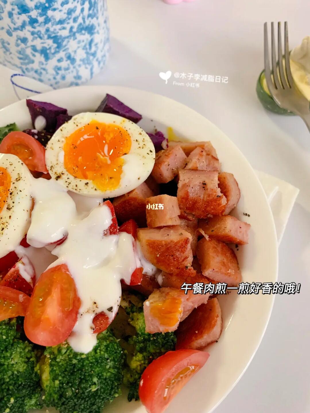 📣:吃多了有面包的早餐偶尔想吃点不一样的!今日早餐分享低脂午餐肉紫薯沙拉🥗这绝对是减脂界天花板~低卡又饱腹!午餐肉用的肉班长方方午餐肉是爽口番茄辣!煎一煎又香又辣!好爱~