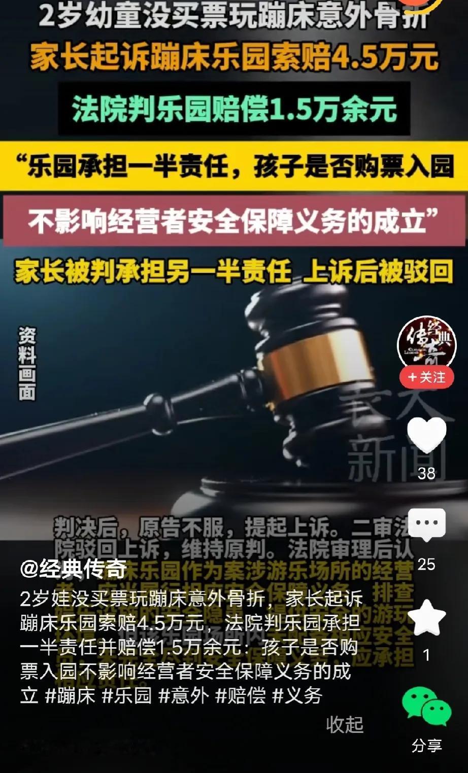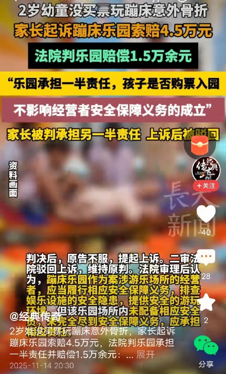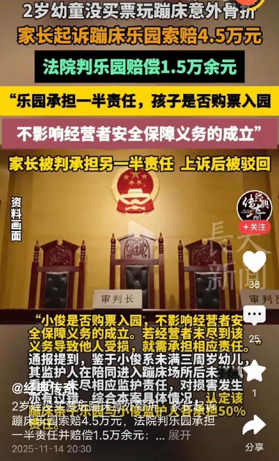 湖南彬州,2岁宝宝玩蹦床时不慎摔跤,导致左肱骨髁上骨折,治疗费、护理费共花去3.15万元,家长要求乐园赔偿4.5万,谁料,乐园却说,孩子入园时未购票,拒绝承担责任,双方沟通无果,孩子家长告上法庭,向乐园索赔4.5万,法院判决出人意料。 2023年5月7号那天,小俊的妈妈带他到湖南彬州市某家儿童乐园玩。 小俊是一个2岁多的宝宝,好奇心很强,他来到儿童乐园,看到乐园里小朋友们在开心的玩耍,他开心得手舞足蹈,跃跃欲试。 尤其是当他看到蹦蹦床时,显得尤为兴奋,他努力挣脱妈妈的手,直接往里冲。 小俊妈妈看到孩子那么开心,那么可爱,她的心都快被融化了,她一路小跑着跟在小俊后边。 当时儿童乐园门口并没有工作人员,也没有人提醒小俊妈妈要买票方可入园。 小俊妈妈心里想着,也许2岁的宝宝身高没有达到购票的标准,所以就任由孩子在里边玩。 因为蹦床上都是几岁的孩子,没有大人上去陪同,所以小俊妈妈就在旁边站着,小俊则独自在上面玩。 可就在小俊玩得最开心的时候,意外发生了,小俊妈妈只听“哇”的哭声,她看过去就发现小俊摔着了。 小俊妈妈顾不了那么多,赶紧冲到蹦床上抱起小俊,她把小俊从蹦床上边抱下来边哄。 小俊妈妈以为孩子只是简单的摔伤,哄哄他就不哭了,谁料,小俊却一直哭个不停,嘴里还不停地喊疼,尤其是小俊妈妈碰到他左手臂位置的时候,他疼得大喊。 小俊妈妈急坏了,赶紧将小俊送到附近的医院,可当附近的医生告知孩子有可能是骨折时,小俊妈妈不敢大意,赶紧联系了小俊爸爸。 两人协商后,决定将小俊带到广州医治。 5月8号,小俊被父母带到广州某家权威医院检查,后来经过医生检查诊断,小俊左肱骨髁上骨折,得住院手术治疗。 小俊在医院住了一段时间,一共花去医疗费用24364.98元;加上护理费、营养费等损失,合计约3.15万元。 小俊出院后,小俊父母认为,他是在儿童乐园摔伤的,是乐园没有做好安全保障措施,存在过错,要求乐园负责人赔偿4.5万元。 可乐园一方却说,小俊没有购票入园,是他自行进入的,责任在于家长,拒绝赔偿。 小俊家长在多次沟通无果后把儿童乐园告上法庭,向他们索赔医疗费、护理费、营养费,及后续治疗费等合计4.5万元。 法院经过审理认为,儿童乐园作为经营者,未配备安全员、未完全尽到安全保障义务(该义务是法定义务,与是否购票无关),需承担50%责任。 而家长作为2岁幼童的监护人,陪同入园却未谨慎看护,对损害发生存在过错,承担50%责任。 最终法院判决,乐园赔偿小俊损失的50%,即15752.99元(约1.5万余元)。剩下的费用由小俊父母承担。 有人说,2岁孩子本就是需要寸步不离看护的年纪,蹦床又是有风险的项目,哪怕心里觉得“孩子没到购票标准”,母亲也不该放任孩子独自玩。 孩子摔疼哭喊时的慌乱,其实早藏在“任由孩子冲进去”的侥幸里。心疼孩子、想讨说法是人之常情,但监护人的责任没法因“乐园没人拦”就完全推出去。 不过对于乐园一方,“没购票”不该是免责的挡箭牌。 他们门口没工作人员、没验票也没安全提醒,连基本的安全员都没有,这是明晃晃的管理偷懒。 孩子不管有没有买票,只要进了你的场地,安全保障就是该尽的本分,不能等出了事才拿“没花钱”当借口,这既不合情也不负责。 说到底,安全不是“你没拦我就可以”“你没花钱我就不管”的选择题,家长的看护心和乐园的责任心,缺了哪一个,都容易让孩子受委屈。 《民法典》第1198条规定,宾馆、商场、银行、娱乐场所等经营场所、公共场所的经营者、管理者或者群众性活动的组织者,未尽到安全保障义务,造成他人损害的,应当承担侵权责任。 儿童乐园属于面向公众的娱乐场所,其作为经营者,门口未安排工作人员验票和提醒,场内也未配备安全员,完全未落实蹦床这类高危游乐项目所需的安全保障措施。 即便小俊未购票入园,安全保障义务作为法定义务并不因游客未购票而免除,乐园的管理缺位与小俊摔伤存在直接关联,所以法院判定其承担50%责任完全契合该法条规定,其以“未购票”拒绝赔偿的理由不符合法律要求。 《民法典》第1188条第1款规定,无民事行为能力人、限制民事行为能力人造成他人损害的,由监护人承担侵权责任。 监护人尽到监护职责的,可以减轻其侵权责任。 小俊属于无民事行为能力人,其母亲作为法定监护人,在小俊挣脱手冲向蹦床时仅一路小跑跟随,既未及时阻拦,也未在蹦床旁寸步不离看护,而是任由孩子独自玩耍,显然未尽到对幼童的最高标准看护义务。 正是这种监护疏忽,使得小俊在面临蹦床可能的风险时无法及时获得保护而受伤,所以按照该法条,家长需为自身监护失职承担50%责任,不能将责任全部推给乐园。 法院此责任划分也符合该法条中监护人需对无民事行为能力人侵权或自身受损承担相应责任的立法精神。 @猫眼学法