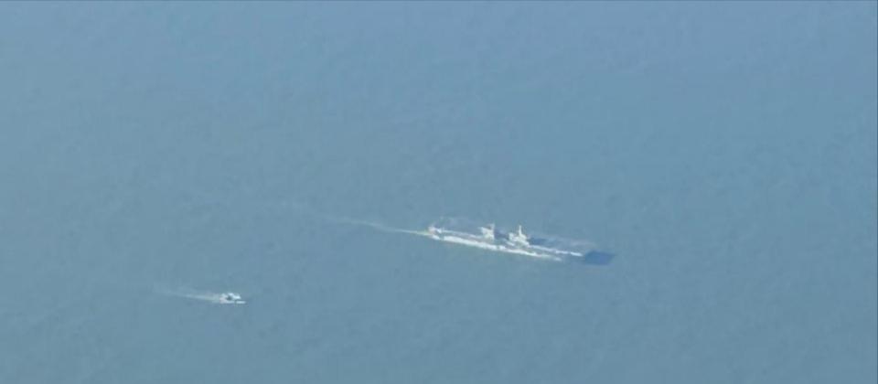 正在进行首次海试的“四川”号两栖攻击舰,旁边还有艘伴随的小船,舰艉拖着长长的尾流。首次海试主要是为了验证舰艇的动力和电力等系统的可靠性和稳定性,所以短时间内我们暂时看不到固定翼舰载机弹射起飞和降落。