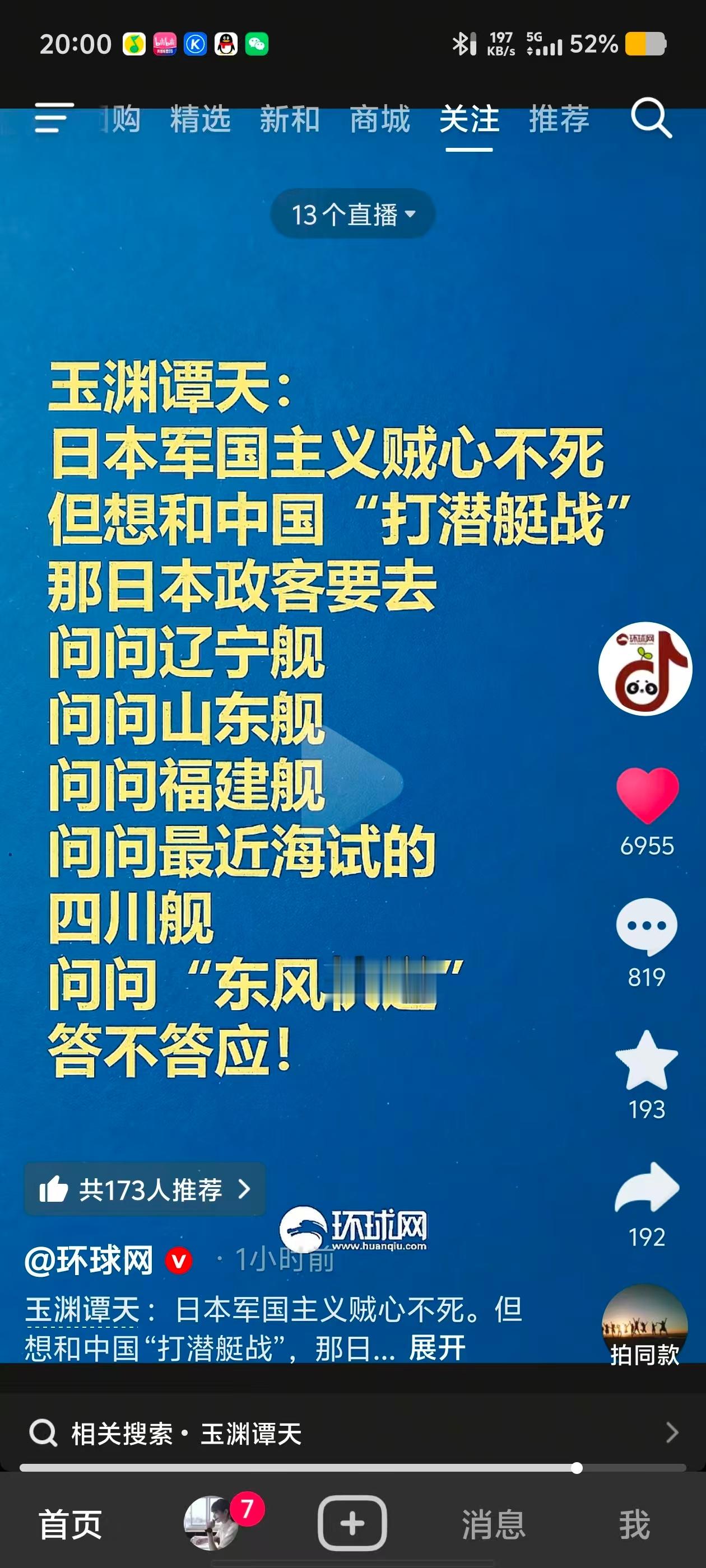 玉渊谭天:日本军国主义贼心不死但想和中国“打潜艇战”那日本政客要去问问辽宁舰问问山东舰问问福建舰问问最近海试的 四川舰问问“东风快递” 答不答应!