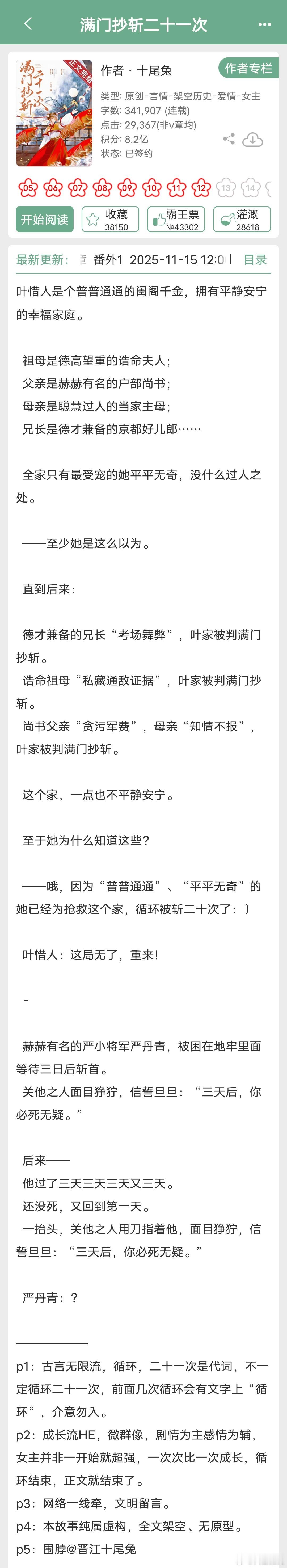 十尾兔的《满门抄斩二十一次》正文完结了,蹲蹲大家的反馈,好看我就冲了