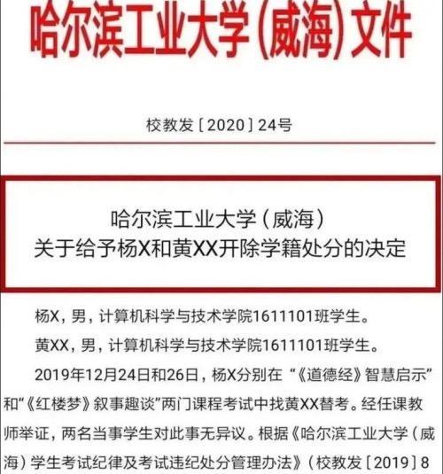 如何看待哈工大两名大四学生因作弊被开除学籍? 是之前知乎热搜问题的题主。 近日,哈工大威海校区一份处分决定引起网友热议。文件称,该校计算机科学与技术学院大四学生杨某,在两门考试中找黄某某替考,两人因考试作弊被开除学籍。这件事你怎么看呢? ------------------------------------ 记得刚上大一班主任和导员都说过,考试看别人的可以,被发现老实点,老师让你直接交卷就交,小抄被发现也没事,老师让交卷就赶紧交,出来跟导员说一下,但是千两件事千万不能干,一个是替考,一个是和监考老师犟,学校所有因为考试作弊被抓开除的,都是这俩原因。