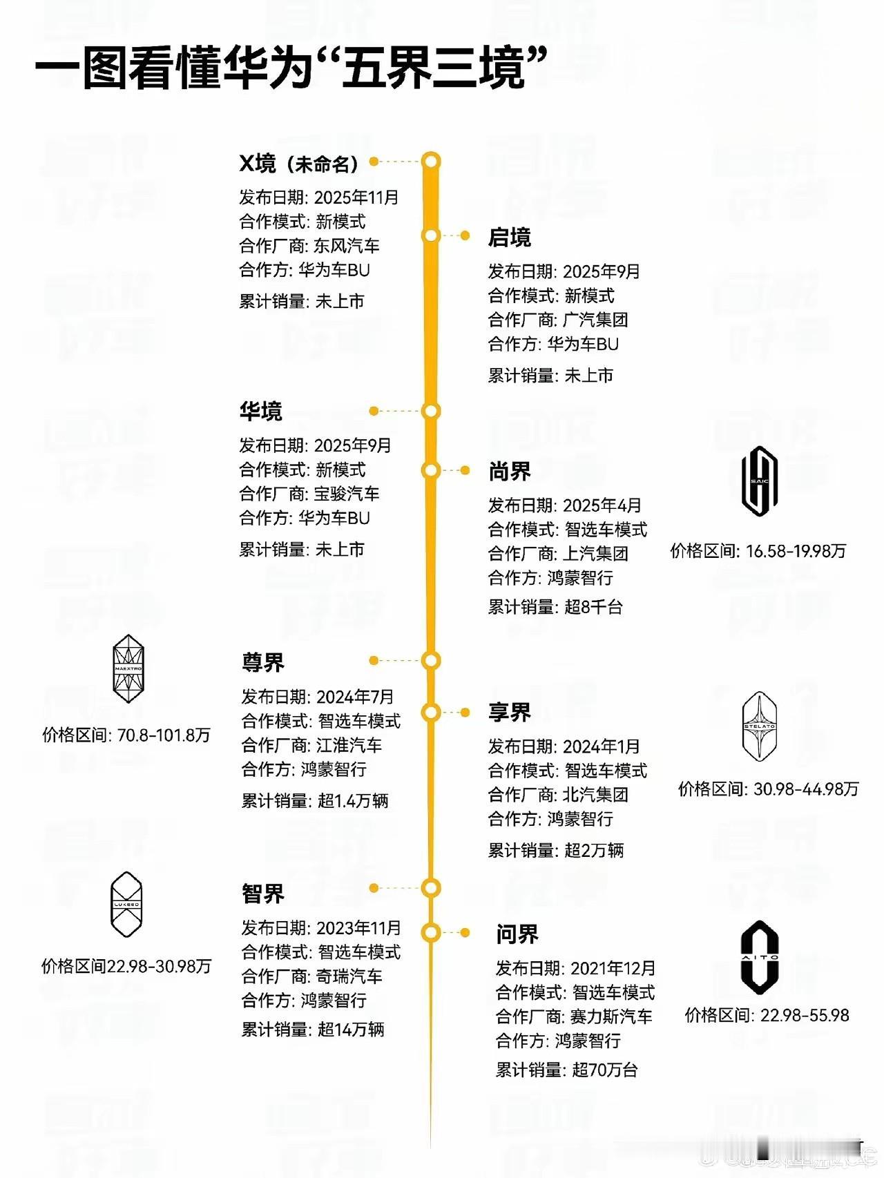 与华为合作的五界三境都卖了多少车?都是什么来头? 看明白没有,虽然都是与华为合作,但还是有些区别的,五界都是跟华为旗下的鸿蒙智行合作的,也就是余大嘴的团队,而三境是这两年刚刚开始的,是与华为旗下的车BU合作的,也就是徐直军的团队。 实际上从销量来看,目前的五界只有问界勉强说的上算成功,其它四界都是雷声大雨点小,表现只能算是一般;至于三境目前都还处于开发阶段,没有车型投放,未来前景未知,在本月的华为生态大会上,与东风、广汽合作的两境都将进行发布。 关于华为的五界三境你还知道哪些?
