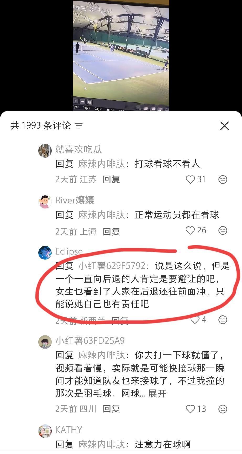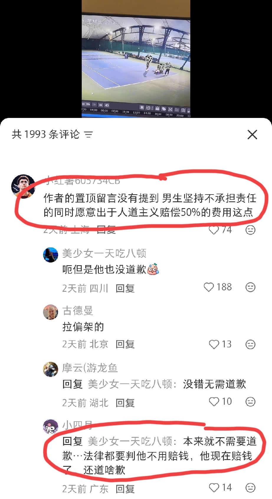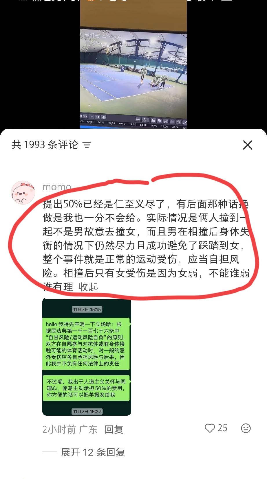 发生在网球场上的意外! 一男一女搭档打双打,此前男子一直在网前,女的一直在后场接球,可能是看到对方的回球过浅吧,男子往后退接球,女子也快速往前接球,两人就这样撞在了一起,女子就倒在了地上…… 后续是:男子坚持不承担责任的同时,愿意出于人道主义赔偿50%的费用! 就这个事情上,男子到底要不要承担责任?要承担多少责任,在网上展开了大讨论。 有网友认为男的不需要道歉,这不是自甘风险的事情嘛。 也有网友表示:明明是后场球,这个男的就这么后退救球,还把人撞了,难道就不需要道歉吗? 评论区的诸位大神,你们怎么看这个事情?
