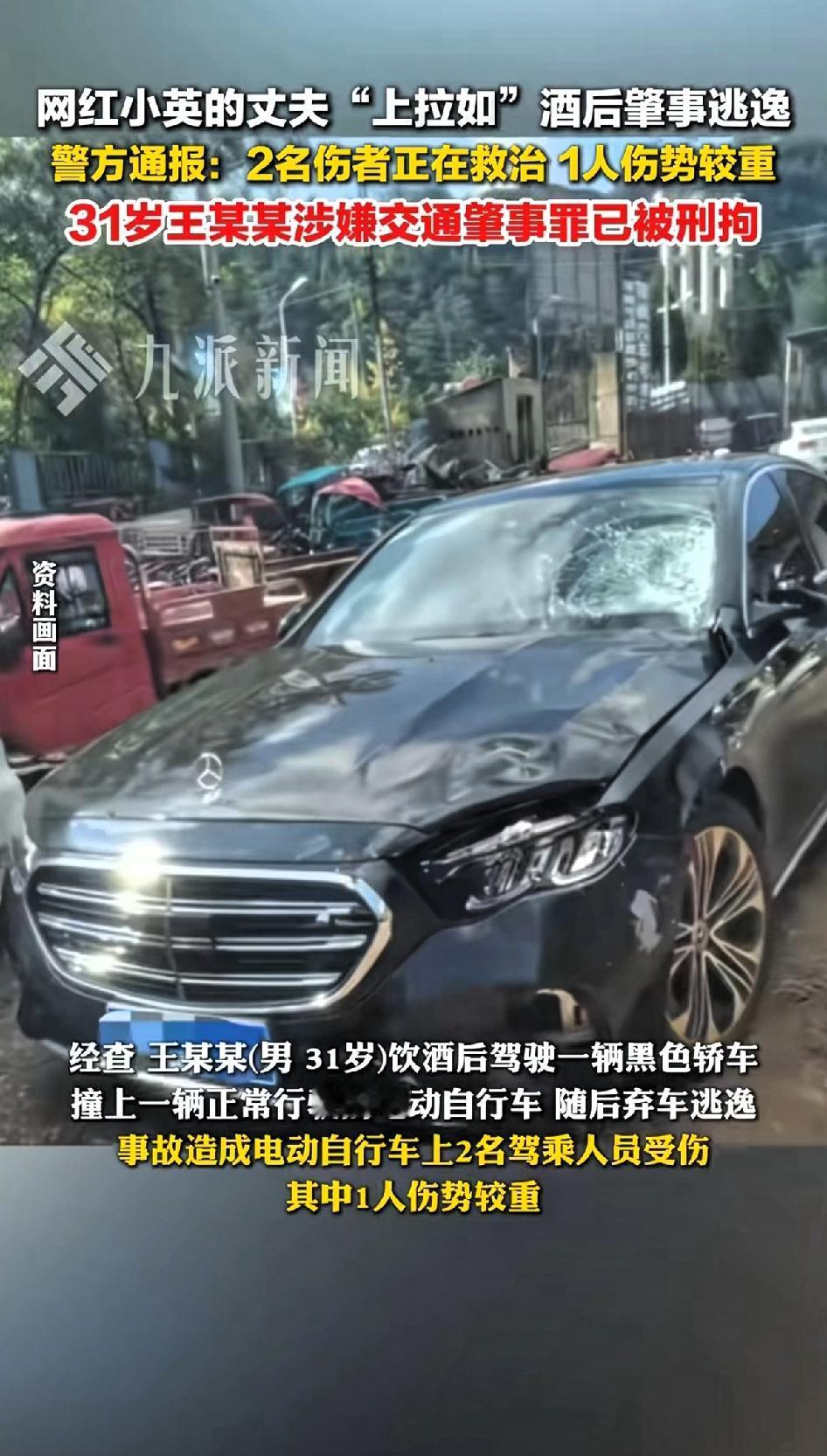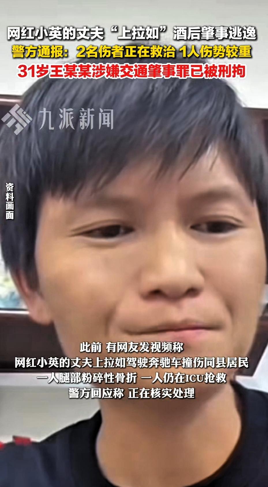 网红小英的丈夫“上拉如”酒后肇事逃逸,警方通报:2名伤者正在救治,1人伤势较重。 “上拉如”这次可摊上大事了。11月12日凌晨,他酒后驾驶黑色轿车撞上正常行驶的电动自行车后弃车逃逸。 被撞的两人受伤,一人伤势重。网友爆料,一人腿部粉碎性骨折要手术,另一人重伤昏迷在ICU。 “上拉如”真名王拾富,已因涉嫌交通肇事罪被刑拘。小英原名杨早英,“小英一家”抖音有439.2万粉丝。 10月份“网名小英”发声说自己跟丈夫“上拉如”因感情不合正在办理离婚手续,因丈夫要买车二人发生分歧。 丈夫提出财产分割,小英抖音粉丝有400多万,上拉如要求以一个“粉丝”一元钱的价格进行分割。 看来小英早就知道丈夫的本性,不让他买车也是知道迟早会出事,这种人获得巨额的财富只会害别人,损害别人的生命安全。建议严惩肇事者。 肇事逃逸实在不该,只希望伤者能早日康复。