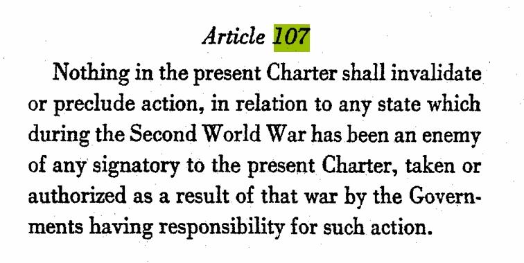 日本不要健忘 不要在台湾问题上玩火 《联合国宪章》有一个“敌国条款”。依然有效。 作为第二次世界大战的战败国,日本是《联合国宪章》特设的“敌国条款”所针对的主要对象。 宪章第107条明确规定,“本宪章并不取消或禁止负行动责任之政府对于在第二次世界大战中本宪章任何签字国之敌国因该次战争而采取或受权执行之行动”。 英文在下图