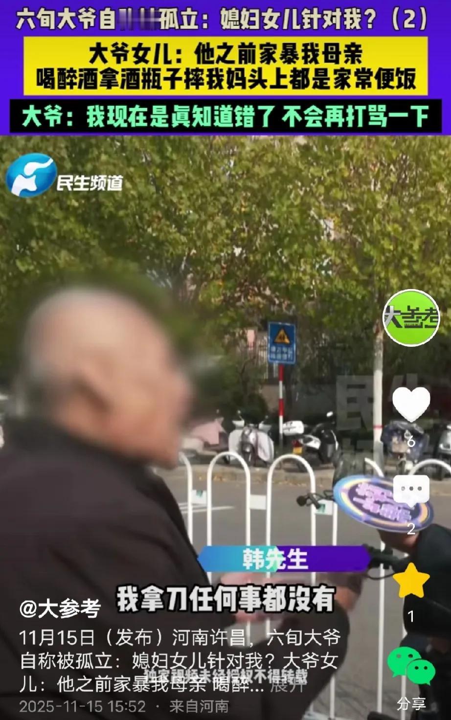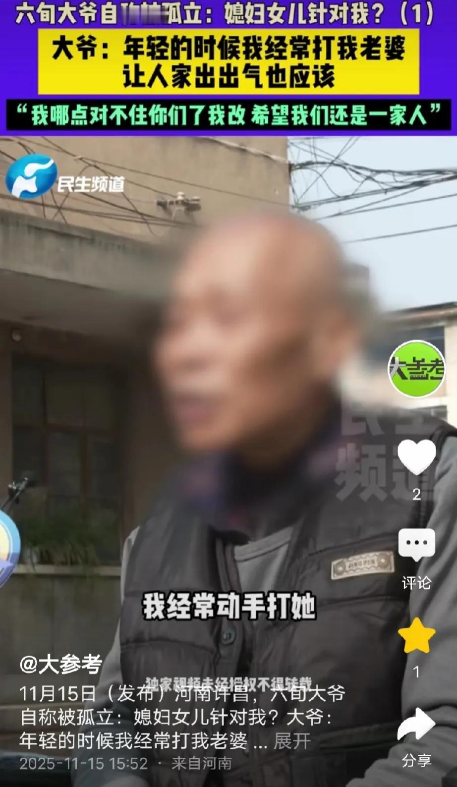 河南许昌,60岁大爷腿脚不便,跟妻子吵了两句,妻子左右开弓给他2巴掌,一周后大爷被妻女送去养老院不管不顾,妻子还把每月600的零花钱降到300,大爷委屈求助媒体: 我年轻的时候经常打老婆,让她出出气也应该。女儿抱怨:他常年家 暴我母亲,醉酒后拿酒瓶砸我母亲头上,让他闹吧,看他能翻多大的天。大爷哭诉,我错了,希望你们原谅我。网友:他这是咎由自取。 韩大爷60多岁,因为腿脚不便得常年坐在轮椅上,韩大爷有一个闺女,他的妻子也不算太老,但是她们却对韩大爷不管不顾。 韩大爷觉得很委屈,找到媒体求助,希望记者能帮帮他,解调一下他们一家三口的关系。 韩大爷告诉记者,2024年4月初,他因为一点小事跟妻子吵了两嘴,妻子气得上前就左右开弓,给了他2巴掌。 当时周围有很多人,但妻子一点不给他面子,直接就打,大爷因为腿脚不便,无力反抗,也不想反抗。 大爷原本有个代步工具,但也被妻子用棒球棍给砸坏了,从那之后,大爷就只能坐轮椅。 2024年4月中旬,大爷的妻子和女儿把他送到养老院后,就很少过问,大爷每个月2200元的退休金被他妻子控制着,一开始付了养老院的费用后,妻子每月还给他600元零花。 谁料,第二个月开始,妻子就把零花钱降低了一半,每月只给300。 大爷不服,质问妻子,你这是想气死我吗,妻子怒气冲冲回答他说,你早该死了。 大爷委屈透了,人到老年,身体开始出现各种各样的问题,本是需要家人关心、陪护的年纪,可他却遭受这样的待遇。 虽然,年轻的时候,他做得很过分,但他知道错了,都说知错能改善莫大焉,他希望媒体介入后妻子和女儿能给他改过自新的机会。 记者根据大爷提供的号码,联系了他的女儿韩女士。 韩女士气愤地告诉记者,但凡是一个有良知的人,都不可能在父亲60岁的时候,不管他,一定是他中间做了很过分的事情让人忍无可忍,才会这么做。 韩女士记得,从她懂事起,记忆中父亲经常家 *暴母亲,母亲每天过得心惊胆战,有时父亲喝醉酒,他当着女儿的面,拿着酒瓶直接砸到母亲头顶上。 韩女士清楚的记得,有一次,父亲给她打电话说,在弄没你母亲前,我要先弄没你。 小的时候,韩女士常常想,为什么母亲的命这么苦,找了父亲这么个人,而自己到底上辈子做错了什么,有这样一个父亲。 韩女士说,她跟父亲最后一次见面是因为两人吵架,父亲拿着刀走向她,从那之后,她就心死了,也不再见父亲。 韩大爷说,他虽然拿着刀,但什么事都没干。 韩女士告诉记者,她不想再理会父亲,他有多大本事就翻多大的天,她就当个不孝女了,她不怕丢人。 记者告诉韩女士,这一次她不想说劝和不劝分,她尊重韩女士和她母亲的做法,也支持韩女士保护好她母亲。 接着,记者告诉韩大爷,你当年打老婆、没当好爹,现在你需要家人了,但当初他们需要你的时候你没做到。我不会劝你老婆女儿原谅你,原不原谅是她们的事儿,不是义务。 面对镜头,韩大爷很诚恳地跟妻子和女儿道歉“我真的知道错了,不会再打骂,希望你们能原谅我,再给我一次机会,我们一家人好好的。” 有人说,真是活久见!年轻时把老婆往si里打,醉酒拿酒瓶摔头顶、持 刀威 胁妻女,把家人逼得心惊胆战,老了腿脚不便需要人伺候了,倒想起“一家人好好的”? 挨两巴掌、住养老院就委屈得找媒体卖 惨,一句“我错了”就想抹平几十年的家 暴创伤,算盘打得全国都听见了! 当初施暴时多嚣张,现在装可怜就多可笑,300块零花钱都嫌少,咋不想想当年老婆女儿过的是什么日子? 根据《反家庭暴力法》第2条规定,本法所称家庭暴力,是指家庭成员之间以殴打、捆绑、残害、限制人身自由以及经常性谩骂、恐吓等方式实施的身体、精神等侵害行为。 本案中,韩大爷年轻时长期对妻子实施家暴,醉酒后拿酒瓶砸妻子头部,还曾持刀威胁妻女、言语恐吓要“弄死”家人,其行为完全符合该法条对家庭暴力的定义,属于典型的身体与精神双重侵害,给妻子和女儿造成了长期且严重的心理创伤与生理风险。 而妻子后续打耳光、砸坏代步工具的行为,虽带有报 复性质,但本质也是家庭暴力的延伸,双方的冲突根源在于韩大爷早年家 暴行为埋下的隐患。 这也是妻女难以原谅、拒绝共同生活的核心原因,同时也印证了记者“原谅不是义务”的观点,凸显了法律对家庭暴力零容忍的态度。 我想说,家暴从来不是“过去式”,而是刻在家人心上的永恒伤疤。 韩大爷晚年的孤独与委屈,看似值得同情,实则是早年施暴种下的苦果。 婚姻里的拳头、醉酒后的暴行、对妻女的kong吓,早已耗尽了家人的温情与信任。 “知错能改”从不是晚年需要依靠时的敷衍道歉,而是施暴当下的幡然醒悟与长久弥补。 这个案例也警示我们,家庭的温暖源于尊重与善待,暴力只会摧毁亲情的根基。唯有以爱与责任经营家庭,才能在晚年收获真正的陪伴与心安。 对此,大家怎么看? @猫眼学法