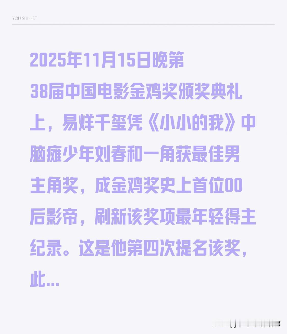 2025年11月15日晚第38届中国电影金鸡奖颁奖典礼上,易烊千玺凭《小小的我》中脑瘫少年刘春和一角获最佳男主角奖,成金鸡奖史上首位00后影帝,刷新该奖项最年轻得主纪录。 这是他第四次提名该奖,此前凭《少年的你》等三部影片获提名。为演好无台词的刘春和,他提前三月去康复中心体验,减重18斤,表演获称赞,张艺谋等前辈也认可其努力与演技。