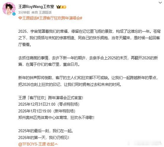 王源邀你跨年!郑州 “客厅狂欢” 演唱会定档,沉浸式互动 + 烟火秀,跨年夜共赴双向奔赴。