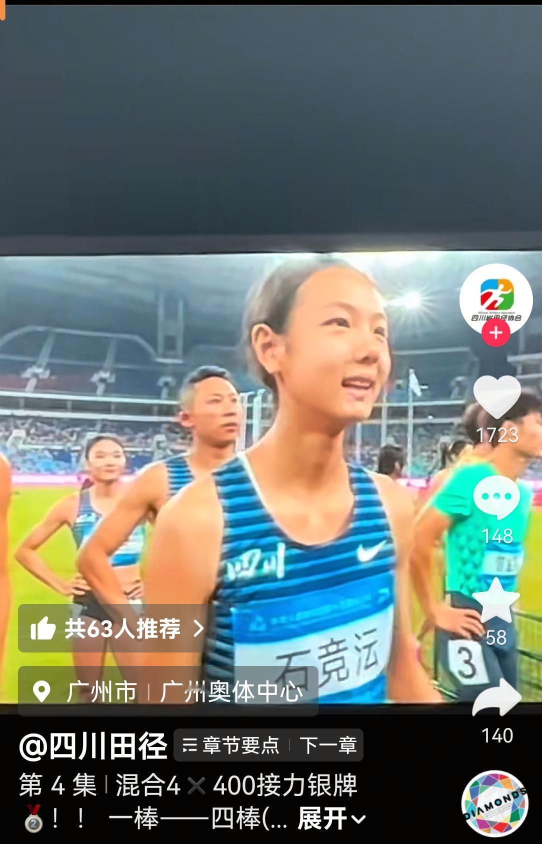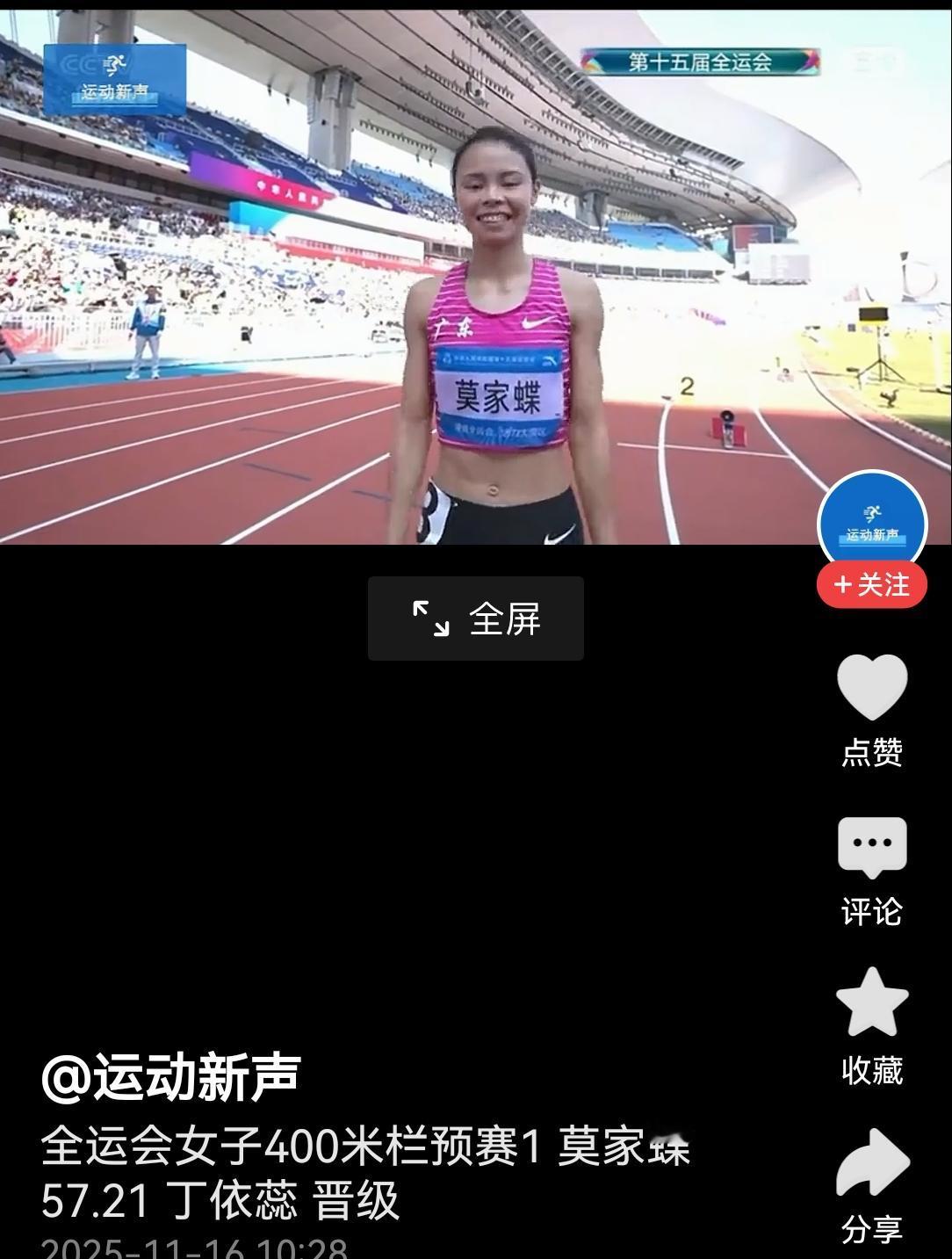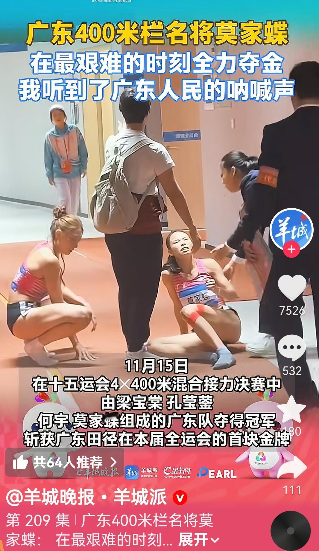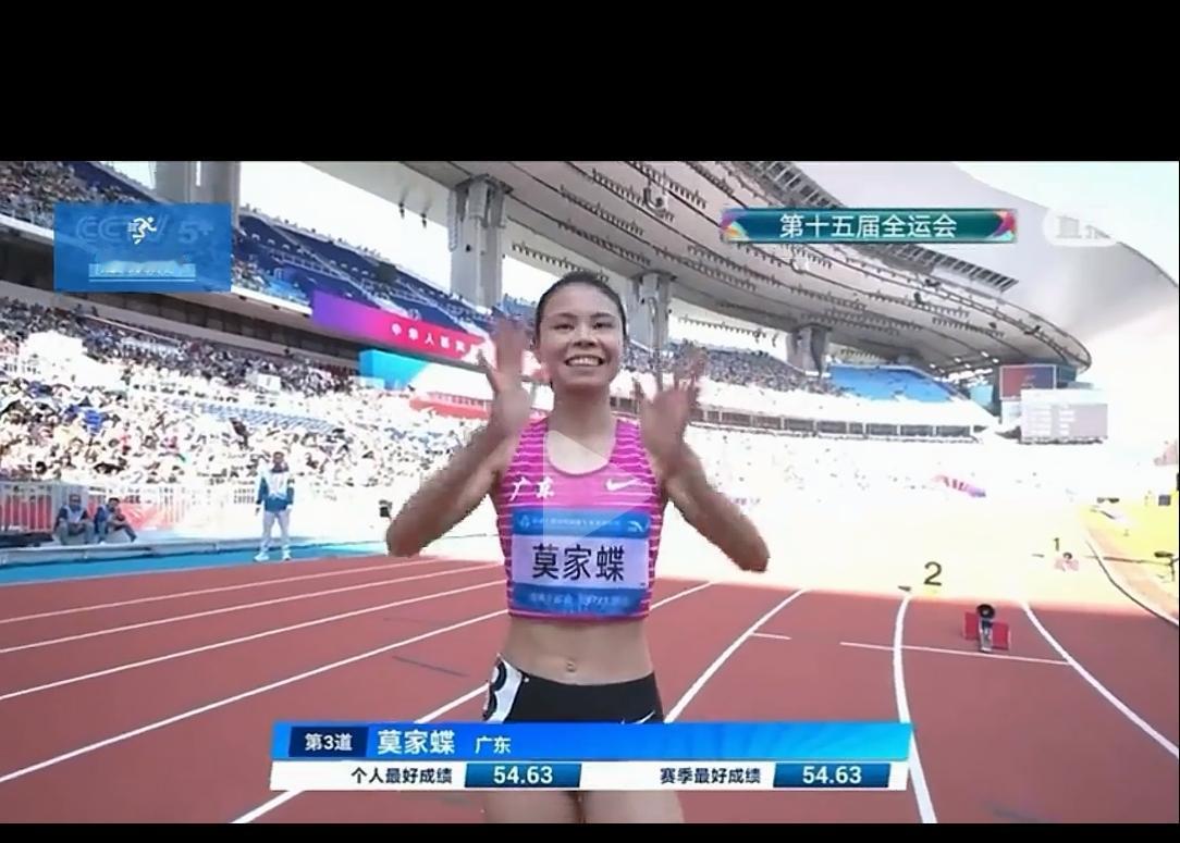 全运会4×400米混合接力虽然广东队夺冠,但也是有巨大的损失。最后一棒的莫家蝶,因为被刘英兰追的太厉害,拼尽了全力,赛后只能躺在地上,被队友孔莹蓥背出场地。有图有真相。 这一个后果,第二天就出来了。在400米栏的预赛,莫家蝶虽然是第一,但是成绩是57.21,距离自己的PB54.63整整慢了2.58。 后面莫家蝶还有400米栏决赛和400米的预赛决赛,以及4×400米接力预赛决赛。 我看好400米决赛上刘英兰能拿到这个冠军。因为刘英兰比莫家蝶年轻5岁。 同时,在女子400米接力比赛,因为四川队除了刘英兰,还有双胞胎姐妹,石竞沄,石竞沛,我也看好四川队夺冠。 看图看真相。