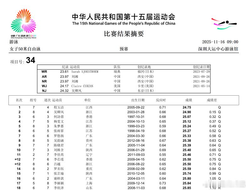 全运游泳女50自预赛开战六大热门包揽前六 香港泳后要争第三冠难度陡增11月16日上午,全运会游泳大项开始第七比赛日竞争,在首先结束的女子50米自由泳预赛里,江西选手程玉洁以24秒75排名第一。已经拿下100自和200自双冠的香港选手何诗蓓也参加了50自竞争。但这个项目,何诗蓓在中国选手里优势不足。今年世锦赛吴卿风以24秒26获得亚军,程玉洁24秒28获得季军。张雨霏也在23年世锦赛和巴黎奥运会上收获铜牌。何诗蓓最好成绩是24秒30,国际大赛最高成就是杭州亚运会亚军。今天在第六组出场的何诗蓓,以25秒07拿到小组第一,张雨霏25秒27小组第二。第七组出场的程玉洁游出24秒75,江苏选手杨雯文25秒12小组第二。第八组吴卿风轻松杀出24秒90第一,朱梦惠25秒24小组第二。最后三组这六位选手,就是预赛前六选手。排名依次是程玉洁,吴卿风,何诗蓓,杨雯文,朱梦惠和张雨霏。没有大冷出现的话,决赛前三将在这六人里产生。今晚19点40分和19点45分,将进行该项目半决赛争夺。