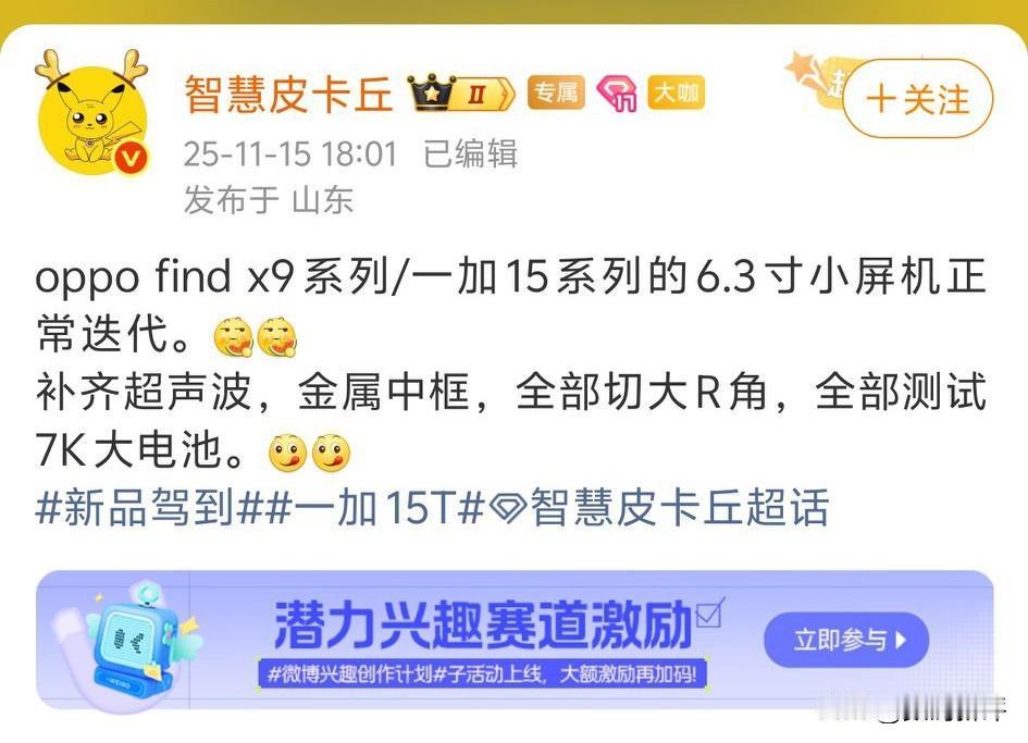 OPPO一加明年小屏机都是7千毫安电池!都会升级超声波指纹,那么这一代配置给的比较全的情况下,下下代是不是就只有升级电池容量和影像了[笑哭]但是小屏机升级影像也有限,总不能每年就是换处理器和屏幕,增大电池容量吧[捂脸]如果是这样的话那没什么看点了