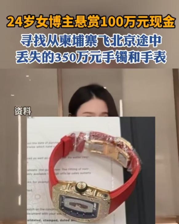 北京,女子乘坐飞机从柬埔寨到北京,350万的手镯和手表丢失,她愿意悬赏100万寻找。北京机场已经调取监控核实没有问题,柬埔寨的德崇机场也称没有问题,不过女子要求对方提供相应监控。直到现在,对方还没有提供。   11月13日傍晚,网红博主Yara奶油的社交账号更新了一条置顶动态,悬赏金额从40万飙升至100万,只为找回从柬埔寨金边飞北京途中丢失的350万首饰。   这条带着红底白字悬赏公告的动态,一夜之间炸穿了社交平台,谁会把百万珠宝托运?100万悬赏是真心寻物还是刻意炒作?   更蹊跷的是,中柬两国机场的监控都称“完美无缺”,可宝贝偏偏不翼而飞。   这起天价失窃案的起点,要拉回到11月10日的金边德崇机场。   24岁的蒋女士结束柬埔寨旅行,将刚买的12万美元手镯和260万港币理查德米勒手表,裹进软布塞进首饰盒,再放进行李箱托运。   当时觉得箱子锁得牢,又是正规航司,没多想,事后接受采访时,蒋女士语气里满是懊悔。   当北京首都机场T3航站楼的行李传送带吐出最后一个箱子时,凌晨的凉意顺着裤脚往上窜。   蒋女士蹲在地上开箱的动作很轻,可看到首饰盒里空空如也的瞬间,她的手控制不住地抖。   她第一时间报了警,跟着民警把行李从卸货到传送的监控看了三遍。   监控画面里,穿着反光背心的工作人员按流程装卸,行李车平稳行驶,传送带旁也没有可疑人员逗留。   北京这边的监控连行李箱的划痕都拍得清,确实没问题,排除北京机场的嫌疑后,蒋女士的怀疑全部集中在金边德崇机场。   毕竟从装机到起飞,只有那里的人接触过行李,11月11日的40万悬赏石沉大海后,蒋女士咬牙把赏金翻倍。“   不是钱多烧的,是这两件东西对我有特殊意义,她坦言,手镯是在柬埔寨谈成一笔重要合作后买的纪念,手表则是家人送的生日礼物。   悬赏公告下,评论区分成了两派:有人晒出自己在金边机场托运丢过防晒霜的经历,印证“当地行李盗窃传闻不是空穴来风”。   也有人翻出蒋女士的旅行视频,质疑平时那么细心的人,会犯托运百万珠宝的错?”   比网友质疑更让蒋女士头疼的,是跨境调查的僵局,她托柬埔寨朋友报案后,国航多次联系金边德崇机场,对方每次都以“监控查过了,没异常”回应。   可当索要完整监控录像时,要么说“系统故障调不出来”,要么就石沉大海。   北京警方表示,已通过国际司法协助渠道对接,但流程复杂,至少需要15个工作日才能有初步反馈。   如今,蒋女士的社交账号还挂着百万悬赏,评论区每天都有网友催更进展。   这起案件早已不是一个博主的个人遭遇,而是戳中了跨境出行的痛点:当旅客把行李交给机场,交出去的不仅是物品,更是对安全的信任。   可当监控成了“不愿示人的秘密”,当理赔上限低到形同虚设,这份信任该如何安放?   机场安检口的提示牌早已写得明明白白:贵重物品请随身携带。   可总有人像蒋女士一样,抱着“不会那么倒霉”的侥幸,这起百万悬赏案的后续还未可知,但有一点已经明确。   比起事后花百万悬赏,事前把贵重物品揣进怀里,才是最靠谱的选择。   而那些“完美无缺”却不愿公开的监控,更该成为跨境运输监管亟待补上的漏洞。