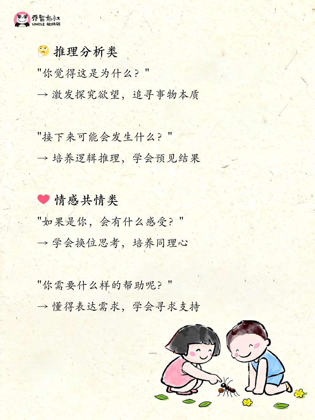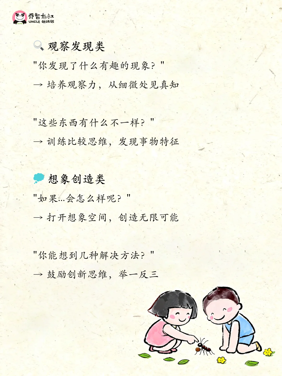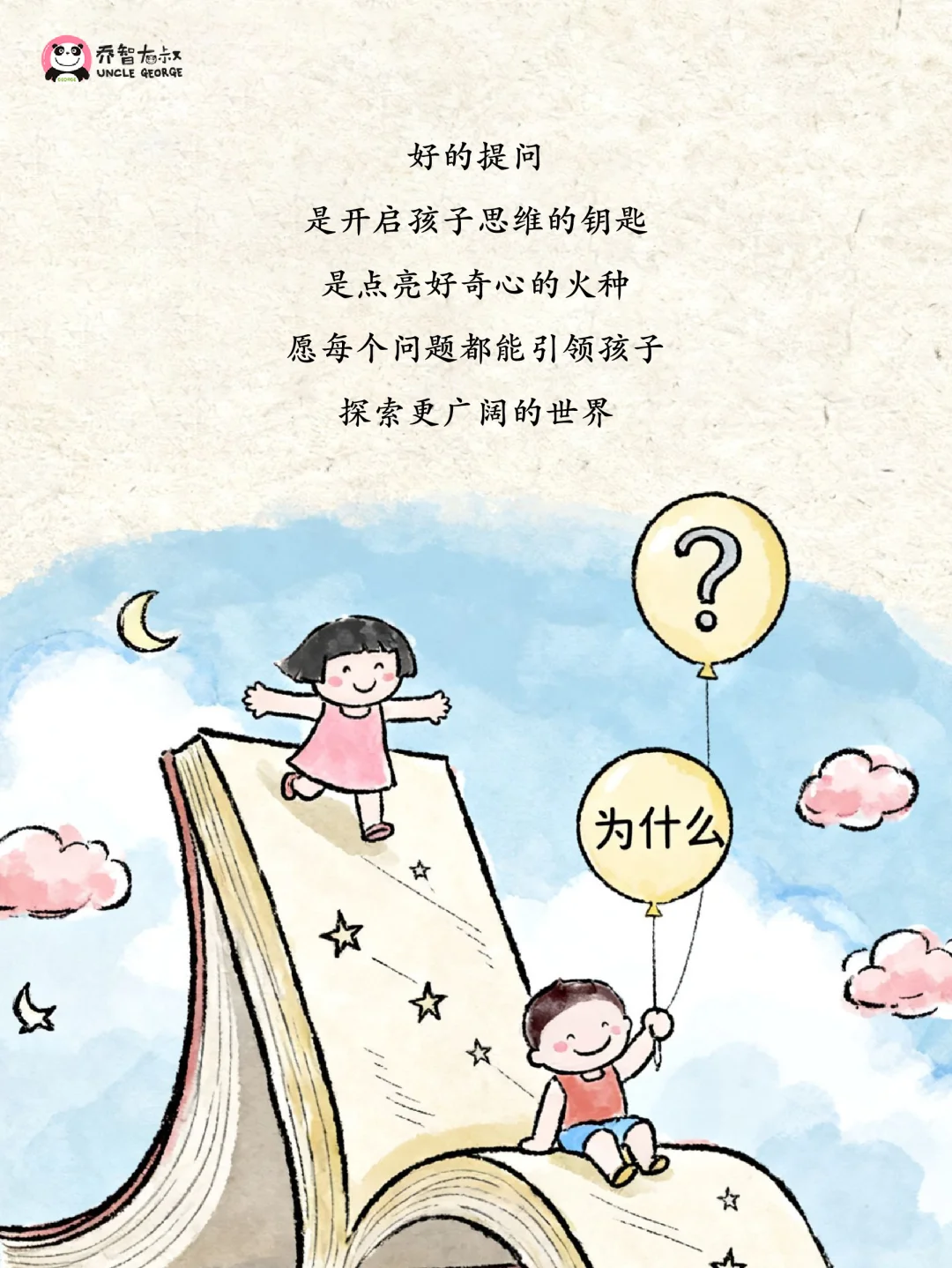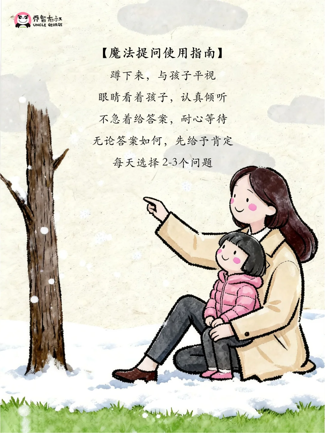 魔法提问使用指南 · 蹲下来,与孩子平视 · 眼睛看着孩子,认真倾听 · 不急着给答案,耐心等待 · 无论答案如何,先给予肯定 · 每天选择2-3个问题 好的提问 是开启孩子思维的钥匙 是点亮好奇心的火种 愿每个问题 都能引领孩子 探索更广阔的世界