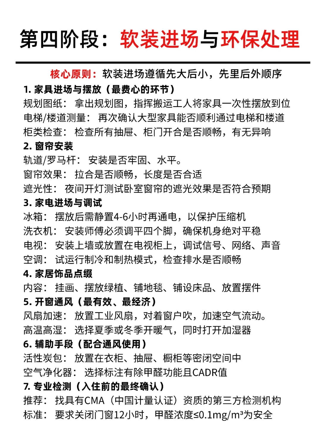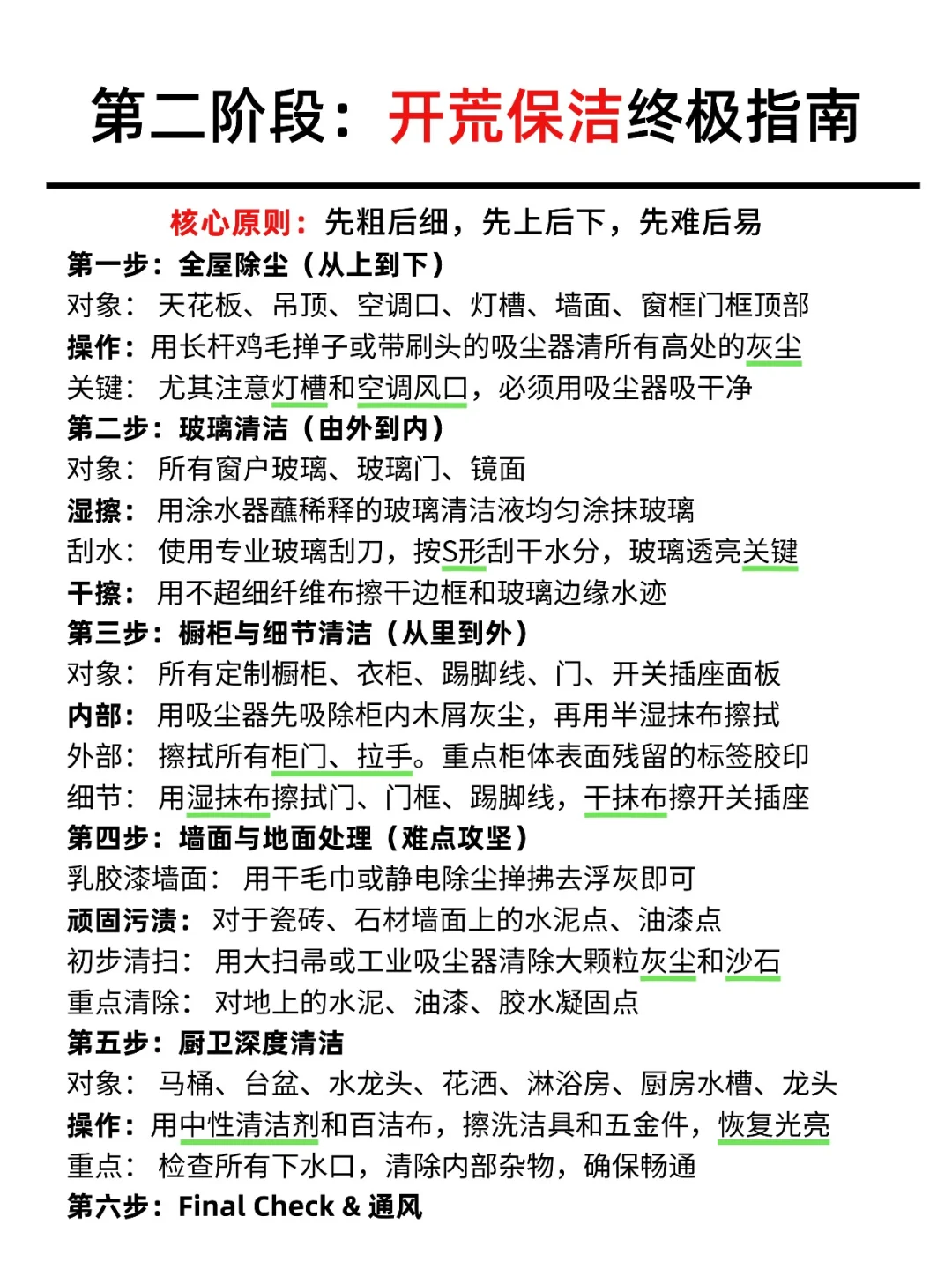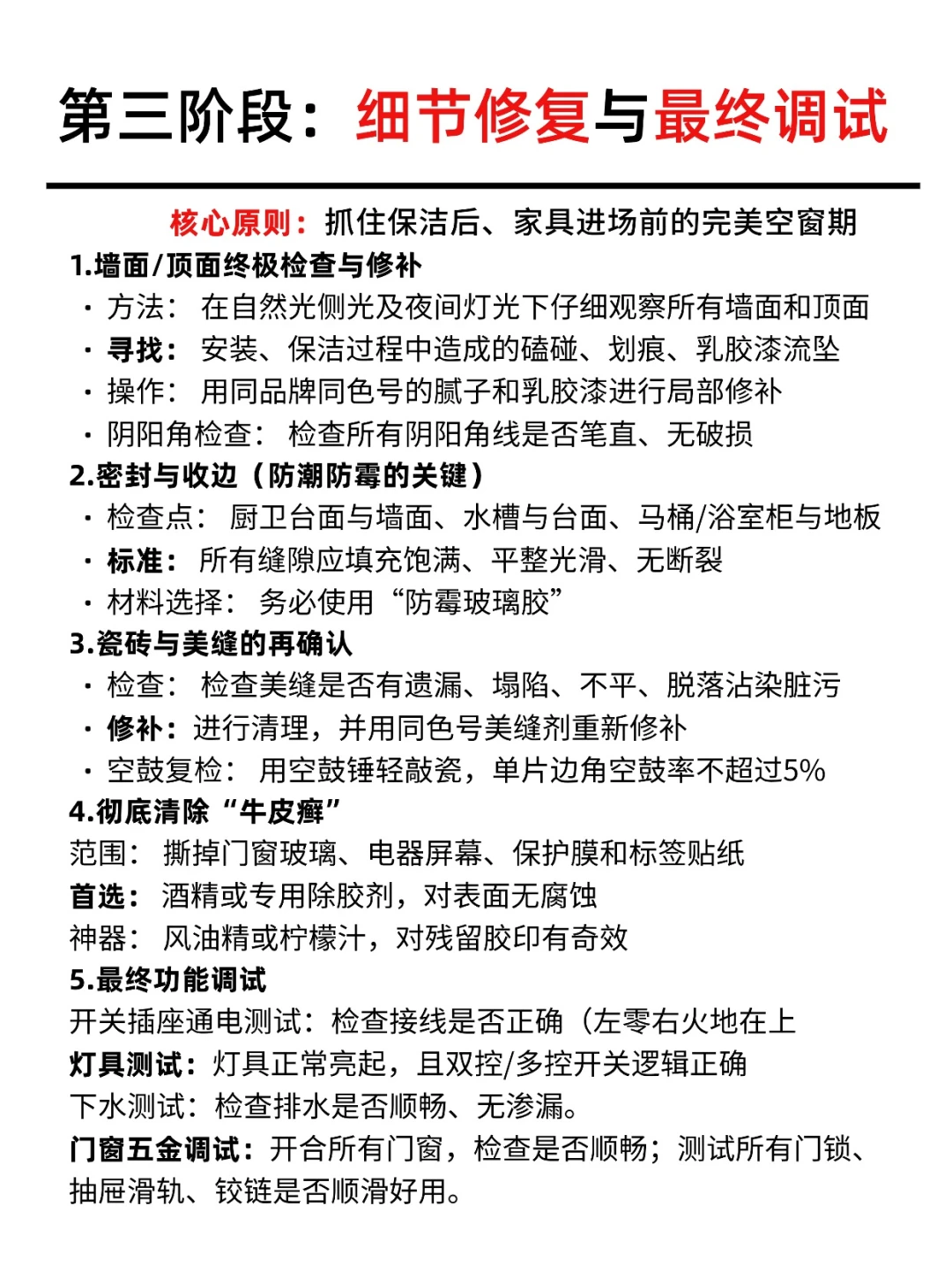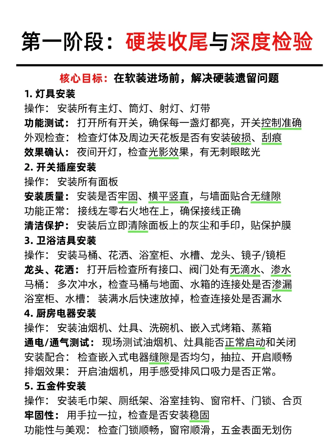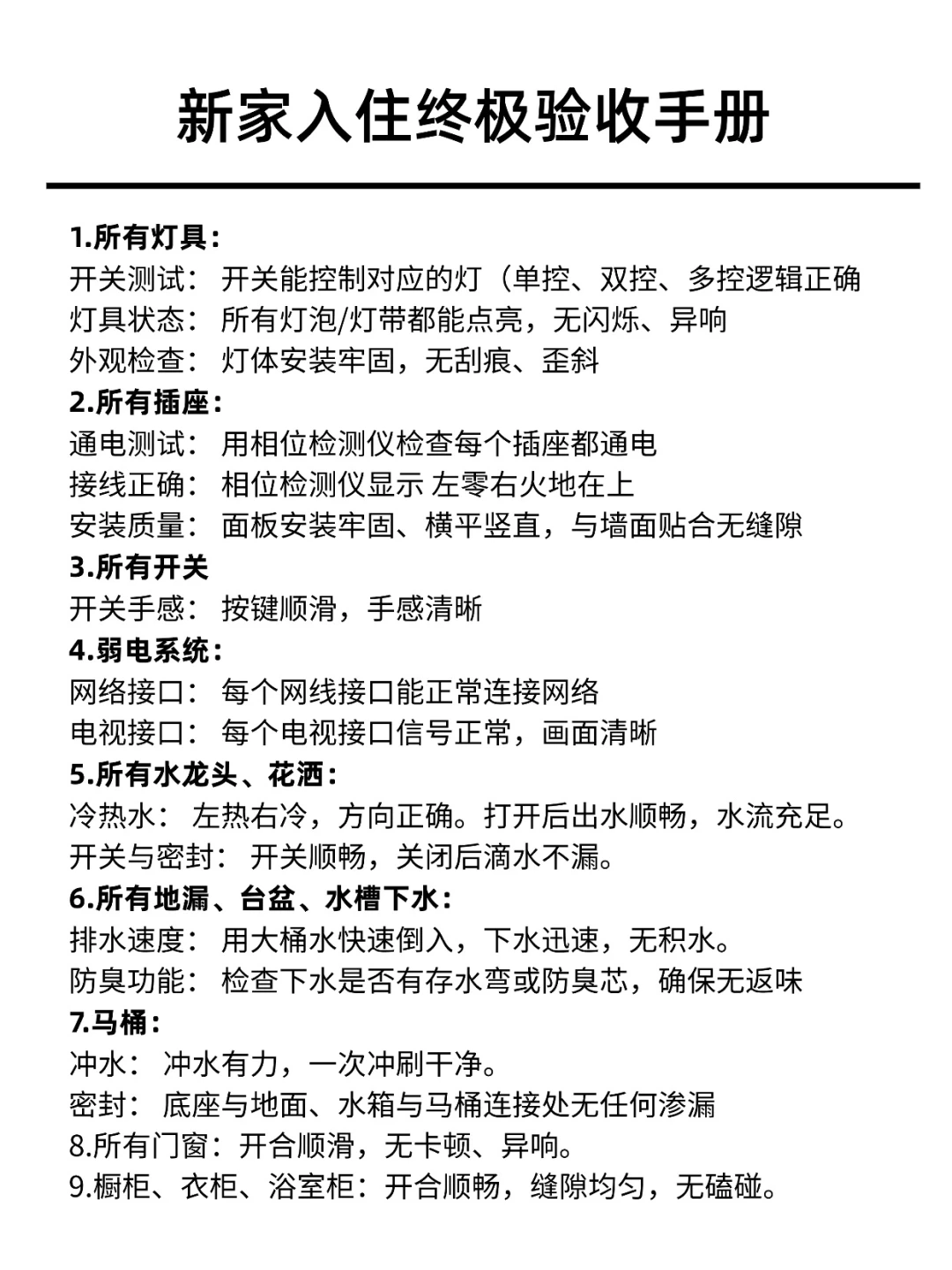 硬装结束才是关键!这4步收尾工作做不好,几十万装修打水漂。 今天把从业15年的验收秘籍一次性公开,照着做0踩坑! 第一步:硬装终极找茬(保洁后立即做) ✔️ 灯光下检查墙面:侧光看流坠、刷痕,晚上用射灯看波浪纹 ✔️ 玻璃胶收边:台面、马桶、水槽边缘重打防霉胶 ✔️ 美缝排查:重点检查脱落/凹陷处,及时修补 ✔️ 空鼓复查:用硬币敲瓷砖,空鼓砖立即标记返工 ✔️ 标签大扫荡:酒精+鱼鳞布擦净所有胶印 (💡关键:趁家具进场前把墙面磕碰、玻璃胶发霉等问题一次性解决) 第二步:开荒保洁生死线(按这个顺序省力3倍) 1️⃣ 吊顶除尘→2️⃣ 玻璃清洁→3️⃣ 柜体擦拭→4️⃣ 墙面除尘→5️⃣ 地面攻坚 ✨ 专业团队必备:大型吸尘器+玻璃刮+铲刀套装 ✨ DIY重点:水泥点用塑料铲刀,胶渍用除胶剂,千万不能用钢丝球! 第三步:软装进场排序(乱一步多干3小时) 🚚 正确动线:家具→窗帘→家电→装饰品 👉 家具保护:提前铺好地膜,尖锐角包防撞条 👉 窗帘时机:等大件家具就位再装,避免刮花 👉 家电调试:冰箱静置4小时,洗衣机必须调平! 第四步:甲醛(科学醛抄作业) 🌪 王者方案:工业风扇对着窗口吹,制造强对流 💦 暴击组合:空调30℃+加湿器,关门闭窗4小时再开窗,效率翻倍 🛡 辅助神器:柜子塞活性炭(20天换一次),空间用净化器 📊 终极验证:找CMA机构检测,密闭12小时≤0.1mg/m³才安全 最后附上终极查房清单(图6) 所有开关/插座/地漏/门窗逐个过,发现瑕疵立即贴标签整改!尾款压10%等全部问题解决再付!