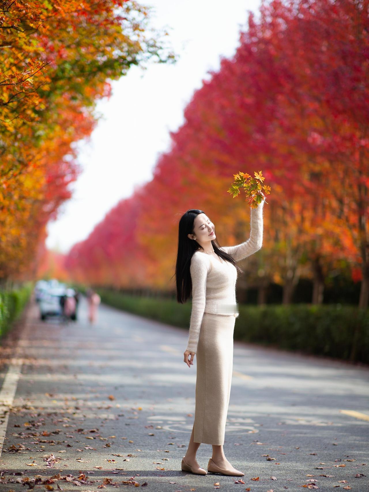 风把秋意揉进每片枫叶里,铺成一条通往绯色梦境的路。她踩着碎金般的落叶走进去,指尖