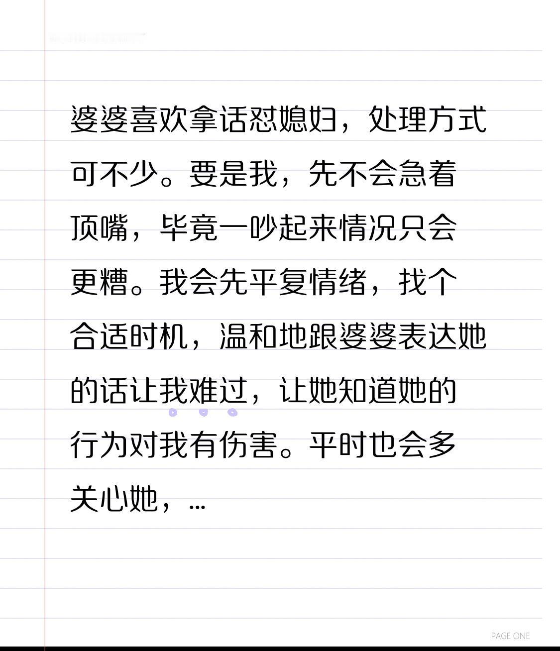 婆婆喜欢拿话怼媳妇,处理方式可不少。要是我,先不会急着顶嘴,毕竟一吵起来情况只会更糟。我会先平复情绪,找个合适时机,温和地跟婆婆表达她的话让我难过,让她知道她的行为对我有伤害。 平时也会多关心她,送点小礼物、做她爱吃的菜,说不定能让她态度转变。要是婆婆脾气倔,一时改不了,就和老公商量,让他从中调和。像有的媳妇直接怼回去,甚至动手,这可能会让关系更僵。也有人一开始忍着,忍到极限大吵一架后,婆婆反而不敢随意发火了。总之,处理婆媳关系得有点耐心和智慧。