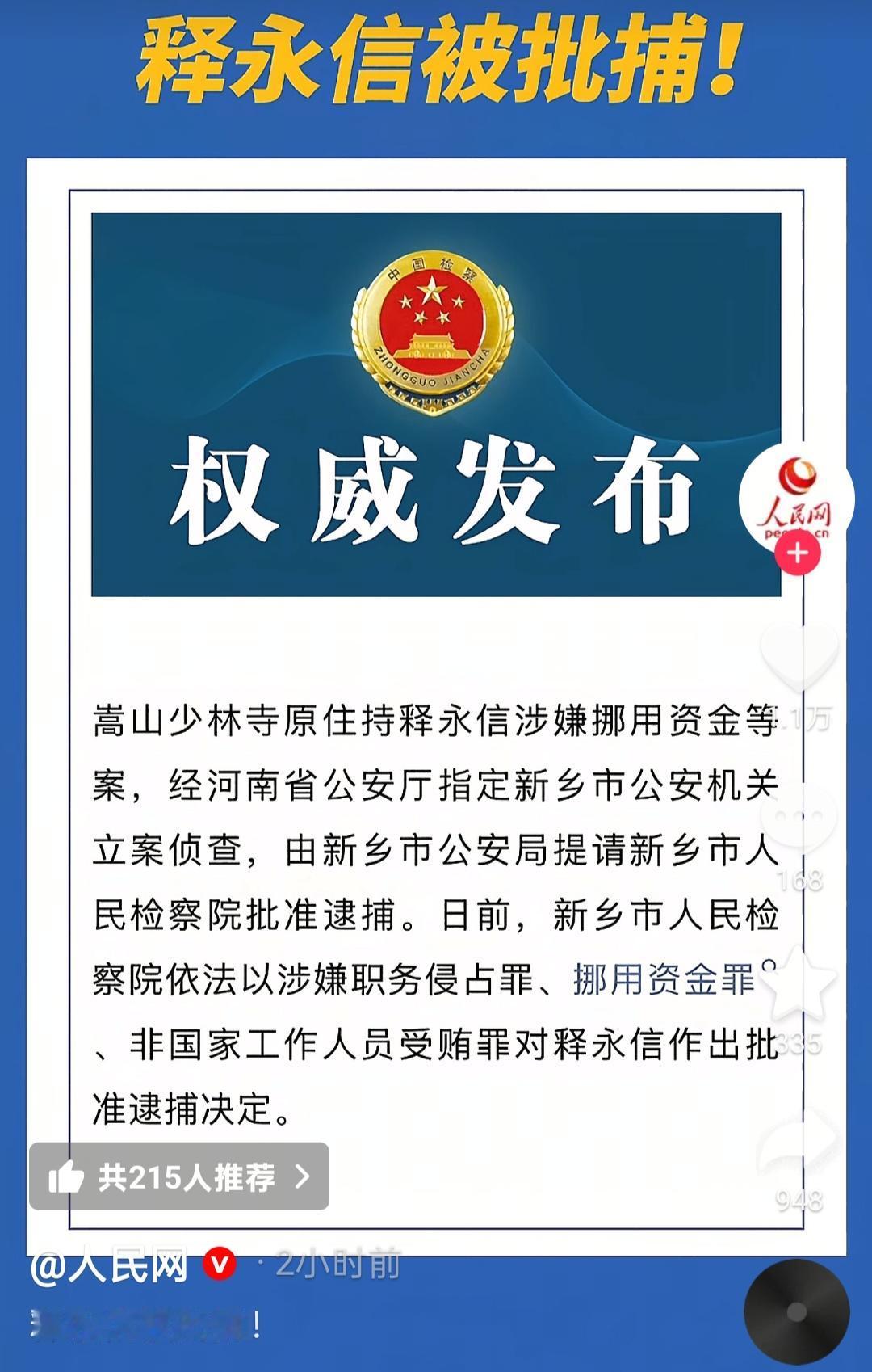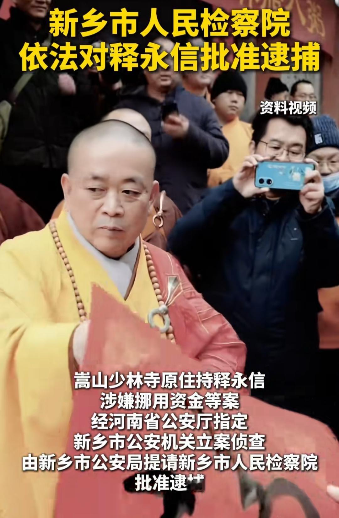 一代"高僧"释永信终究受到法律严惩了。 11月16日多家权威媒体发文称原少林寺方丈释永信因涉嫌职务侵占罪、挪用资金罪、受贿罪等正式被批捕了。 不得不说,释永信此前伪装的太好,在外人看来他是一位得道高僧。 可万万没想到,背地里却是一个妥妥的酒肉花和尚。 什么戒律在他眼里都是虚设,当然了还是那句,人在做,天在看,释永信落得如今这个下场,也是咎由自取。 释永信