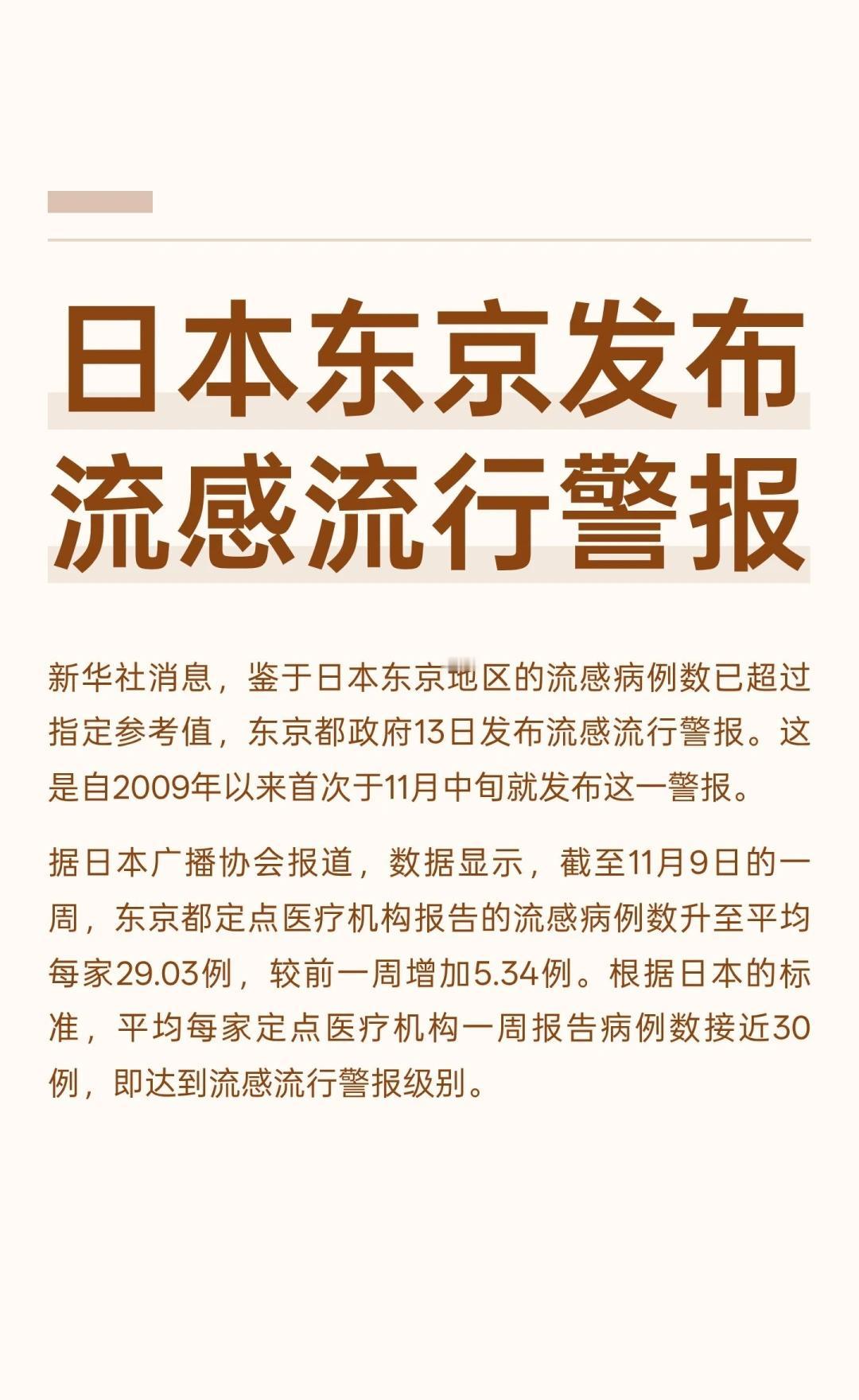 日本东京发布流感流行警报 东京都政府13日发布流感流行警报,这是2009年以来首次在11月中旬发布,因流感病例数已超过指定参考值,达到平均每家29.03例,较前一周增加5.34例。