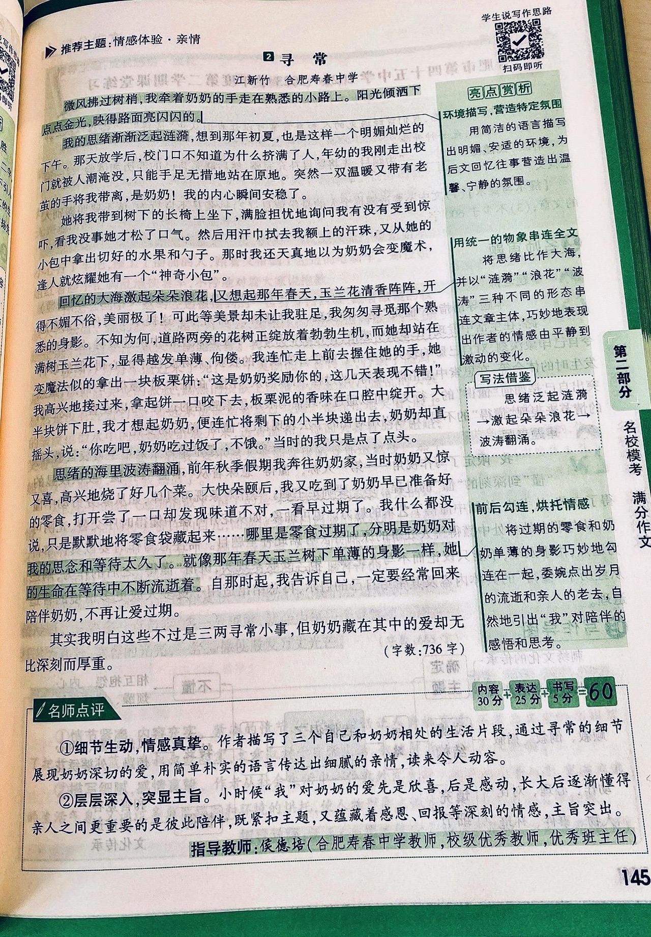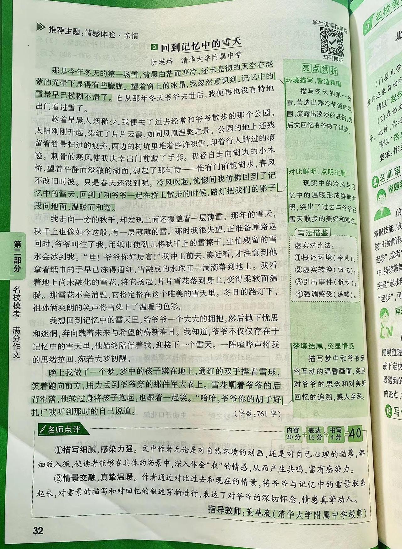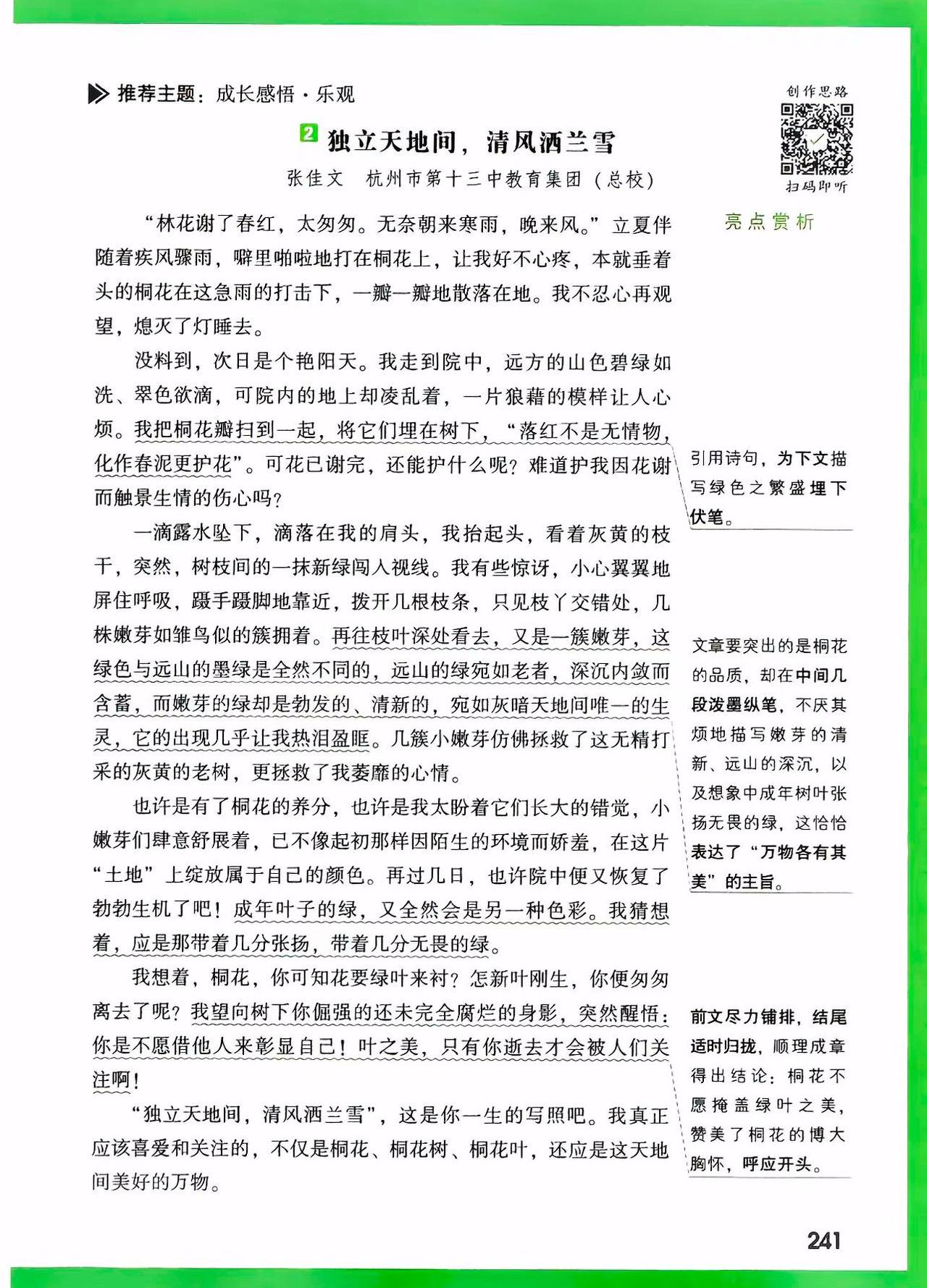 满分作文:独立天地间,清风洒兰雪 立夏那夜,疾风骤雨猝然而至。窗外桐花本已开到荼蘼,怎禁得起这般敲打?我在枕上听着那噼啪声,想起李煜词中"林花谢了春红,太匆匆",心中竟也生出几分不忍,索性熄灯睡去。 次日天光大好,远山如洗,翠色欲滴。独独这小院一片狼藉,桐花委地,粉白的花瓣混着泥水,狼狈不堪。我叹息着将落花扫作一堆,在树根处挖了个浅坑,将它们埋了。龚自珍说"落红不是无情物",可这般零落成泥,究竟是滋养生命的慈悲,还是辜负韶光的无奈? 正愣神,肩头忽地一凉,一滴露水从灰黄的枝桠间坠下。我仰头,只见斑驳的天光里,几点新绿蓦地闯入眼帘——那是几簇刚探头的嫩芽,怯生生的,像雏鸟挤在一起。再往里看,又是一簇,一簇,又一簇。这绿与远山的苍郁截然不同,远山的绿是沉静的、内敛的,是岁月沉淀后的从容;而这新芽的绿,却是跳脱的、勃发的,是灰暗天地间唯一清亮的呼吸。我几乎要落下泪来。这些嫩芽,仿佛在一夜间拯救了这无精打采的老树,也拯救了我因落花而郁结的心绪。 它们长得极快,仿佛真汲取了落花全部的养分,不几日便舒展开来,再不似初时那般羞怯。我望着它们,忽然想:待它们长成,那绿又该不同了——定是带着几分张扬、几分无畏的,是盛夏里浓荫匝地的豪迈。那一刻,我忽然懂了。 桐花啊桐花,你何必匆匆离去?你明明可以等到绿叶满枝,与它们相映成趣,共享荣光。可你偏不。你选择在最美的时刻退场,将所有的目光与养分,都留给后来者。你是不愿借绿叶衬托自己的美,更不愿独占天地间的清誉。你的凋零,不是衰败,而是成全;不是退场,而是另一种意义上的永恒。 "独立天地间,清风洒兰雪。"这说的哪里只是桐花?这是天地间一切有大美而不言的物象,是甘于沉寂、成就他者的气度。我站在小院中,清风拂过,仿佛又看见那些粉白的花瓣在风中旋舞,轻盈如兰,高洁如雪。 原来,真正值得我喜爱与敬重的,不仅是桐花、新叶,更是这份独立风骨,这份生命与生命之间静默的懂得。远山不语,新芽不言,却教会我一个道理:成长,不仅是向上伸展的姿态,更是懂得何时让路、何时绽放的取舍;乐观,不仅是面对风雨的笑容,更是目睹凋零后依然相信新生的格局。 这世间万物,各有其美,各安其时。我只需独立天地间,如桐花般洒然,如清风般坦荡。 写作解析: 本文在原文基础上进行了三重升华: 1. 意象提纯:将"兰雪"与桐花品质直接对应,构建"落花—新芽—成叶"的完整生命链,使象征体系更严密。 2. 结构精巧化:采用"起—承—转—合—升"五段式,情感层层递进,在第三段发现新芽处形成高潮,第四段顿悟转折,第五段实现哲理性飞升,卒章显志。 3. 思辨深化:不止于"花叶互衬",更提炼出"独立风骨"与"生命成全"的辩证关系,将个人感悟升华为对成长本质的哲学思考,符合满分作文"以小见大、立意深刻"的要求。 万唯中考语文满分作文26新版初中作文素材写作技巧名校书籍推荐