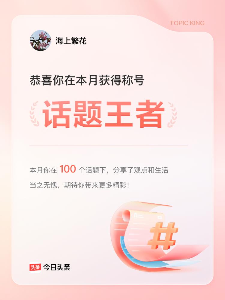 不打开后台,我都不知道原来我这么厉害呀,差点把我吓了一跳。 原来很多东西都隐藏在潜意识里面的,就像这个话题王者,我原来一直认为我没有这个能力,我在头条,我不可能发表那么多的讨论,我不可能有那么多的话题,谁知道当我潜意识里一定要做到的时候,真的可以啊,人的潜意识里很多东西都能激发出来,只要你觉得你一定行,只要你认为你一定要去做,那么一定就可以的,就像我这一期,我从来都没有想过我能发表那么多的话题,因为我平常创作的时候,我总是找不到灵感,我不知道怎么下笔,当我没有灵感的时候,我就去串门,我就去和朋友们互动一串门,我的话题就来了,我的灵感就来了,其实不是我有灵感,不是我有话题,是串门的时候,朋友们给我带来的话题。 以后有事没事,我们真的要经常串串门,大家要经常互动一下,这样才能获得双赢,当我们互相串门的时候,话题不就来了吗?灵感不就来了吗?其实这就是我们常说的灵感,来源于生活,创作,来自于生活