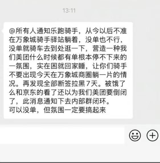 想不到吃个外卖都这么卷啊!美团 及 饿了么 骑手 被要求“营造订单不断的氛围”近期,几张美团以及饿了么内部群通知的截图在社交平台流传。通知内容要求骑手今后不得在骑手驿站“躺着”,即使没有订单也要“逛一下”,以“营造我们其平台订单根本停不下来的氛围”。发布者还表示,“被其他竞争平台看到了还以为其平台要倒闭了”,并反复强调“可以没单,但氛围一定要搞起来”。其中 美团 发布者还威胁,若再出现 骑手 在商圈集中躺一片的情况,将“全部断签、拉黑7天”。