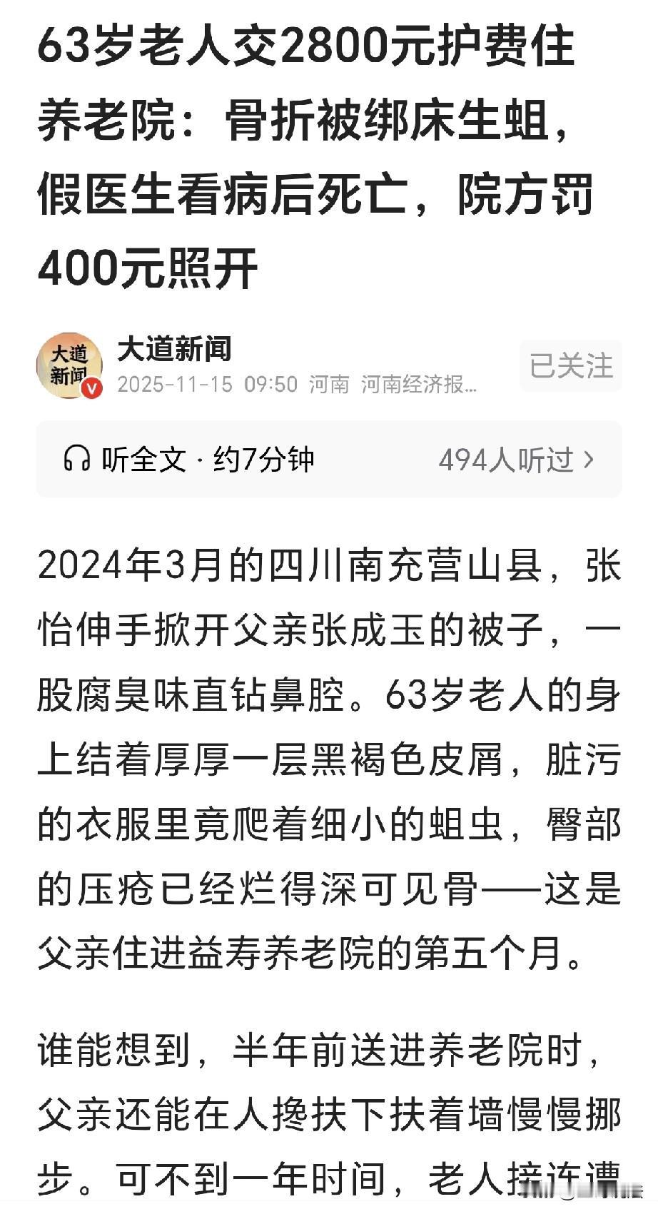 四川南充,一63岁大爷脑梗,儿子送他到养老院,每月护理费2800元,养老院自称医养结合,谁知老人骨折,养老院将他绑在床上,请来医生给他看病,一年之后,老人重度肺炎,败血症去世,儿子这才发现,医生是假的,没有执照,只是一位药房员工,儿子报警,又到法院起诉,但处理结果,令他难以接受。 张成玉63岁,2023年9月,他突发脑梗,被紧急送往了当地的医院。 可治疗之后,虽然命保住了,却留下了严重的后遗症。 他不能说话,右边胳膊和腿不听使唤,走路时得两个人同时搀扶,这样才能勉强往前一点点的移动。 偏偏这时,他唯一的儿子张怡也在住院,没人照看父亲,张怡急得满嘴起泡。 他四处打听,看哪里能够照料父亲,不久后得知,张成玉的战友在一家养老院当护理主任。 这家养老院是2023年6月才成立的,对外宣传得特别优秀,他们自称是公建民营,正规机构,有450张床位,还是医养结合的二级医院。 医院里面,开设有老年病科、js科,每天24小时都有值班人员。 不管是慢性病调理,还是突发急症,他们医院都能搞定。 张怡一听,这家养老院能够看病,那么父亲进去之后,肯定能得到很好的治疗和控制。 10月2日,张怡将父亲送入,入院前一周,医院给张成玉出具了诊断证明。 证明上白纸黑字: 患者语言功能受限,失语,右侧肢体活动功能障碍持续存在。 养老院没做任何评估,直接将张成玉收入,按照能自理的标准,每月收取2800元的费用。 可万万没有想到,3天之后,张怡接到了养老院电话,要他赶紧过去,说张成玉两天没有吃,腿也肿了。 张怡赶到养老院时,发现父亲腿部肿胀,他立刻送父亲到医院检查,发现张成玉右腿已经骨折。 张怡询问养老院主管徐某某,他支支吾吾,说他没看到老爷子摔跤,张怡要求调看监控,对方说监控调不出来。 张怡越发的怀疑,他找两位老人打听,老人告诉张怡,他成玉第一天晚上摔了一跤,养老院没送医救治。 徐某某却说,那俩老人失智,说的话不可信,10月3号吃晚饭时,她还看到张成玉在院子里抽烟。 谁知他第二天没去吃饭,护工这才发现张成玉脚肿,这才通知了张怡前来。 张怡拿出入院协议,协议里写着,老人自行活动跌倒,养老院只提供应急帮助,不承担法律责任。 可是张怡认为,既然养老院已经收取了费用,就该尽到照看责任。 现在老人摔了,养老院拖延送医,这是养老院的失职,谁知这时,更加奇怪的事情发生了。 养老院院长表示,他们是医养结合,的,能够治疗好老人的骨折。 养老院把张成玉接了回去,找来一位医生,张怡转给他420元医疗费。 谁知开发票时,张怡这才知道,这位医生只是某医院的药房员工,压根没有行医执照。 张怡去看望父亲,发现父亲被绑在床上,徐某某告诉他说,这样做是为了固定骨折。 张成玉老伴到养老院探望老伴,趁着护工不在,偷偷给张成玉松绑一会。 他们一直以为,这是给张成玉正常治疗,也没有掀开被子看一看老人的情况。 谁知张成玉身体越发的不好,2024年8月,张成玉高烧,他肺部感染,全身的器官开始衰竭。 张成玉被送往了医院,医生一看,感觉十分诧异,谁会把骨折的病人绑在床上? 这样会导致血液循环不畅,越绑身体就会越糟! 张怡这才发现,养老院根本没有医疗资质,所谓医养结合二级医院,全是他们招揽老人的幌子。 之后,那位假冒医生的药房员工,因无证行医,没收800元收入,罚款20000元 养老院因为虚假宣传,罚400元,处罚的理由: 广告内容表示不清楚。 2025年4月,张成玉去世,张怡以诈骗和非法行医为由报案,但警方以无犯罪事实,不予立案。 2025年5月,张怡告上了法院,两次庭审之后,法院以尸检结果未出,让张怡撤诉,要他等结果出来再重新立案。 养老院还在营业,2025年11月,记者联系养老院院长,对方宣称:我们是二级医院,医养结合,24小时有医护值班。 他还发来身着白大褂的人查房的视频,继续招揽重症老人入住。 张怡向卫健部门申请医疗事故分级认定,对方让他等领导回复,而那家养老院依旧在正常营业。 那么,这件事在法律上是怎么认定的呢? 养老院无医疗资质却宣称医养结合二级医院,能治慢性病、搞应急救治,属于虚假宣传,仅以“广告内容表示不清楚”罚款400元,处罚过轻。 药房员工无证行医,不仅应受行政处罚,还需对张成玉的健康损害承担民事赔偿责任。 《民法典》第1198条规定,宾馆、商场、养老机构等经营场所、公共场所的经营者、管 理者或者群众活动的组 织者,未尽到安全保障义务,造成他人损害的,应当承担侵权责任。 张成玉系重度失能老人,养老院未做护理评估即按自理老人收费,且未履行照看义务,导致其骨折后拖延送医。 后续又找假医生给予治疗,明显未尽安全保障义务,应对老人的损害及死亡承担主要侵权责任。 关注@王哥说法 多学法律少吃亏!