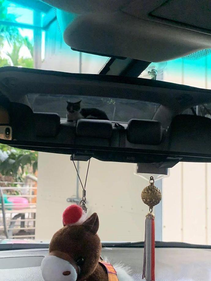 我没养猫,但是开车开到一半,突然发现后视镜里有只猫