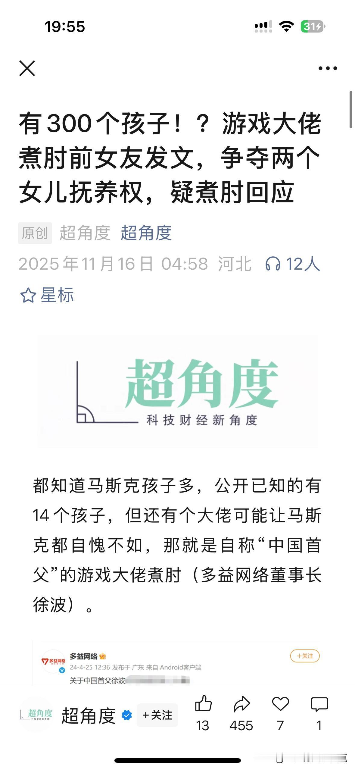多益网络徐波被前女友爆有300个孩子,这个太劲爆了。真是游戏人生。 徐波靠游戏赚钱,生育观也很游戏。如果前女友爆料是真的,就算少一个0,徐波这个孩子数量也是惊人的。就怕生容易,教育难。未来会怎样,不好说。