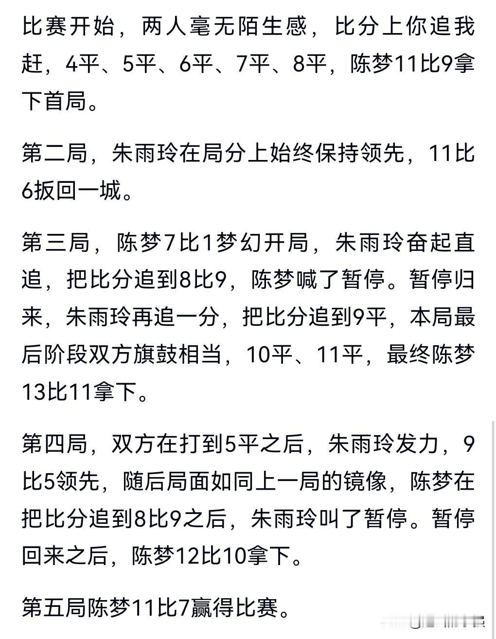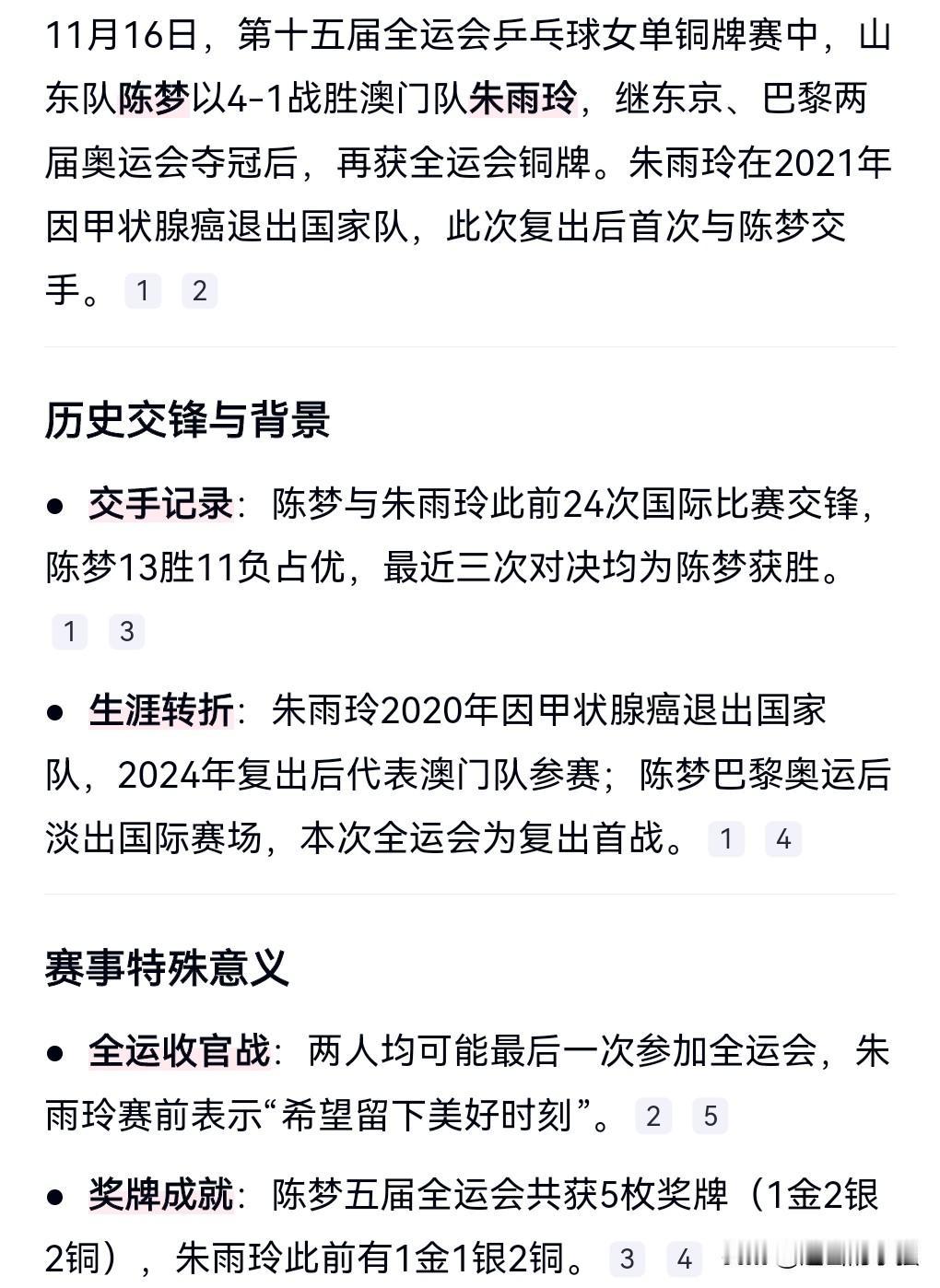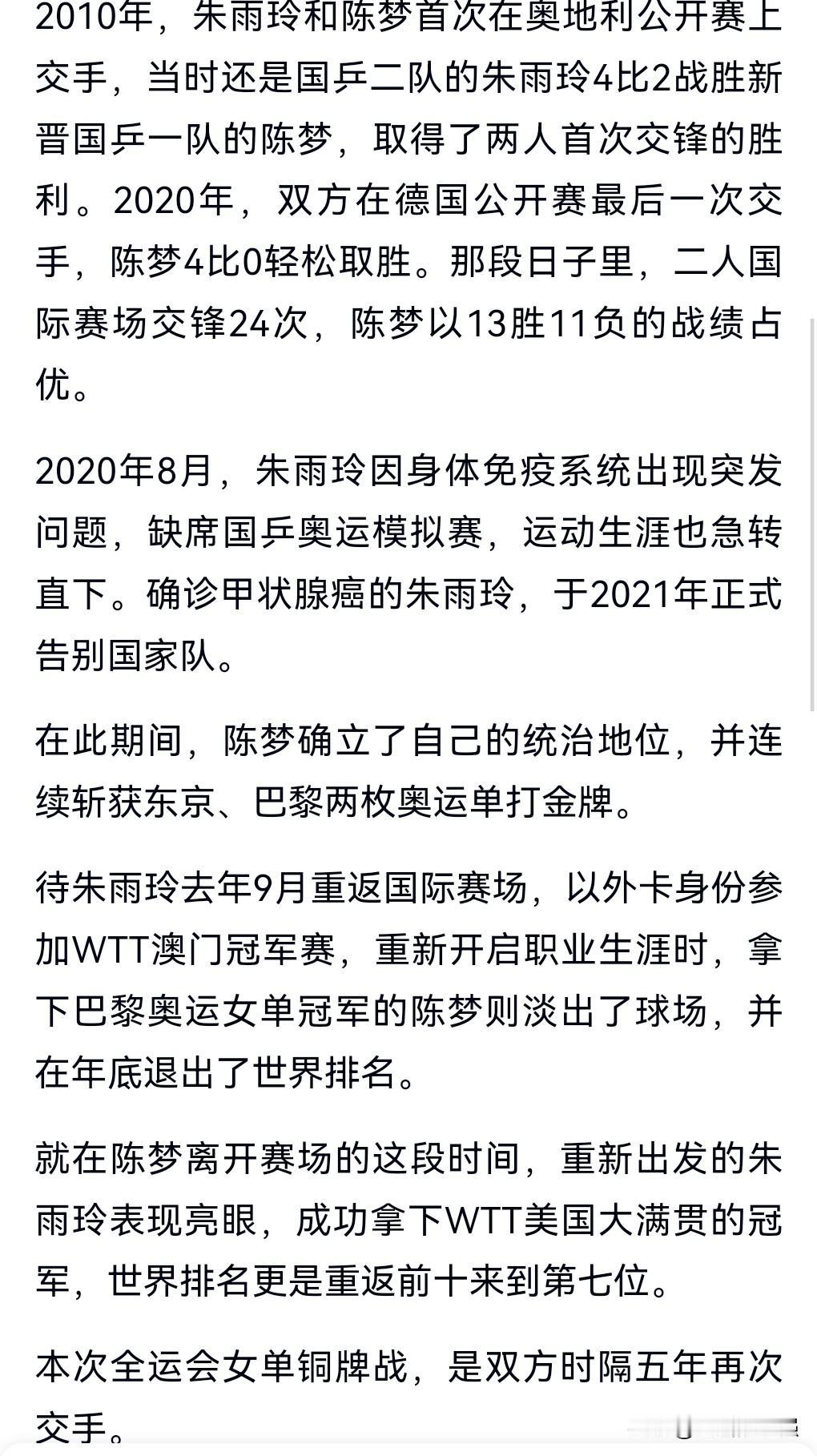 陈梦和朱雨玲那是老对手了,双方交战过很多次。 总的来说双方实力差不多,陈梦赢的多一点点。 11月16日,陈梦4比1战胜朱雨玲,获女单铜牌。 朱雨玲也是非常不容易。此前患了癌症,然后又重新返回赛场。 以前她们二人被称为“国乒女单双子星”。 感觉就像现在的孙颖莎和王曼昱一样。 数一数二啊。