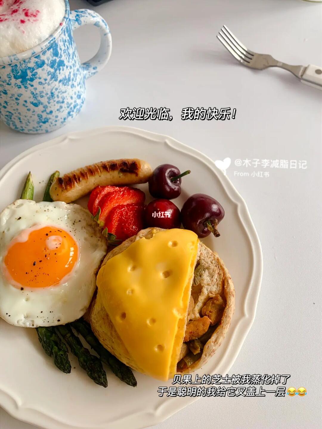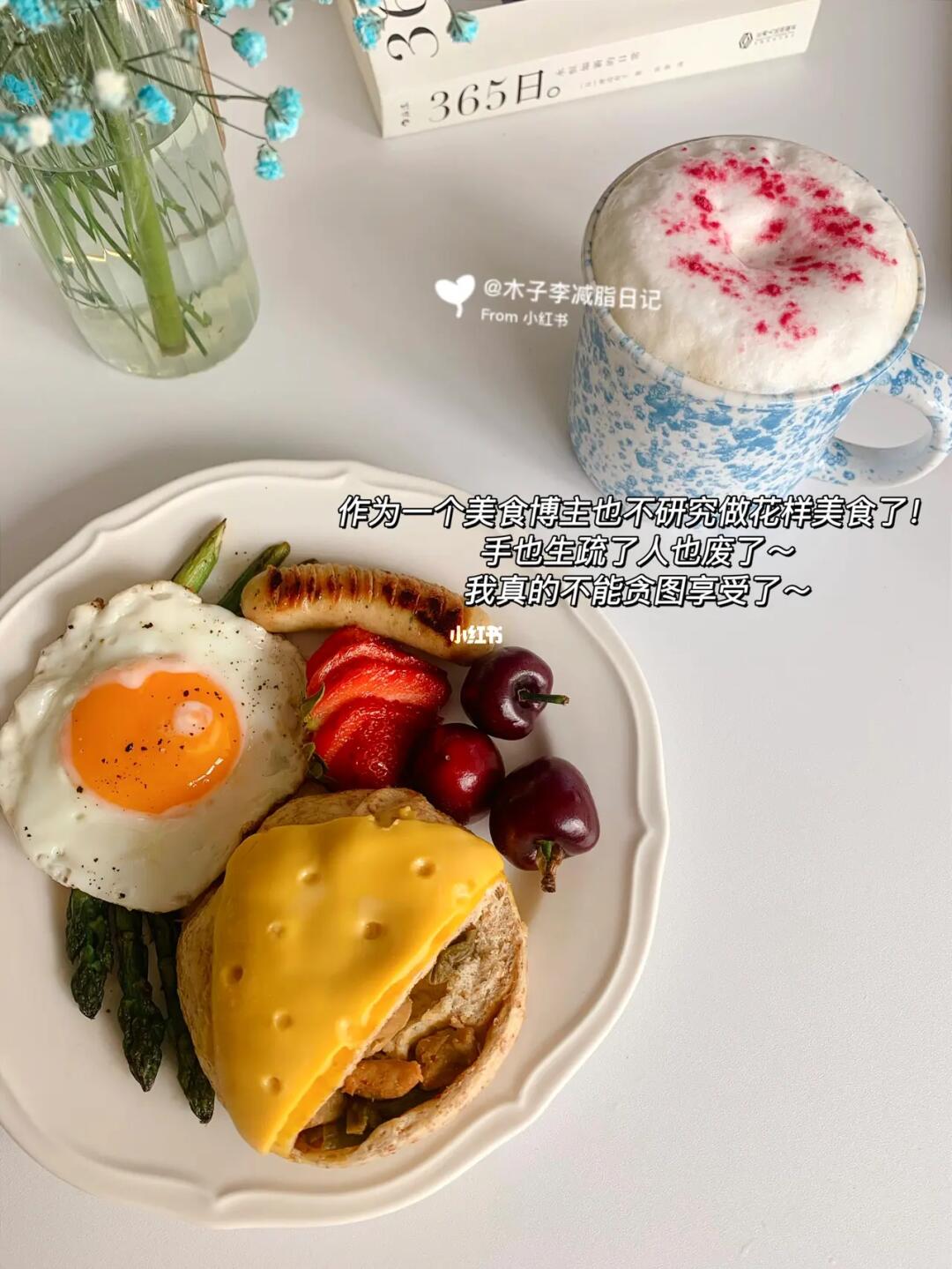 🍳早餐:芝士牛油豇豆贝果|煎芦笋|煎蛋|草莓🍓|车厘子|鸡肉肠|奶泡黑咖